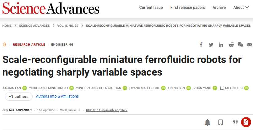 近日,苏州大学机电工程学院孙立宁教授、杨湛教授课题组,哈尔滨工业大学谢晖教授课题组以及德国马克斯普朗克智能系统研究所的Metin Sitti教授课题组,联合研制出能自由穿梭在极端变化环境中的尺度可调控磁液滴机器人SMFR(Scale-reconfigurable miniature ferrofluidic robots)。相关论文以“Scale-reconfigurable miniature ferrofluidic robots for negotiating sharply variable spaces(应用于剧变环境空间的尺度可调控磁液滴机器人)”为题目发表在国际综合类学术期刊《科学》子刊《Science Advances》,苏州大学为第一通讯单位。