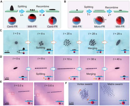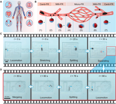 孙立宁教授表示,“SMFR的尺度调控则是通过液滴的分裂和融合实现的。通过在厘米尺度SMFR周围施加较强的磁场使得SMFR每个部分相互排斥,再加上其流动性就会产生分裂的效果变成毫米尺度SMFR。此外,为进一步分裂毫米尺度SMFR,团队还提出了基于旋转磁场的分裂策略,可以使得毫米尺度SMFR进一步分裂成微米尺度SMFR。小尺度的SMFR缩放到大尺度更为容易一些,可以直接利用SMFR的液体特性通过融合的方式实现。通过以上方法,可以实现SFMR从大到小以及从小到大的可控调控。”“我们致力于借助SFMR强大的变形能力和尺度自适应能力,将它应用到生物医疗应用中,通过在不同尺寸的组织间隙和人体腔道中自由航行,有望为实现体内靶向诊疗提供一种更高效有利的运载工具。”Metin Sitti教授总结道。