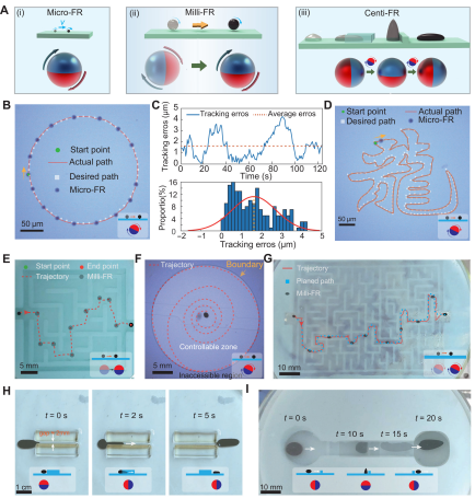 对于不同尺度的SMFR,研究人员有不同的控制策略。具体来说就是,对于微米尺度的SMFR,他们通过施加外部旋转磁场,让机器人滚动起来,这样机器人就会类似一个旋转的轮子能在基地上自由的滚动;对于厘米尺度SMFR,则采用磁梯度力拖拽的方式来控制机器人的运动,类似用磁体拖拽普通磁性物质,只不过在这里研究人员通过算法来实现机器人更高效率的运动控制。而对于毫米尺度的SMFR,他们则采取磁扭矩和磁梯度力结合的方式,以更高效的方式实现SMFR的运动控制。