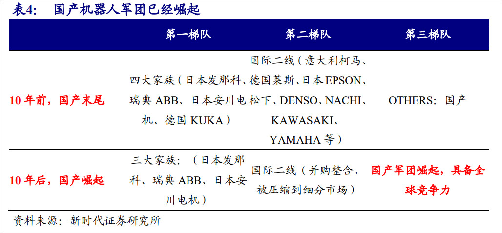 而瑞士巨头ABB也计划2021年在上海建成工业机器人工厂,总投资约10亿元。 去年2月,在中国政府的帮助和支持下,上海ABB工程有限公司顺利复工。新冠疫情之下,ABB多名高层表示,该公司长期看好中国智能制造市场前景,新工厂2021年投入运营的计划不变。 令人欣慰的是,最近10年里,虽然“四大家族”(发那科、ABB、安川电机、库卡)为代表的外企仍然占据优势,但在国内产业政策的支持下,借助行业高速增长,本土机器人行业已得到“跨越式发展”。 新时代证券的研报指出,2018-2019年的行业调整期,机器人国产化率得到持续提升。“中国基于持续的工程师红利和世界前列的人工智能技术优势,有望比肩发达国家,引领未来机器人产业的发展。” 新时代证券2020年3月研报截图 在排名前十的企业中,国内的埃斯顿占据一席,其余均是国际品牌。不过在第二档中,中国企业数量占优,前40名上榜企业中,本土企业合计占据22席,但市场份额占比仍不高,合计略超20%。 数据来源:MIR睿工业