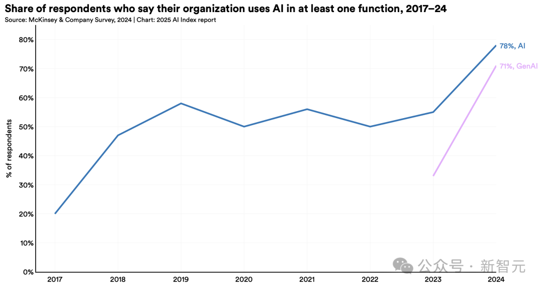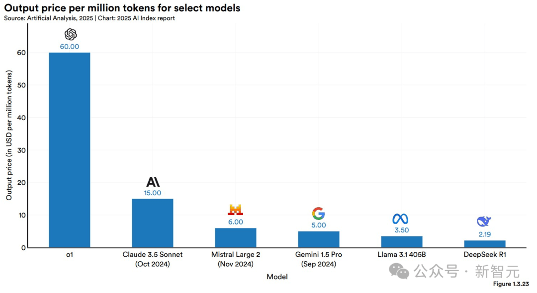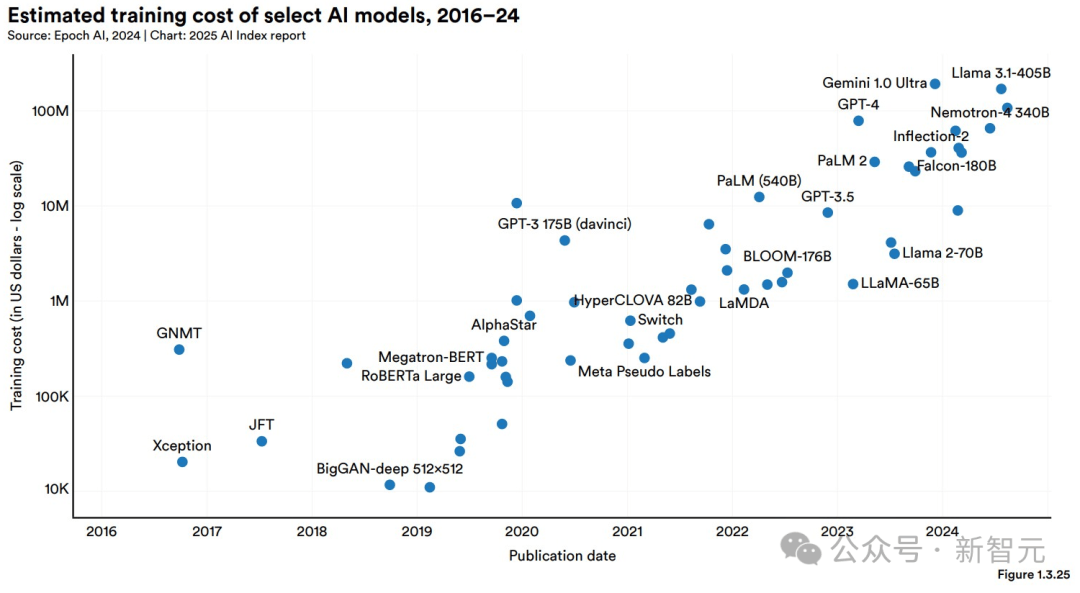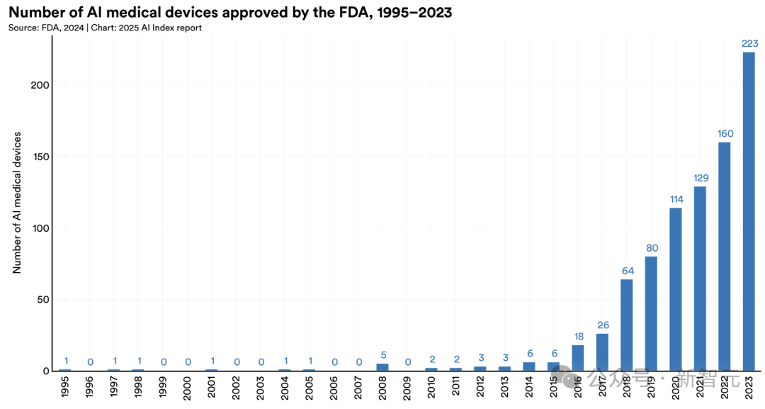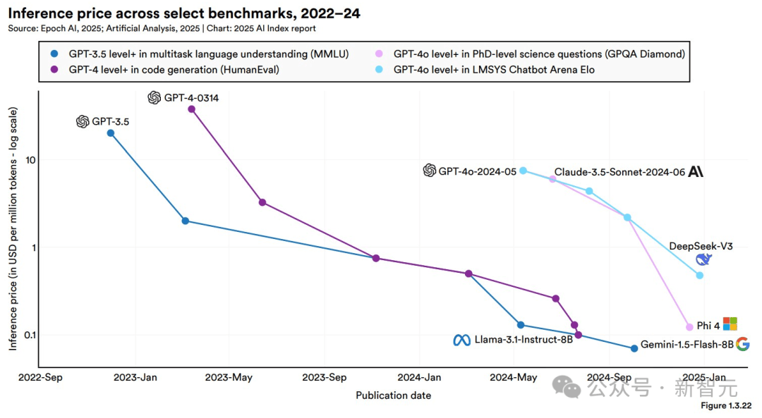 【新智元导读】 2025年斯坦福HAI报告重磅发布,456页深度剖析全球AI领域的最新趋势:中美顶级模型性能差距缩至0.3%,以DeepSeek为代表的模型强势崛起,逼近闭源巨头;推理成本暴降,小模型性能飙升,AI正变得更高效、更普惠。 就在刚刚,每年都备受瞩目的斯坦福AI指数报告,重磅发布了! 这份报告由斯坦福大学以人为本AI研究员发布,代表着每年AI领域最核心和前沿的动向总结。 今年,这份报告长达456页,抛出不少惊人观点。 比如,如今在2025年,中美顶级AI模型的性能差距已经缩小到了0.3%(2023年,这一数字还是20%),中国模型正在快速追赶美国的领先地位! 而DeepSeek领衔的开放权重模型,更是以1.7%之差,逼宫各大闭源巨头。前者和后者的差距,已经由2024年的8%,缩小至2025年的1.7%。 当然,目前从行业主导企业来看,美国仍然领先于中国。在2024年,90%的知名AI模型来自企业,美国以40个模型领先,中国有15个。 更明显的一个趋势,就是如今大模型的性能已经趋同!在2024年,TOP1和TOP10的模型的差距能有12%,但如今,它们的差距已经越来越小,锐减至5%。 十二大亮点 最新的斯坦福HAI两篇博文中,浓缩了2025年AI指数报告的十二大亮点。 1. AI性能再攀高峰,从基准测试到视频生成全面突破 2023年,研究人员推出了MMMU、GPQA和SWE-bench等新基准来测试先进AI系统的极限。 仅一年后,性能便大幅提升:AI在三项基准得分分别飙升18.8%、48.9%和67.3%。 不仅如此,AI在生成高质量视频方面取得重大突破,甚至,在某些场景下AI智能体甚至超越人类表现。 ·更有用智能体崛起 2024年发布的RE-Bench基准测试,为评估AI智能体复杂任务能力设立了严苛标准。 数据显示:在短期任务(2小时内)场景下,顶级AI系统的表现可达人类专家的4倍;但当任务时限延长至32小时,人类则以2:1的优势反超。 值得注意的是,AI已在特定领域,如编写特定类型代码,展现出与人类相当的专业水平,且执行效率更胜一筹。 2. 美国领跑顶尖模型研发,但中国与之差距逐渐缩小 2024年,美国产出40个重要AI模型,远超中国的15个和欧洲的3个。 然而,中国模型在性能上的差距正加速缩小:MMLU等基准测试中,中美AI差异从两位数缩小至近乎持平。 同时,中国在AI学术论文和专利申请量上持续领跑,中东、拉美和东南亚地区也涌现出具有竞争力的模型。 3. AI正变得高效且普惠,推理成本暴降280倍 随着小模型性能提升,达到GPT-3.5水平的推理成本在两年间下降280倍,硬件成本以每年30%的速度递减,能效年提升率达40%。 更令人振奋的是,开源模型性能突飞猛进,部分基准测试中与闭源模型的差距从8%缩至1.7%。 · 大模型使用成本持续走低,年降幅最高900倍 在MMLU基准测试中达到GPT-3.5水平(MMLU准确率64.8%)的AI模型调用成本,已从2022年11月的20美元/每百万token,骤降至2024年10月的0.07美元/每百万token(谷歌DeepMind的Gemini-1.5-Flash-8B模型),18个月内AI成本下降280倍。 视具体任务需求,LLM推理服务价格的年降幅可达9-900倍不等。 ·小模型性能显著提升,参数暴减142倍 2022年,在大规模多任务语言理解(MMLU)基准测试中,得分超60%的最小模型是 PaLM,参数量为5400亿。 到了2024年,微软Phi-3-mini仅用38亿参数,就取得了同样的实力。 这代表,两年多的时间里模型参数减少了142倍。 4. 科技巨头称霸AI前沿,但竞争白热化 2024年,近90%的重要模型源自企业,学术界则保持基础研究优势。 模型规模呈指数增长:训练算力每5个月翻番,数据集每8个月扩容一倍。 值得注意的是,头部模型性能差距显著缩小,榜首与第十名得分差已从11.9%降至5.4%。 5. AI逻辑短板,推理能力仍是瓶颈 采用符号推理方法的AI系统,能较好解决IMO问题(虽未达人类顶尖水平),但LLM在MMMU等复杂推理任务中表现欠佳,尤其不擅长算术推导和规划类强逻辑性任务。 这一局限影响了其在医疗诊断等高风险场景的应用可靠性。 6. 大厂ALL in AI,投资与采用率创双纪录 科技大厂们,正全力押注AI。 2024年,美国私营AI投资达1091亿美元,约为中国(93亿)的12倍、英国(45亿)的24倍。 生成式AI势头尤猛,全球私募投资达339亿美元(同比增18.7%)。 与此同时,企业AI采用率从55%升至78%。研究证实,AI不仅能提升生产力,多数情况下还可缩小劳动力技能差距。 更引人注目的是,将生成式AI应用于至少一项业务职能的企业数量激增——从2023年的33%跃升至去年的71%,增幅超一倍。 7. AI荣膺科学界最高荣誉,摘诺奖桂冠 2024年,两项诺贝尔奖分别授予深度学习理论基础(物理学)和蛋白质折叠预测(化学)研究,图灵奖则花落强化学习领域。 8. AI教育普及加速,但资源差距仍存 全球2/3国家已或计划开展K-12计算机科学教育,但非洲地区受限于电力等基础设施,推进缓慢。 美国81%的计算机教师认为AI应纳入基础课程,但仅47%具备相应教学能力。 9. AI正深度融入日常生活 从医疗到交通,AI正快速从实验室走向现实。 1995年,FDA批准了第一款AI赋能的医疗器械。 截至2024年8月,FDA已批准950款AI医疗设备——较2015年的6款和2023年的221款,增长迅猛。 而在自动驾驶领域,汽车已脱离实验阶段:美国头部运营商Waymo每周提供超15万次无人驾驶服务。 10. 全球AI乐观情绪上升,但地区差异显著 中国(83%)、印尼(80%)和泰国(77%)民众对AI持积极态度,而加拿大(40%)、美国(39%)等发达国家则相对保守。 值得关注的是,德国(+10%)、法国(+10%)等原怀疑论国家态度明显转变。 11. 负责任AI生态发展不均 虽然AI安全事件激增,但主流模型开发