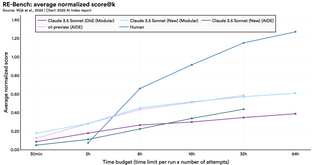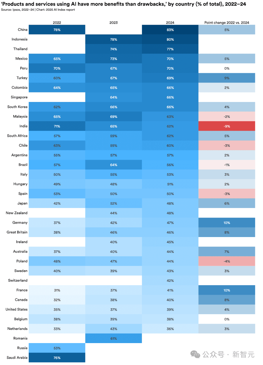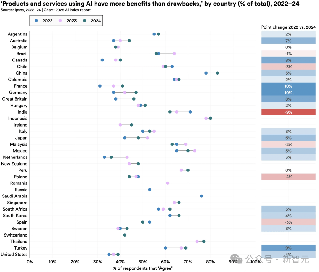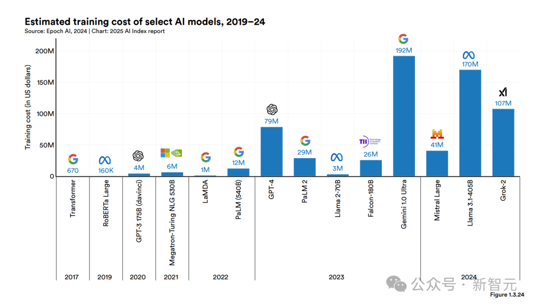 【新智元导读】 2025年斯坦福HAI报告重磅发布,456页深度剖析全球AI领域的最新趋势:中美顶级模型性能差距缩至0.3%,以DeepSeek为代表的模型强势崛起,逼近闭源巨头;推理成本暴降,小模型性能飙升,AI正变得更高效、更普惠。 就在刚刚,每年都备受瞩目的斯坦福AI指数报告,重磅发布了! 这份报告由斯坦福大学以人为本AI研究员发布,代表着每年AI领域最核心和前沿的动向总结。 今年,这份报告长达456页,抛出不少惊人观点。 比如,如今在2025年,中美顶级AI模型的性能差距已经缩小到了0.3%(2023年,这一数字还是20%),中国模型正在快速追赶美国的领先地位! 而DeepSeek领衔的开放权重模型,更是以1.7%之差,逼宫各大闭源巨头。前者和后者的差距,已经由2024年的8%,缩小至2025年的1.7%。 当然,目前从行业主导企业来看,美国仍然领先于中国。在2024年,90%的知名AI模型来自企业,美国以40个模型领先,中国有15个。 更明显的一个趋势,就是如今大模型的性能已经趋同!在2024年,TOP1和TOP10的模型的差距能有12%,但如今,它们的差距已经越来越小,锐减至5%。 十二大亮点 最新的斯坦福HAI两篇博文中,浓缩了2025年AI指数报告的十二大亮点。 1. AI性能再攀高峰,从基准测试到视频生成全面突破 2023年,研究人员推出了MMMU、GPQA和SWE-bench等新基准来测试先进AI系统的极限。 仅一年后,性能便大幅提升:AI在三项基准得分分别飙升18.8%、48.9%和67.3%。 不仅如此,AI在生成高质量视频方面取得重大突破,甚至,在某些场景下AI智能体甚至超越人类表现。 ·更有用智能体崛起 2024年发布的RE-Bench基准测试,为评估AI智能体复杂任务能力设立了严苛标准。 数据显示:在短期任务(2小时内)场景下,顶级AI系统的表现可达人类专家的4倍;但当任务时限延长至32小时,人类则以2:1的优势反超。 值得注意的是,AI已在特定领域,如编写特定类型代码,展现出与人类相当的专业水平,且执行效率更胜一筹。 2. 美国领跑顶尖模型研发,但中国与之差距逐渐缩小 2024年,美国产出40个重要AI模型,远超中国的15个和欧洲的3个。 然而,中国模型在性能上的差距正加速缩小:MMLU等基准测试中,中美AI差异从两位数缩小至近乎持平。 同时,中国在AI学术论文和专利申请量上持续领跑,中东、拉美和东南亚地区也涌现出具有竞争力的模型。 3. AI正变得高效且普惠,推理成本暴降280倍 随着小模型性能提升,达到GPT-3.5水平的推理成本在两年间下降280倍,硬件成本以每年30%的速度递减,能效年提升率达40%。 更令人振奋的是,开源模型性能突飞猛进,部分基准测试中与闭源模型的差距从8%缩至1.7%。 · 大模型使用成本持续走低,年降幅最高900倍 在MMLU基准测试中达到GPT-3.5水平(MMLU准确率64.8%)的AI模型调用成本,已从2022年11月的20美元/每百万token,骤降至2024年10月的0.07美元/每百万token(谷歌DeepMind的Gemini-1.5-Flash-8B模型),18个月内AI成本下降280倍。 视具体任务需求,LLM推理服务价格的年降幅可达9-900倍不等。 ·小模型性能显著提升,参数暴减142倍 2022年,在大规模多任务语言理解(MMLU)基准测试中,得分超60%的最小模型是 PaLM,参数量为5400亿。 到了2024年,微软Phi-3-mini仅用38亿参数,就取得了同样的实力。 这代表,两年多的时间里模型参数减少了142倍。 4. 科技巨头称霸AI前沿,但竞争白热化 2024年,近90%的重要模型源自企业,学术界则保持基础研究优势。 模型规模呈指数增长:训练算力每5个月翻番,数据集每8个月扩容一倍。 值得注意的是,头部模型性能差距显著缩小,榜首与第十名得分差已从11.9%降至5.4%。 5. AI逻辑短板,推理能力仍是瓶颈 采用符号推理方法的AI系统,能较好解决IMO问题(虽未达人类顶尖水平),但LLM在MMMU等复杂推理任务中表现欠佳,尤其不擅长算术推导和规划类强逻辑性任务。 这一局限影响了其在医疗诊断等高风险场景的应用可靠性。 6. 大厂ALL in AI,投资与采用率创双纪录 科技大厂们,正全力押注AI。 2024年,美国私营AI投资达1091亿美元,约为中国(93亿)的12倍、英国(45亿)的24倍。 生成式AI势头尤猛,全球私募投资达339亿美元(同比增18.7%)。 与此同时,企业AI采用率从55%升至78%。研究证实,AI不仅能提升生产力,多数情况下还可缩小劳动力技能差距。 更引人注目的是,将生成式AI应用于至少一项业务职能的企业数量激增——从2023年的33%跃升至去年的71%,增幅超一倍。 7. AI荣膺科学界最高荣誉,摘诺奖桂冠 2024年,两项诺贝尔奖分别授予深度学习理论基础(物理学)和蛋白质折叠预测(化学)研究,图灵奖则花落强化学习领域。 8. AI教育普及加速,但资源差距仍存 全球2/3国家已或计划开展K-12计算机科学教育,但非洲地区受限于电力等基础设施,推进缓慢。 美国81%的计算机教师认为AI应纳入基础课程,但仅47%具备相应教学能力。 9. AI正深度融入日常生活 从医疗到交通,AI正快速从实验室走向现实。 1995年,FDA批准了第一款AI赋能的医疗器械。 截至2024年8月,FDA已批准950款AI医疗设备——较2015年的6款和2023年的221款,增长迅猛。 而在自动驾驶领域,汽车已脱离实验阶段:美国头部运营商Waymo每周提供超15万次无人驾驶服务。 10. 全球AI乐观情绪上升,但地区差异显著 中国(83%)、印尼(80%)和泰国(77%)民众对AI持积极态度,而加拿大(40%)、美国(39%)等发达国家则相对保守。 值得关注的是,德国(+10%)、法国(+10%)等原怀疑论国家态度明显转变。 11. 负责任AI生态发展不均 虽然AI安全事件激增,但主流模型开发