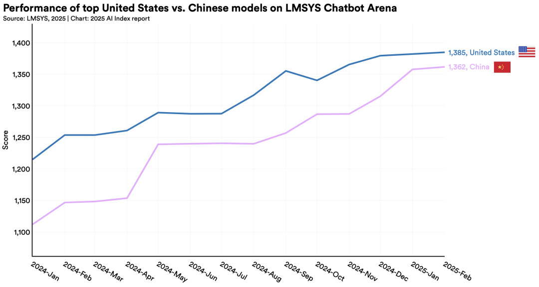 斯坦福2025 AI指数出炉!中美AI终极对决差距仅剩0.3%,DeepSeek领衔