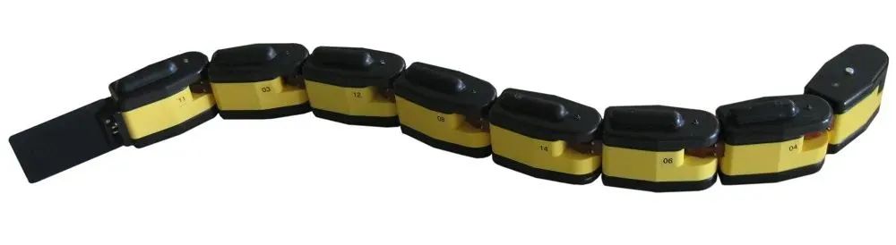 AmphiBot机器人 AmphiBot机器人实现水下运动是靠中央模式生成器(central pattern generator,CPG)来实现。CPG是一种神经回路(一种生物体模式)序列,会产生像鳗鱼类动物运动时出现振荡节奏。 02/模块化设计实现机器人水动力感应 AgnathaX机器人是由驱动关节连接的刚体节段组成,每一刚体节段都带有独立的电路(包括振荡器和耦合器)、左右对抗肌和一对侧向力学传感器。 该机器人的核心由10个伺服电机组成,配有一台Linux计算机、一个电池和一个被动尾部模块。 研究人员组装AgnathaX机器人时,先将机器人核心部件放入防水泳衣中;然后将力学传感器模块通过磁铁从外部固定,这些模块通过电气连接(电力和通信)到相邻的模块,最后与机器人头部相连;最后在每个模块顶部安装一个带有嵌入式LED的、用于运动跟踪的浮动元件。 其中力学传感器模块由通信电路、带有相应放大器的测压元件和纤维板组成,可以实现机器人的水动力感应。