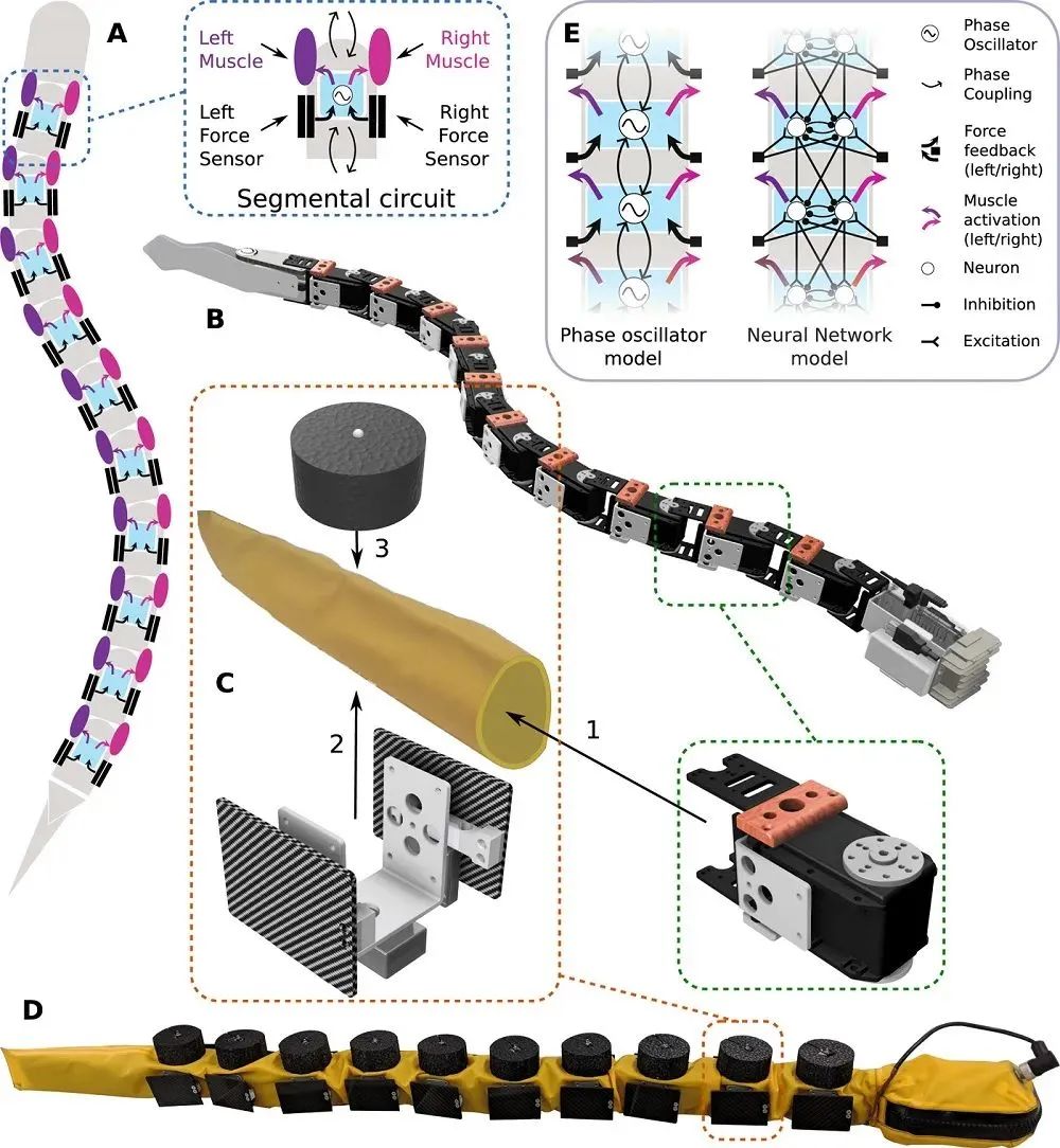 该研究论文题目为《基于局部水动力传感的鲁棒自组织波动游动的出现(Emergence of robust self-organized undulatory swimming based on local hydrodynamic force sensing)》,于8月11日发表在Science Robotics上。 01/原有游泳机器人依靠中央系统控制 在设计、研究游泳机器人推进系统过程中,洛桑联邦理工学院研究人员对鳗鱼在水中感知周围流体的能力产生了兴趣,也就是鳗鱼在水中游动时身体感受到的压力状况。 一些鳗鱼类动物要完成波浪式起伏运动,需要靠其神经系统中的脊髓来控制,以及一组被称为神经振荡器(neural oscillators)的神经元来产生相应的有节奏的肌肉活动。除中央神经系统外,动物身体上还会有一些外周神经系统,由感觉神经元组成,向中枢神经提供身体和环境状态的信息。 由于在活体动物上进行实验较难,因此研究人员设计了一种名为AgnathaX的机器人。