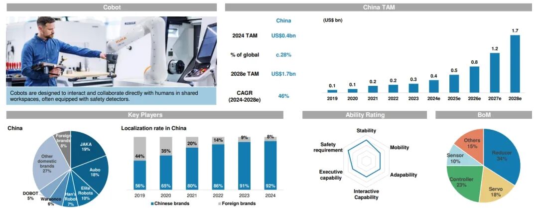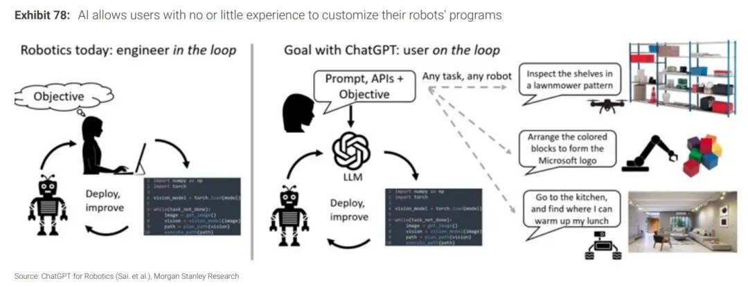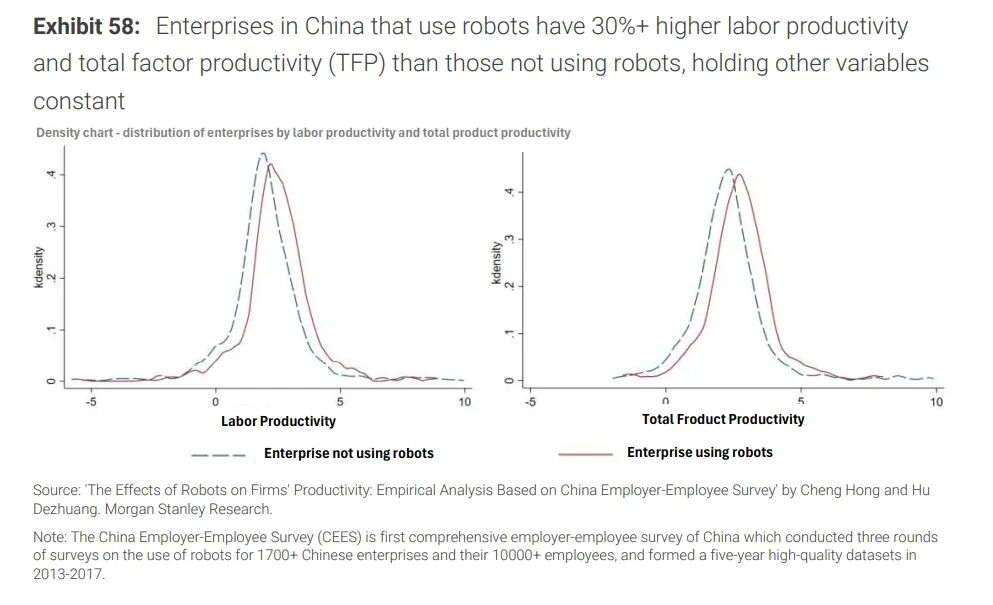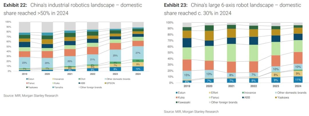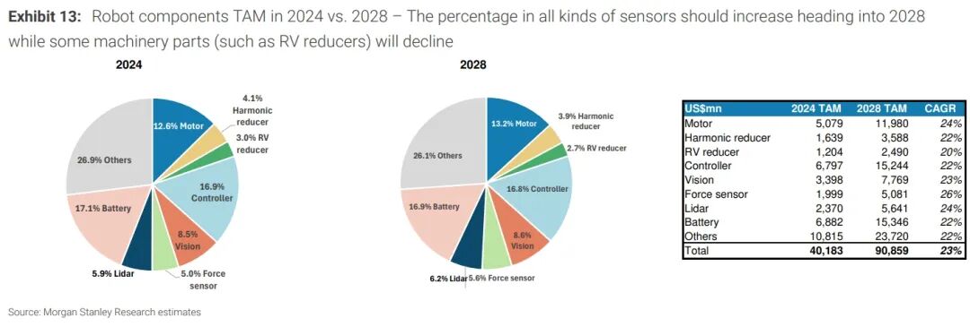 在大摩看来,中国正在引领全球机器人产业的新一轮变革。 据追风交易台消息,摩根士丹利分析师在6月17日的报告中表示,中国不仅是全球最大的机器人市场,也是全球55%机器人产品的生产基地。2024年中国机器人市场规模达到470亿美元,占全球总量的40%。 分析师预计到2028年,整体市场规模将增至1080亿美元,年复合增长率达23%。这一增长主要由无人机、移动机器人和协作机器人驱动,其年复合增长率分别达到20%、35%和46%。电机、电池、传感器和视觉系统等关键部件将成为最具增长潜力的投资标的,其中传感器和视觉系统有望实现最快增长。 中国缘何成为全球最大机器人市场在大摩分析师看来,中国机器人市场的主导地位并非偶然,而是多重因素共同作用的结果。 首先是劳动力结构的根本性变化推动了自动化需求的激增。生产者价格指数与消费者价格指数出现持续背离,制造商难以将成本上涨转转移。这种结构性矛盾迫使中国制造业加速采用机器人技术。 数据显示,中国制造业机器人密度从2017年的97台/万人飙升至2023年的470台/万人,增长了4.8倍。更重要的是,中国企业在应用机器人后,劳动生产率和全要素生产率均比未使用机器人的企业高出30%以上。每当企业人均机器人数量翻倍,劳动生产率和全要素生产率就分别提升11%和8%。 技术创新和供应链优势进一步巩固了中国的市场地位。 中国已建立了从设计到组装的完整供应链体系,实现了关键零部件的规模化本土化生产。在工业机器人领域,中国品牌市场份额从2019年的28%提升至2024年的51%。在移动机器人、服务机器人和无人机等新兴领域,中国品牌的本土化率更是达到90%以上。 产业结构分化与增长动力中国机器人市场呈现明显的结构性分化特征。 传统工业机器人虽然仍占重要份额,但增长相对温和,预计2025-28年复合增长率为18%。真正的增长引擎来自新兴机器人类型:协作机器人年复合增长率达46%,移动机器人为35%,服务机器人为25%。 无人机市场表现尤为突出,2024年中国市场规模达190亿美元,预计2028年将达400亿美元,成为机器人市场中最大的单一品类,占总市场份额近40%。这一增长主要由军用和民用双重需求驱动,其中民用无人机在农业、测绘、巡检等领域的应用正在快速扩展。 协作机器人的快速增长反映了制造业向柔性化生产的转型需求。与传统工业机器人相比,协作机器人具有更高的安全性和灵活性,能够与人类共同工作,特别适合中小企业和多品种小批量生产场景。中国协作机器人品牌已占据全球市场60%以上的份额,并正在向海外市场快速扩张。 供应链机遇与投资价值链大摩认为,机器人产业链的投资机遇集中在两个维度:市场增长和本土化替代。 2024年中国机器人零部件市场总规模达400亿美元,预计2025-28年复合增长率为23%。其中,电机和电池将成为最大的细分市场,到2028年分别占总材料成本的13%和17%。 从增长潜力看,传感器和视觉系统展现出最强的增长动能。随着机器人向智能化和自主化方向发展,力传感器、激光雷达、3D视觉等高价值电子元件的需求将快速增长。力传感器预计复合增长率达26%,激光雷达为24%,视觉系统为23%。 本土化进程为国内供应商创造了巨大的市场替代空间。目前中国机器人供应链本土化率存在显著差异:电池和激光雷达本土化率最高,超过90%;视觉传感器和电机本土化率约为55%;而谐波减速器和RV减速器的本土化率相对较低,分别为70%和55%,仍有较大提升空间。 人形机器人虽然目前市场规模较小,但长期潜力巨大。 摩根士丹利预测,到2050年全球人形机器人市场规模将达到5万亿美元。中国预计到2030年将拥有25.2万台人形机器人,2050年达到3.02亿台,占全球存量的30%。人形机器人的材料成本构成更加复杂,传感器占比高达31%,电机占19%,为相关供应商带来新的增长机遇。 技术演进推动应用边界扩展大摩表示,人工智能技术的融合正在重新定义机器人的应用边界。 传统的机器人需要复杂的编程和专业的集成团队,现在通过"无代码"编程和大语言模型的应用,大大降低了部署门槛。ABB推出的图形化拖拽编程界面可以节省99.96%的编程时间,同时将循环时间缩短48%,能耗降低36%。 数字孪生技术的应用进一步优化了机器人的部署效率。通过虚拟环境中的仿真测试,企业可以在实际部署前优化机器人的运动路径和工作流程,减少物理测试的时间和成本。KION集团利用NVIDIA的数字孪生平台测试多机器人协作,在虚拟环境中验证后再进行实际部署。 机器人协作能力的提升开启了无人化工厂的可能性。现代机器人不再是独立工作的设备,而是能够相互协调、动态调度任务的智能系统。自主移动机器人车队可以同时协调数千台设备,人形机器人可以与不同类型的机器人协作完成复杂任务。这种协作能力的提升将机器人的应用从单一工序扩展到整个生产流程。 成本持续下降是推动机器人普及的关键因素。协作机器人的平均售价从2016年的15.7万元人民币下降至2024年的8.9万元,预计2028年将进一步降至5.8万元。智能焊接机器人的售价也从2022年的25万元下降至预计2030年的12.7万元。这种成本下降趋势源于核心零部件成本的降低、设计优化、竞争加剧和规模经济效应。 文章来源:华尔街见闻 |