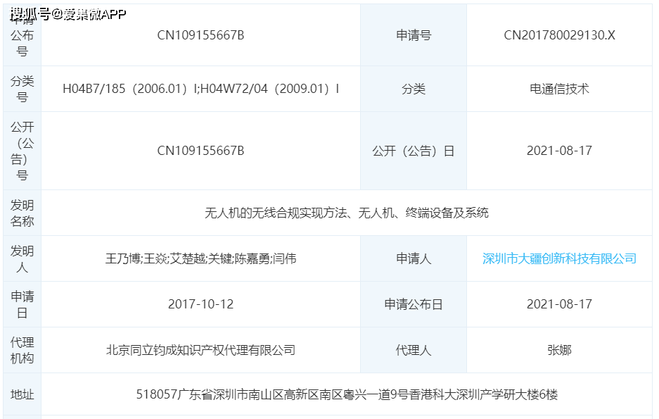 深圳市大疆创新科技有限公司近日新增多条专利信息,其中一条名称为“无人机的无线合规实现方法、无人机、终端设备及系统”,公开号为CN109155667B。