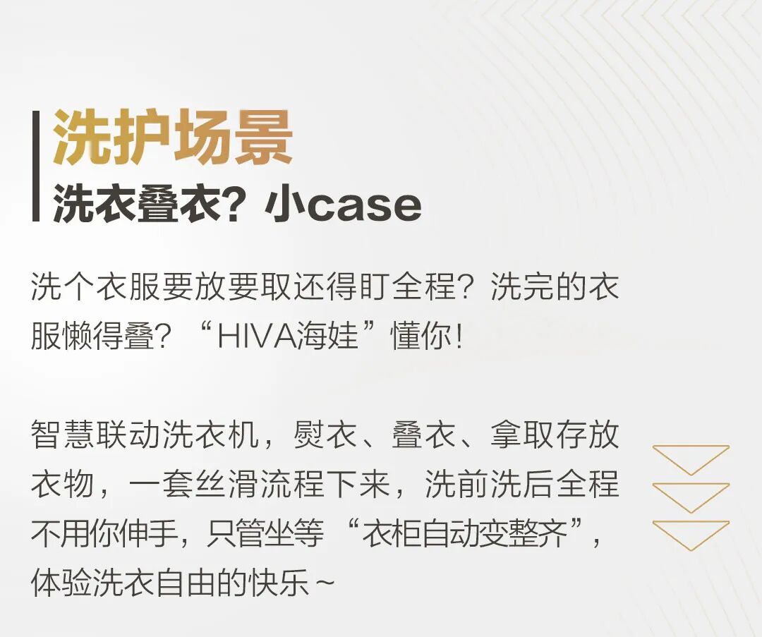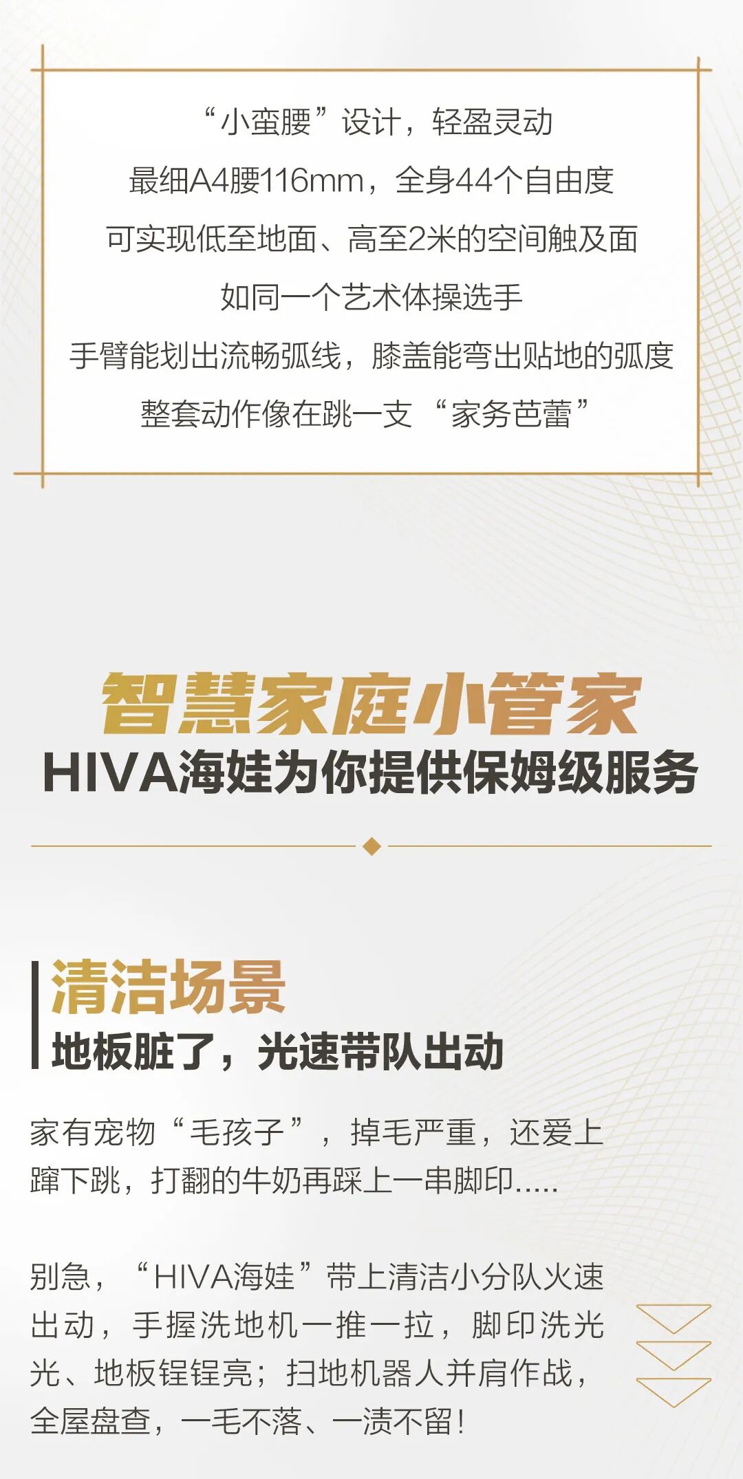 ,是一款保姆机器人产品,可实现低至地面、高至 2 米的空间触及面。“HIVA 海娃”采用底座移动方式,灵巧手可以使用洗地机、做饭;还能智慧联动洗衣机,熨衣、叠衣、拿取存放衣物等。