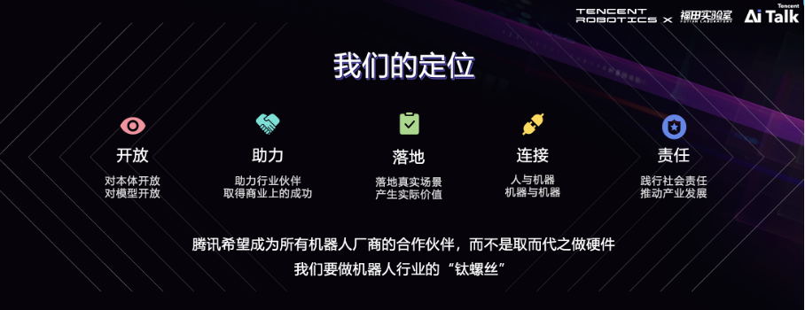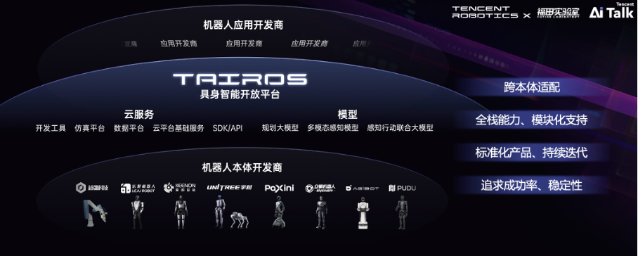 7月27日,腾讯 Robotics X 实验室与福田实验室联合发布具身智能开放平台 Tairos “钛螺丝” ,腾讯首席科学家、Robotics X 实验室主任、福田实验室主任张正友在会上作了《未来已来,从神话巨人到具身智能》的主题演讲,阐述了为何推出具身智能平台、新平台“钛螺丝”的目标和使命以及具身智能行业发展的现状和未来发展趋势。Tairos平台可在官网申请试用:https://tairos.tencent.com/ 以下是演讲全文。 各位嘉宾,上午好!今天我想和大家分享《未来已来,从神话巨人到具身智能》。 正如大家最近感受到的,“具身智能”正成为全球科技竞争的高地。我研究人工智能和机器人技术已四十年,见证了人工智能和机器人这些年的不断进化。 然而当我们回溯历史,这项技术的梦想,远比我们想象的更古老。早在2700年前的古希腊,人类已经有了具身智能构想的萌芽Talos 。Talos是由工匠之神打造的青铜巨人,他不是一个简单的机械工具,而是已经拥有了自主意识。Talos被送给了克里特用来巡视、守卫领土,是最早的安保机器人。Talos虽然存在在神话中,却体现了人类对拥有机械智能体的渴望。这种渴望,从青铜锻造炉延续到今天的实验室。 2018年初,腾讯创始人马化腾做出了一个重要决定——成立腾讯Robotics X实验室。这张图的时间轴浓缩了我们实验室七年来的前沿探索足迹。 从2018年平衡自行车的动态控制,到2021年Max实现腿轮一体化的四足机器狗,再到2023年灵巧手操作和栩栩如生的运动步态,再到去年下半年的养老机器人原型小五——我们覆盖了操作、运动、感知、智能、硬件设计等机器人核心技术栈。通过这一系列的探索,让我们成为国内少有的具备全栈机器人技术能力的团队。 我们深刻理解机器人硬件与具身智能的共生关系。 软硬一体不是简单拼装,而是从传感器到大小脑再到执行器的系统级融合创新。 这种系统级融合创新的理念,就体现在上图左边的 SLAP 框架里。这是我早在2018年,也是在世界人工智能大会提出的,希望为“具身智能”描绘一个清晰的技术蓝图。 经过了这些年的持续探索和实践,腾讯Robotics X实验室的同事们不断打磨这个框架,现在已经进化形成了一个更完整、也更强大的核心技术体系,我们称之为 “SLAP3”体系。这里面核心是三个紧密结合的大模型 : 首先是规划大模型,相当于人的左脑。让机器人能理解复杂目标是什么,然后拆解成一个个可执行的策略步骤。比如陪行动不便的老人散步,需要先去拿轮椅,把老人抱到轮椅上,然后推轮椅。 接着是感知大模型,相当于人的右脑。它的作用就是让机器人真正了解自己所处的环境。比如说轮椅在什么地方。 还有就是感知行动联合大模型,相当于人的小脑。这个模型打通了从“看见”到“做到”的关键环节。比如在一个狭窄的过道里,推轮椅要安全避开其他行人和障碍物。 这种架构的优势在于它层次化、模块化,同时又能联合优化。不同功能的大模型可以相对独立地发展和更新,同时又能高效地协同工作、互相增强。 这是逐步将具身智能推向现实世界通用应用的关键路径——因为真正的智能机器人,不仅要理解我们的世界,更要能在这个世界里安全、稳定且高效地完成任务。 具身智能技术在不断迭代,国内外的新成果、新突破不断涌现,我判断未来还将在五个方向上持续发展,我们根据首字母总结为IDEAS: I 是 IPhD, 虚实集成世界。数字世界和真实世界正在深度融合,真实世界的信息被反映在虚拟世界中,经过运算,又返回到真实世界中,并对真实世界产生影响,这种结合越来越紧密。 D 是 Democratization,技术门槛降低。人和机器的交互从过去的机器语言,到高级编程语言,再到现在用我们人类自己的自然语言。这使得与机器打交道的门槛大大降低,男女老少都能轻松参与。 E 是 Evolving intelligence,智能演进。AI迎来爆发,未来智能、本体、环境三者之间的一体化互动将更加紧密,并不断演进提升,使AI更加通用和可靠,加速推动产业创新和个人效率。 A 是Agentization,智能体化。AI系统从被动演进到主动交互智能体,具备感知、规划、行动和学习能力。而且智能体将不再孤独,多智能体的交互协作将涌现出集体智能。 S 是Sensing multimodalization,感知多模态化。感知技术从单一视觉,变成视觉、触觉、力觉多模态融合,甚至加上嗅觉和味觉,为机器人提供更多信息。 相信技术会在不远的将来给我们带来惊喜,腾讯Robotics X实验室也会在这些方向上继续探索和落地,为具身智能融入社会做出贡献。 我们刚才提到了具身智能技术的飞速演进。国内的具身智能机器人产业,已经进入了一个快速的发展通道。 这背后的推动力是很扎实的:首先, 政策支持力度很大,方向很明确;其次,机器人的产业链相当完整非常高效;再者, 应用场景无论从数量还是质量上都呈现出巨大的潜力。这使得一批优秀的机器人企业迅速涌现出来。 社会各界迫切期待机器人在真实环境中能落地应用。例如,工厂车间对柔性生产、精准抓取与重复作业的需求;酒店、商场对于接待导览服务的需求;家庭场景下对智能陪伴、安全监护、家居操控乃至适老化日常起居辅助的需求。 然而,要真正满足这些多元场景的高标准、严要求,使具身智能走进千家万户与生产服务第一线,无论是核心技术的攻关,还是工程化落地的精进,我们仍需付出巨大努力。 大多数企业,在这个落