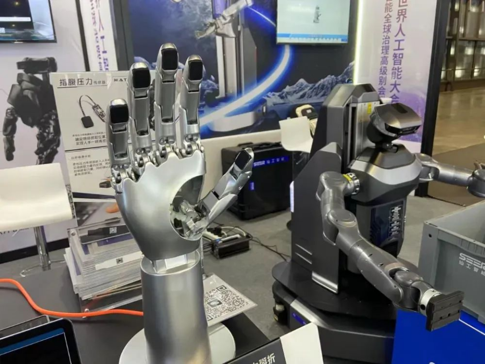 灵巧智能展示了5根手指和3根手指的产品。工作人员表示,3根手指产品更具性价比,能够完成大概80%的日常任务,而5根手指更加灵巧和逼真。现场还展示了,根据摄像头识别人手动作,并精确模仿到灵巧手上。