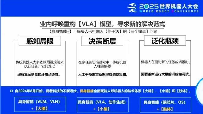 在世界机器人大会上,宇树CEO王兴兴一口气提了不少“非共识”。他对 VLA (Vision-Language-Action视觉-语言-动作)模型持怀疑态度, 认为这属于“相对傻瓜式架构”;他还说机器人行业对数据关注度有点太高了,包括灵巧手在内的硬件虽然不够好但够用,行业最大的问题在于具身智能的AI完全不够用。 王兴兴的观点在业内持续引发讨论。今日世界机器人大会上,记者留意到,国家地方共建人形机器人创新中心首席科学家江磊近20分钟的演讲中,3次提到了王兴兴。 对于王兴兴关于“硬件足够用、大模型不够用”的观点,江磊分享了与阿里、华为等企业交流的体会:“我们是选不到一个很好的身体”,并坦承今天行业确实还用不上全参数模型,机器人的大脑、小脑、肢体需要深度协同;王兴兴质疑VLA并尝试用视频生成驱动机器人任务,江磊承认“感知-认知-决策-执行的闭环尚未闭合”,呼吁重构VLA模型,寻求新的解决范式;王兴兴还提到,机器人在RL(强化学习)的Scaling law(尺度定律)是非常值得做的方向,江磊认同表示,强化学习跟模仿学习都需要进入Scaling law法则,让机器人足够泛化和聪明。 以争议中的VLA模型为例,它重构了人形机器人运动控制的范式,是不少具身智能从业者押注的路线方向。江磊以OPEN VLA为例,这是一个基于Llama2语言模型基础上的7B 参数的开源VLA,参数规模并不算大。即使是目前被认为最强的通用机器人控制VLA模型π0,也无法有效运用全参数的大型语言模型(LLM),同时对数据提出更高要求。 “为什么人形机器人用不上全参数模型?”江磊抛出问题,他提出的解决思路是:业界需要积极探索云端与终端(端侧)的算力协同分配,构建完整的“云网一端”的部署架构。 他强调,真正适用于人形机器人的“大脑”模型不应仅是大语言模型,而应是一个软硬件深度协同的完整系统。同样,VLA模型也不应简单等同于“小脑”。当前的技术研究呈现割裂状态:大语言模型研究者专注于大语言,而端侧智能则聚焦于小模型,两者尚未有效融合——大脑追平实际上只发挥了一半。 江磊进一步指出,目前传统的人形机器人面临感知局限、决策断层、泛化瓶颈三大核心挑战。例如,传统机器人大多依赖预设规则来执行任务,难以理解复杂多变的环境动态性;在多任务切换过程中,机器人往往需要人工干预来重新编程或调整策略;此外,机器人在面对新的任务或场景时,需要重新进行大量的训练和调试。 他用一句话总结道:当前的问题是“大脑模型不够大,小脑模型不够小,具身智能不是大脑加小脑”。理想的“大脑”需要完整参数模型的能力,而部署在机器人本体的“小脑”模型则需要在体积和实时性上实现突破。 此外,现在人形机器人基本上打造的是感知直接到执行,如何打造实现感知、决策与执行的闭环?江磊提到,业界呼唤重构VLA模型,寻求新的解决范式。他提出了一个前瞻性思考:通过生物仿生,有没有可能提出原创的具身智能基础模型? 尽管行业仍面临不少挑战,但江磊说,今年参加世界机器人大会给了自己最大的信心,就是几乎所有人从怀疑到确信人形机器人会成为未来的一个重要产业,因此今年也被很多人称作是人形机器人的量产元年。关键在于机制、理念、政策以及从业者的战斗力和创新力,能否真正推动人形机器人成为一个规模化、可落地的产业方向。 |