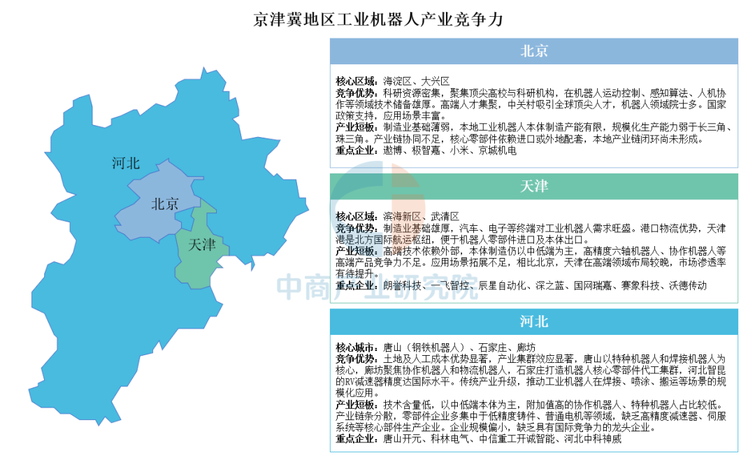 制造业基础雄厚,汽车、电子等终端产业对工业机器人需求旺盛,天津港的港口物流优势便于零部件进口与本体出口,但高端技术依赖外部,本体制造以中低端为主,高端产品竞争力不足,应用场景渗透率有待提升。重点企业有朗誉科技、一飞智控、赛象科技等。河北
