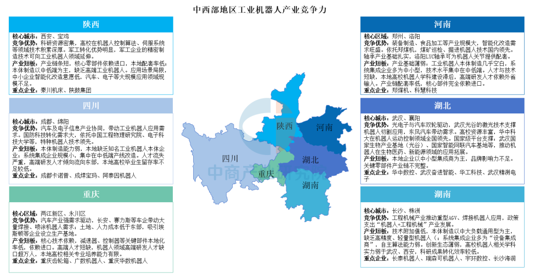 汽车产业(长安、赛力斯等)带动焊接、喷涂机器人需求,土地、人力成本低于东部,吸引企业设立生产基地,但核心技术依赖进口,高端人才缺口大。重点企业有重庆齿轮箱、广数机器人等。河南