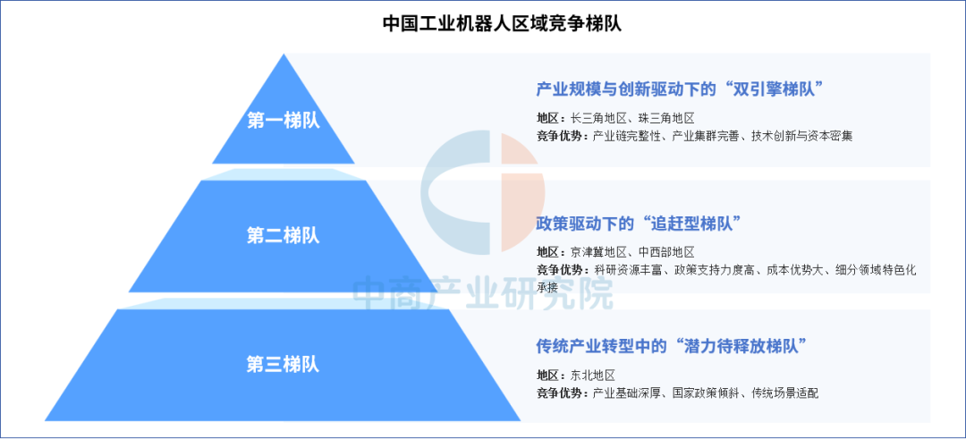 中国工业机器人区域竞争可划分为三大梯队,各梯队依托不同优势形成差异化发展态势: