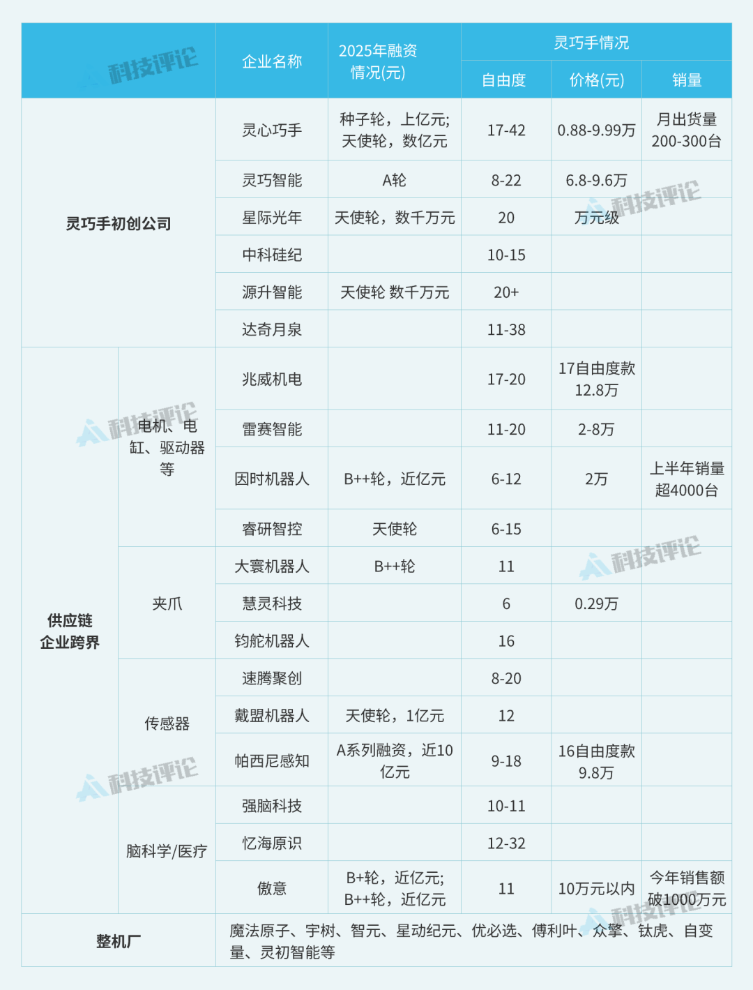 技术远未成熟,但价格鏖战已过早升级。 “关于灵巧手,你可以认为所有 demo 都是假的。一切都是过拟合的结果,自主完成任务的能力基本不存在。从业者和非从业者对技术进展的认知差距过大,需要一些可视化的东西来弥合这种鸿沟。”一位业内人士告诉AI科技评论。 这一说法后来得到了多方认同。放眼刚刚过去的 WAIC 和 WRC 两个大会,预编程仍是主流。 今年以来,具身智能的焦点突然从本体延伸至灵巧手——上游零部件、下游本体纷纷下场,灵巧手初创公司遭受两面夹击。 投资者也多方下注,主要押注三个特征:最AI、最像人手、最早量产。 但智能不足仍是最大痛点。 此外,何为最像人手?商用客户到底在哪里?围绕这些问题仍争议不断。环境一片嘈杂,所有争议又最终指向另一个问题——降本。 作为上游部件,理想的状态本应该是“规模量产—数据涌现—技术迭代—成本下降”,但飞轮跑不开就是死循环。本征资本的邢大地指出,灵巧手行业的残酷之处在于,场景需求和竞争优势不明确,市场很容易红海化,“这样的项目几乎是必死的”。 2024 年以来,灵巧手厂商期望以最后一环的“降本”作为飞轮启动键,应对上下游夹击,焦虑表现之一在于,技术远未成熟,但价格战已过早升级为一场鏖战。 (目前已发布灵巧手产品的公司,AI 科技评论整理) 01 具身智能的聚光灯依旧灼目,灵巧手已经被推到了台前。 这已经是共识。随着机器人操作能力成为焦点,灵巧手日益被提上日程。这个赛道从阒无人迹到人满为患只用了短短半年多时间,还有大批玩家在持续涌入中。AI科技评论梳理出的二十多家灵巧手厂商,大致可被划分为三类。 第一类为上游零部件厂商向下拓展,比如靠电机起家的兆威、靠触觉起家的帕西尼,以及由工业夹爪向灵巧手过渡的大寰……作为其优势能力维度的自然延伸,这类厂商的灵巧手产品往往天然带有鲜明辨识度。 同时,在过去数年间积攒的供应链管理能力也有助于成本和性能的可控。 以大寰机器人为例,其电动末端执行器的出货量迄今已超过 20 万套,通用的生产设备能摊薄成本,在空心杯电机、丝杆等零部件物料采购时也可以有更多的优势,诸如以同等的价格采购更加优质的零部件。此外,这类企业往往也形成了较成熟的零部件测试体系,有助于确保产品可靠性。 第二类为下游整机厂商向上布局,这一点成为今年灵巧手赛道的新趋势。 一段时间以来,整机厂造手被“诟病”分散精力、不务正业,但是事实上,它们早期大多选择外采,最终自研更多只是多方比对下的无奈之举。 这样的故事有很多:星海图曾经尝试从外面采购灵巧手,但发现兼容性和稳定性存在问题,随整机卖出后客户反馈难以落地;优必选认为别家的方案并不适用于自己专注的工业场景;智元也曾依赖外采的灵巧手进行数据采集,多方尝试均未满足要求,于是干脆转向自研……本质在于,灵巧手方案同应用场景关联紧密。 相比之下,挤在前两者的夹缝之中,纯粹的灵巧手厂商在数量上反而少得多。 现实情况是,零部件厂商与整机厂往往并不把灵巧手作为主要的现金流产品,前者更多将灵巧手作为一个集成单元以展示核心部件能力,部分厂商甚至为了避嫌(避免被质疑同灵巧手客户竞争)只敢低调卖手; 后者的灵巧手基本集成在自己的本体上,甚少单买。魔法原子的一名销售经理告诉AI科技评论,灵巧手作为末端执行器能够深入场景,满足用户需求,先把业务跑起来,这也和公司今年官宣的“千景共创计划”相呼应,“之前我们也考虑过外采,要么价格太高,要么性能不足,达不到客户的要求”。 总之整机厂造手还是为了卖机器人。真正一心一意卖手的只有灵巧手初创公司。 新玩家持续涌入的过程中,投资者和猎头等外围人士也看到了新的机会,很多人已经察觉到整机领域的收敛与饱和趋势,转而开辟新的战场。今年多起相关融资金额达到数亿元,从种子轮到B+轮的阶段均有涉及。 有投资者向AI科技评论分析,灵巧手的投资,目前其实就三个点:一是最像人手,比如较高的自由度;二是量产能力,比如工程化能力等;三是智能化程度。投资者可能每条技术路线都会押注,赌最终跑通的那家是自己投出来的。 但在技术远未收敛、行业一片嘈杂的背景下,这三个问题又盘根错节、相互影响。 02 最像人手的灵巧手应该长什么样? 一只健全的人类手掌容纳有 27 块骨骼、19 个关节、35 块肌肉、123 条韧带和48根神经;可为了复刻其动作,灵巧手需要数百个大大小小的零部件。如何将这一数量庞杂的零部件排布成手掌大小并保证灵巧操作,在业内引发了巨大争议。 即便是手指数量这样一个最简单的问题,也争论不断。 从最像人手的角度思考,一只手理所当然应该长着5根手指,但从功能性角度,90%以上的人手动作能仅靠四指完成。这方面典型的案例是帕西尼。作为曾经坚定的四指主义者,帕西尼认为小拇指对于灵巧操作的用处有限,因而出于成本考量省去了小指。 帕西尼 CTO 张恒第解释,四指映射的核心是保持动力学上的相似性。具体有两种方案,一种是直接忽略掉小指,但鉴于小指在维持平衡方面的重要性,这并非最佳方案;另一种则是把无名指和小指通过合力和合力矩的等效性映射过去,相当于把后两根手指合二为一,保证在对物体施力时,四指实现的力的分布同五指接近,力的分布越接近,最终行为就会越接近。 