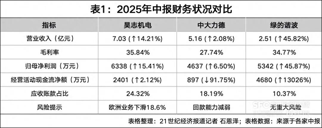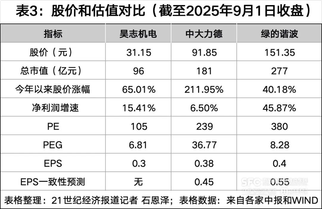 机器人是否灵动,关键看关节。决定关节灵活度的零部件是减速器——它凭借刚轮与柔轮的精密啮合,将电机的旋转之力转化为精准动作,决定着手臂能否实现0.1度的定位精度。 从数量上说,减速器是机器人本体中成本占比最高的环节。根据负载不同,减速器可划分为谐波减速器、行星减速器和RV减速器。其中,谐波减速器的负载小、精度高,成为目前人形机器人减速器的主流方案。 然而,由于技术门槛较高,谐波减速器曾长期被日本企业垄断。直至近五年,国内才崛起打破垄断的公司。随着人形机器人量产爆发,这批优秀的“隐形冠军”走入台前。 近期,正值A股中报季,本文将选取A股市场里三家公司作为样本观察,分别是绿的谐波(688017.SH)、中大力德(002896.SZ)和昊志机电(300503.SZ)。这三家今年都在以谐波减速器为切口,跨界入局机器人赛道。 现金流暴涨130倍!绿的谐波尽享人形机器人爆发红利从2025年半年度财报看,谐波减速器三强已拉开差距。 在营收体量上,昊志机电以7.03亿元营收居首,但欧洲运动控制业务受当地经济拖累影响,下滑18.6%。外加该公司业务线布局相对分散,数控机床、机器人、新能源汽车多线并行,稀释增长动能,上半年营收增速为14.21%。不过,其机器人核心功能部件上半年实现销售收入1221.03万元,同比增长127%。 中大力德则以5.16亿元营收居中,但增速为2.08%垫底。其中,该公司业务线中的精密减速器收入萎缩8.55%,反映出工业机器人需求阶段性疲软。 绿的谐波2.51亿元营收虽最小,但45.82%增速一骑绝尘。该公司两大与人形机器人相关的业务线,谐波减速器与机电一体化产品双双爆发有关,上半年分别实现34.43%和69.66%的高增长。 除了下游人形机器人产业需求的爆发,绿的谐波在技术上,也有自己独特之处。凭借自主开发的“P型齿”设计,绿的谐波打破日本品牌在国内市场的垄断地位,这使得其综合毛利率达34.77%。 而主攻工业机器人的中大力德毛利率27.74%。另外,昊志机电35.84%毛利率虽然也高,但业务线分散,其在机器人核心功能部件上的收入,仅占总收入的1.74%,没能在技术协同上发挥最大效能。 毛利率的优势也反映在净利润上。绿的谐波以2.5亿的营收体量,创造了5342万元归母净利润,同比增长45.87%。而收入体量约为绿的3倍的昊志机电和2倍的中大力德,它们归母净利润分别为6338万元和4637万元,增速分别为15.41%和6.5%。 此外,在现金流方面,上半年绿的谐波经营活动现金流净额暴涨130倍至4680万元。而中大力德因销售回款减少,以及短期借款1.9亿元,使其经营活动现金流净额暴跌91.75%。而昊志机电虽然经营现金流为正(2.12%),但其在应收账款占比上为三者中最高,达24.32%。 综合来看,上半年绿的谐波凭借人形里的技术优势,在市场上形成产品溢价,吃尽人形机器人产业爆发的红利。而昊志机电、中大力德的业绩则被传统业务拖累。 人形生态尚未建立,三家估值均已超百倍除了财务数据,在本次财报中,这三家公司还透露了各自的技术路线。 综合来看,这三家公司都十分重视研发。其中,绿的谐波和昊志机电的研发投入占总营收比例均超过9%,中大力德的研发投入占比也近6%。 然而,在技术布局上,三家侧重点各不相同。 绿的谐波专攻谐波减速器,在长三角与多个大学和研发中心建立合作,屡屡在精密性上实现突破,誓要将其在国内人形机器人产业链里的价值最大化。而也正因为绿的谐波做的事情非常精深,所以在构建生态上,采用的是与南宁宇立成立合资公司,来向力矩传感器领域拓展。 昊志机电的研发走得是并购路线。该公司并购欧洲工业自动化解决方案提供商Infranor拓展下游市场,使其研发部门更具国际化视野。公司在境外子公司Cybelec瑞士、Infranor法国和Mavilor等均设有独立的技术开发部门,分别专注于运动控制器、伺服驱动和伺服电机的开发。不过,并购整合有风险,受困于欧洲子公司技术整合缓慢,以及机器人关节研发投入分散,昊志机电上半年在运动控制品类上的毛利率下滑了18.6%。 如果说绿的谐波瞄准的是人形机器人产业链里的Tier 0.5级核心供应商,昊志机电的路径是要做Tier 2零部件商,那么中大力德则是要成为Tier 1集成商。中大力德在财报中十分强调“一体化”。目前公司围绕工业自动化和工业机器人,形成了减速器+电机+驱动一体化的产品架构,推出“精密行星减速器+伺服电机+驱动”一体机、“RV减速器+伺服电机+驱动”一体机、“谐波减速器+伺服电机+驱动”一体机等模组化产品,实现产品结构升级。 值得一提的是,目前三家减速器公司在人形产业链上的生态,都处于逐步建立的状态。但这三家的估值都已一飞冲天。 截至9月1日收盘,三家公司的市盈率都保持在百倍以上,其中绿的谐波的市盈率更是高达380倍,中大力德和昊志机电分别为239倍和105倍。另外,这三家PEG指标都十分高。中大力德PEG高达36.77,而昊志机电和绿的谐波分别为6.81和8.28。 结合上半年净利润增速来分析,绿的谐波的净利润增速超过了其股价涨幅。而中大力德上半年净利润增速仅为6.5%,但股价涨幅却超200%。这也反映出了资本市场对人形机器人产业链上企业的追捧。 |