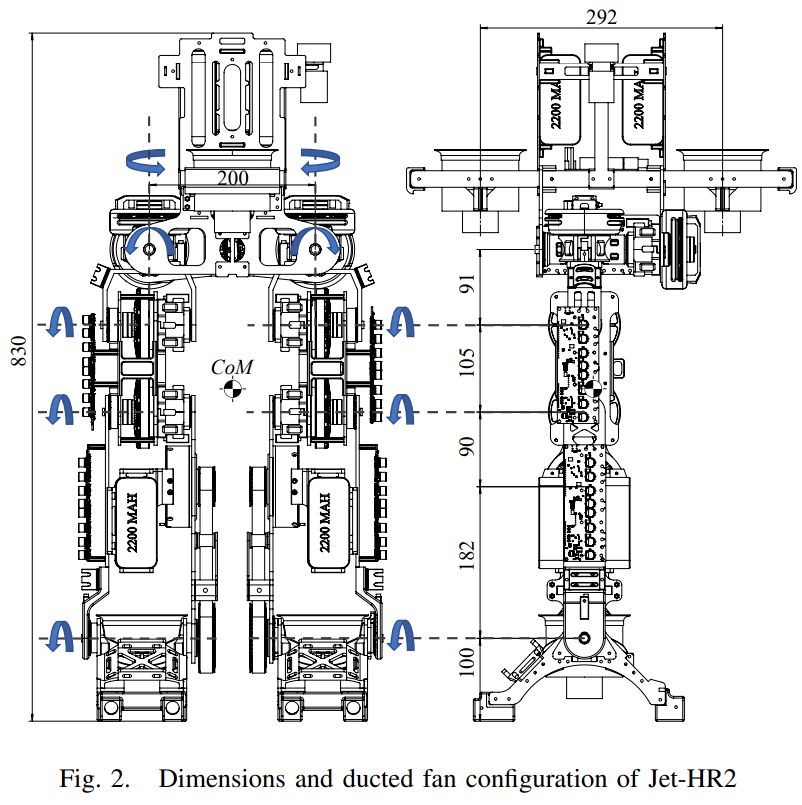 Jet-HR2 的实现原理 Jet-HR2 机器人有 10 个关节,由无刷电机和用于运动的谐波驱动器驱动。为了克服小推力重量比条件下稳定姿态起飞的挑战,该研究基于推力矢量的概念设计了 Jet-HR2。它的推进系统由 4 个涵道风扇组成,其中 2 个固定在机器人腰部,另外 2 个安装在脚上,用于推力矢量控制,并通过在飞行过程中调整脚的姿态来控制推力矢量。此外,研究团队还针对起飞过程中质量误差和关节位置误差引起的姿态不稳定问题,提出了一种简化模型和控制策略。