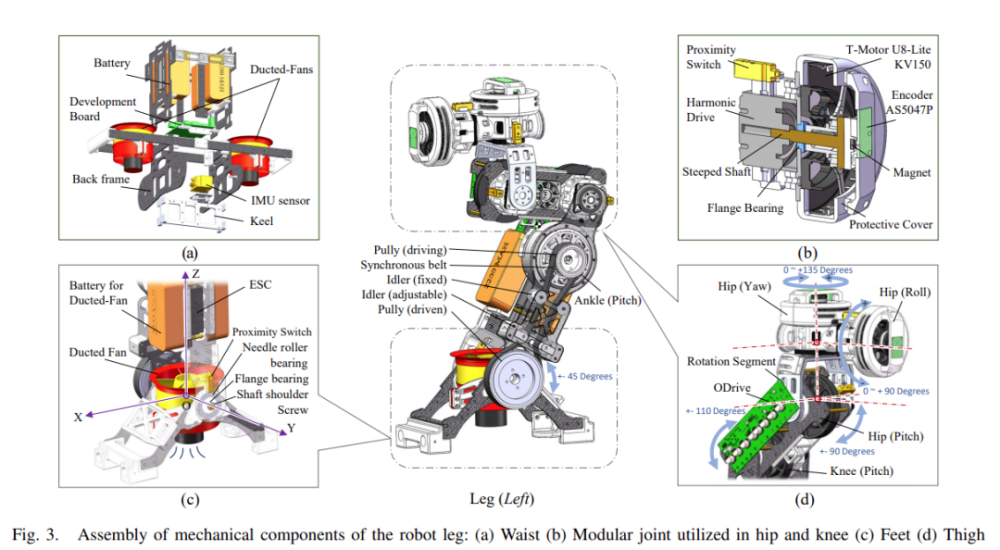 Jet-HR2 双足机器人的腿部部件 表面上,制造类人机器人并不是一件性价比很高的事情,但在某些层面,人形外观具备得天独厚的优势。正如论文作者所说: 近年来,各种用于灾难响应的人形机器人接连面世,通过专门的控制理论和其他机制来克服不平坦的地形。从传统上来说,类人机器人能够通过行进和攀爬克服这些障碍,但这些策略缺乏效率,尤其是在一些难以克服的障碍或地质断层等危险环境中。对于复杂现实场景中的紧急任务,人形机器人有望实现更多动态的空中技能,例如超过身长数倍的跳高、跳远、短距离飞行、悬停等。 类人机器人的性能还达不到人类的水平,尤其是在重量增加的情况下。另一方面,即使达到人类水平,机器人在松散、易倒塌或悬崖状的地形上也可能显得无助,这似乎是使用纯关节致动器发力的限制。在这项研究中,研究者开发了一种可以使用涵道风扇推进系统飞行的新型人形机器人,以探索其在复杂环境中搜索和救援的潜在价值。 不难想象,一台可以飞行的人形机器人,将会有很多潜在的应用方向。这也等待着更多的研究者去探索,更多研究细节可参考论文原文。