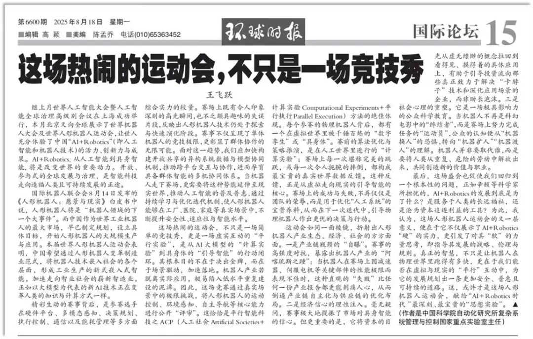 今天在“PEC 2025 AI创新者大会暨第二届提示工程峰会”上,中国科学院自动化研究所复杂系统管理与控制国家重点实验室主任、中国自动化学会监事长王飞跃教授在题为《人类还有希望?——三问人工智能》的致辞中,借由“AI三问”,给出了一幅模型时代涵盖产品模式、AI形态、就业结构等方面的未来图景。这是继去年PEC 2024,王飞跃教授提出十个断言之后,再次对外阐述他对AI的未来判断。 中国科学院自动化研究所复杂系统管理与控制国家重点实验室主任、中国自动化学会监事长王飞跃 值得一提的是,中国自动化学会也对本次活动的顺利召开给予了指导和支持,后续中国自动化学会将指导和参与PEC联盟在AI创新、应用落地和生态建设等工作。 致辞开篇,王飞跃首先提及了杰弗里·辛顿(Geoffrey Hinton)的两个警告: 其一,超级智能可能在20年甚至更短的时间内出现,并带来10%-20%的人类灭绝风险; 其二,富人将利用AI来取代工人,这将创造巨大的失业和利润的飙升,它将让少数人变得更富,大多数人变得更穷。 接下来,他又展示了国务院2025年8月发布的《关于深入实施“人工智能+”行动的意见》,该意见强调需“探索建立适应人工智能时代的新型哲学社会科学研究组织形式”,并“探索形成智能向善的理论体系”。 结合相关背景,王飞跃认为,现在探讨人类的未来与AI的角色至关重要,“人类有希望吗?”这一时代大问题可由以下三个问题以点带面: 1、大模型之后还有产品吗? 2、人形机器人真的忽悠人吗? 3、AI会让我们失业变得更穷吗? ▎一问AI:大模型之后还有产品吗? 答:有,但产品形态将彻底重构。信任力与注意力将成为新商品。 王飞跃首先对比了各大模型(豆包、DeepSeek、ChatGPT)对此问题的回答,它们普遍认为大模型作为基础设施,将催生垂直应用和场景化产品。但他本人给出了更深刻的判断:“今日的很多产品,大模型之后将不再成为产品;今日很多不是产品的东西,大模型之后将成为新兴产品。” 他进一步阐明,“未来最有价值的新产品将是信任力(Trustworthy)和注意力(Attention)”,他同时给出“二段论述”:一方面,诺贝尔奖得主司马贺曾指出,信任力和注意力不能大规模生产和流通,所以不能成为商品;另一方面,王飞跃提出,一旦建立了区块链之“DAO”和此“道”上的大模型和AI Agents系统,“信任力”和“注意力”将不可避免地成为智能经济的新“商品”,可大规模生产、可大批量流通,并借助智联网迅速演化成智能时代上无限的智能大市场。 ▎二问AI:人形机器人真的忽悠人吗? 答:并未如此,其关键在于规模定律(Scaling Law)。 但是,王飞跃教授又强调,如果人形机器人真不忽悠人,那么未来人类的主要工作之一就是示教机器人,但必须治理,防止别有用心之人通过人形机器人把人类变成人形机器。 他进一步阐述,当人形机器人被广泛接受为一种通用的机器,那么人形机器人将像大模型一样,成为一种新的基础设施。这将大大简化机器制造的复杂性,并降低操作成本。 他引用自己在《中国日报》和《环球时报》等媒体发表的文章《这场热闹的运动会,不只是一场竞技秀》,将近期举行的世界人形机器人运动会解读为一场虚实互动的“平行实验”,这正是平行智能ACP(人工社会 Artificial Socictics+计算实验 Computational Experiments+平行执行Parallel Execution)方法的体现。 他认为,这场赛事虽然暴露了一些问题,但是也由此产生了更多的意义: 1.产业链瓶颈的“自曝”:赛场上的失误直观暴露了减速器、伺服电机等关键部件的性能短板,倒逼产业链自主化。 2.经济信心的理性注入:将资本的目光从空泛概念拉回到具体应用和“卡脖子”技术上,而非助长泡沫。 3.社会心理的重塑:让公众认知从“机器换人”的恐惧,转向“机器扩人”、“机器渡人”的理解,即机器人旨在将人类从重复、危险的劳动中解放出来。 中国科学院自动化研究所复杂系统管理与控制国家重点实验室主任王飞跃教授在《环球时报》发表文章《这场热闹的运动会,不只是一场竞技秀》 ▎三问AI:AI会让我们失业变得更穷吗? 回答:不会。但人工智能需要更多的“人工”,将创造更多更好的工作。 针对社会最普遍的“失业焦虑”,王飞跃教授给出了一个与主流悲观论调截然相反的答案,而是一个相对乐观的看法。 他引用经济学中的广义杰文斯悖论(Jevons Paradox)给予解释,即技术效率的提升反而会增加资源的总消耗量。王飞跃由此指出,“人工智能需要更多的人工,并创造出更多更好的工作。” 更进一步,他用历史类比来增强其论点。Computer这个单词最早指操作计算的女工,但是后来变为代指“计算机”这个机器。 但是,“计算机(Computer)由‘人’变为‘机器’,并没有让人失业,反而造就了今日无处不在的码农,就是一个很好的例子。”他总结道:“今日的很多工作,AI之后将不再是工作;今日很多不是工作的事务,AI之后将成为新兴的工作。” 未来社会蓝图 在演讲的最后,王飞跃系统性概括了他对未来社会结构、工作模式和收入分配的预测判断。 第一,未来的社会将由“三个世界的三种人类”组成。 第一种人是原本人类世界的“生物人“;第二种是物理世界的“机器人”;第三类的是数字世界的“数字人”。 这三种“人类”将会存在一个工作配比,如:一个生物人,配三个机器人,和16个数字人,共同工作,这就是帕累托“80/20”原理。