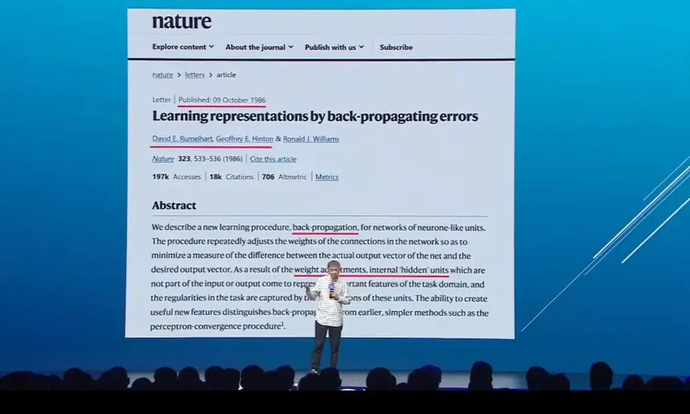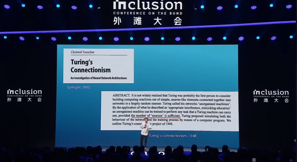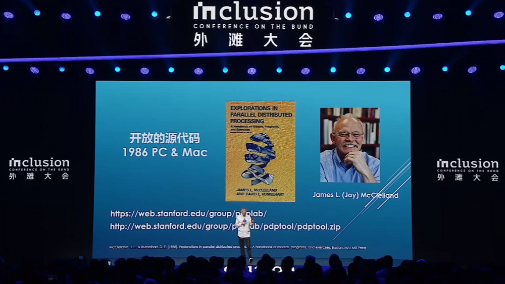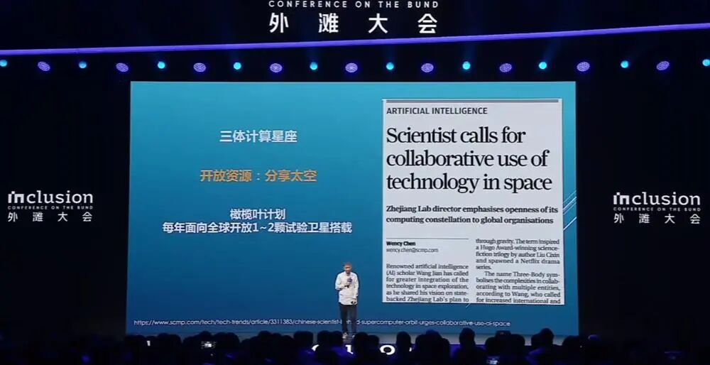 对产业而言,这个变量不是新的。1998年,互联网要兴起的时候,最重要的标志就是浏览器。Netscape(网景)是当时最好最开放,也是改变了格局的浏览器。在互联网时代,Netscape的开源是那个时代的一个分水岭。开放的话题不是今天才重要,在互联网时代就是关键的变量。很少人知道,其实是在1998年的4月份开源这个词——open source(开放源代码)——才被一批极客固化下来。当时有很多不同的叫法:自由软件、免费软件。open source这个词是在1998年固化下来,其实离我们并不远,但开创了我们互联网的那个时代。再谈到图灵奖。2018年Hinton和几位开创者得了图灵奖的时候,很多事情才刚刚开始。后来Hinton做过一个演讲。在这个演讲上他说了两个重要的观点,跟今天的开源有关系。他讲到AI的两个最重要的方法:逻辑驱动、逻辑启发的方法,以及受大脑、神经元等生物学特性启发的方法。因为有第二个方法,也就是用神经元或者生物学方法来驱动的方法论的演进,使得我们有了权重的概念。即使8年以后,Hinton在7月上海的世界人工智能大会上,重复了八年前讲的两句话,这是有原因的。以生物学作为思想的驱动,不是从AI开始的。图灵在40年代末就第一次提出了一个基本观点:今天所有神经元基础的东西都有一个名字,叫连接(connection)。红线标注的地方很有意思:受神经元的启发,和真正的神经元没有关系,所以加了引号。但一个重要的事情是,当神经元的数量足够多时,就会产生智能。这是图灵在1948年提出的。所以今天讲的第二个路径就是这个路径。很久之前就有人在探索这件事情。这篇文章发表在1986年的《自然》杂志上,非常明确地讲到了权重在模型中的重要性。第三作者是Hinton,前两个作者是当时世界上最著名的心理学家。在80年代中期,与神经元相关的探讨是以心理学家为核心的小组讨论的,而计算机科学家主导的AI方向是逻辑驱动的方法。那时候如果要做这件事情,有一本教科书,这是1986年以后我接触这个领域时的教科书,叫作zuoParallel Distributed Processing。上次在上海碰见Hinton,我提到这套书时,他还蛮激动的,说当年设想的东西今天都变成现实了。这本书就是他和几位心理学家一起完成的。还要感谢互联网。这两本书背后专门出了一本实验手册,第一次真正把所有关于理论的代码都开放出来。到今天为止,你还可以去下载它的代码。尽管这个代码运行在DOS上,是最原始的操作系统。而开放的时候还没有开源这个概念。开源是在1998年才被固化下来。开放资源的概念不是因为有开源一词才出现的。在科学探索过程中,很多先驱已经这样做了。以生物学神经元为基础的方法论的先行者,为我们做了探索。后来2012年,Hinton和两位学生把数据、模型和算力GPU结合起来,带来了人脸识别的时代。但那时资源的概念还没有深入人心。因为数据量不足够大,模型不够复杂,算力也有限。他们只用了两块普通的游戏GPU。2017年,几位作者提出了Transformer和tokenization,也就是我们今天讲的token。tokenization是一个关键技术,使数据真正资源化,这是里程碑。同样因为这两个东西的出现,当时的数据、模型和算力又叠加了一个更大的变量——规模。所有东西的规模成千上万倍增加,使AI发生了天翻地覆的变化。当规模到达一定程度时,资源就变得极其重要。模型权重的开放,本质上是数据资源和计算资源的开放。有了模型开放以后,你不需要再花那么多计算资源去重新做,有人替你完成了。我想说一下,开放以后并不意味着计算不重要,而只是意味着个体不用花这么多资源,因为有人付了这笔钱。但要做更好的模型,需要更多资源的投入。今天,仅仅开放源代码,不能解决我们过去在软件时代用开源解决的问题。开放资源,特别是数据和计算资源,才是推动行业往前走不可缺失的环境。这就是AI时代开源的重要特点。我更愿意把它叫作open resource。但open source和open resource翻译成中文,都是开源。开源不只是模型。太空一直是我们最大的资源。AI不仅可以用于手机电脑,也不应该缺席太空,但这里有算力的障碍。当拥有上述三个组合的时候,就有机会重新定义。就像当年把手机重新定义为电脑。今天我们有了通讯卫星、导航卫星和遥感卫星,因为AI,我们会有第四种卫星,我把它叫计算卫星。同样因为这种卫星的存在,使我们有机会把AI送到太空。我自己还是挺幸运的,因为在之江实验室工作。今年5月14号,我们第一次把12颗卫星同时送上天,而且在这12颗卫星组成的星座上,第一次把一个地面上完整的8B AI模型放到太空去了。不是用了一个简单的深度学习算法做个小程序,而是一个跟地面上一模一样的完整AI模型。第一次进去的时候,非常激动,也第一次感受到AI不能缺席太空。这12颗卫星到了太空以后,就可以保证在卫星到达的地方,就能完成所有数据的处理。在这之前,卫星只和地面发生关系,卫星之间没有关系。这是第一次实现了在太空中卫星之间的互通互联,给AI在太空带来机会。这件项目被叫作“三体计算星座”。很多朋友知道“三体”是从小说里读来的,但它是彻头彻尾的科学概念,最早是牛顿提出来的。他说,在太空中如果只有两个物体,比如月亮和地球,是有解析解的,也就是能用数学来解释两者的关系。但如果再加第三个物体,比如太阳,就没有解析解了,没有确定的解了。要描述它们的关系,一定要假定另一