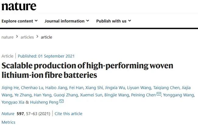 高安全性纤维锂离子电池织物为手机无线充电 相关研究成果以“Scalable production of high-performing woven lithium-ion fibre batteries”为题,于2021年9月1日发表在Nature上,审稿人评价这个工作是“储能领域和可穿戴技术领域的里程碑研究”(“landmark research not only in energy storage but also in wearable technology”)和“柔性电子领域的一个里程碑”(“a milestone towards the prevalence of flexible electronics”)。高分子科学系博士生何纪卿和路晨昊为共同第一作者。