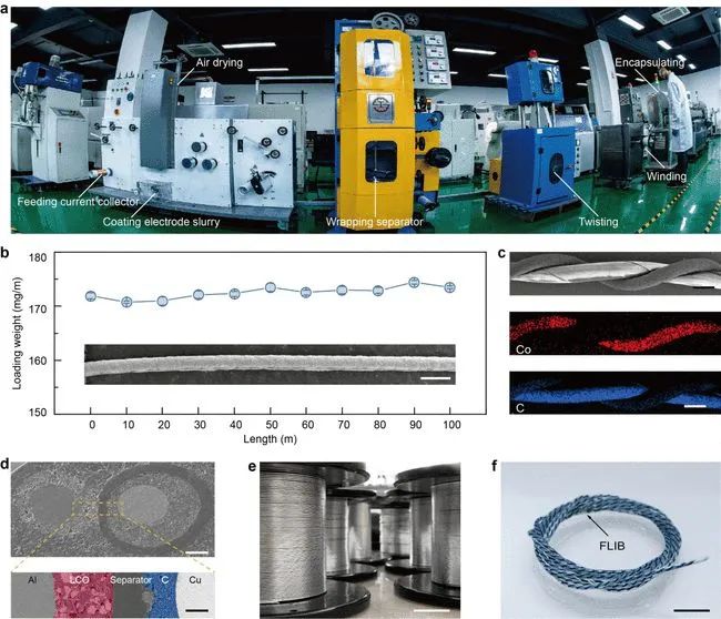 图1:a) 连续的纤维锂离子电池可以有效满足各种电子产品的用电需; 图1;b) 纤维集流体电导率对纤维锂离子电池内阻和长度关系的影响。 进一步,彭慧胜团队发展出了高效负载纤维锂离子电池活性材料的连续化方法,有效解决了聚合物复合活性层与导电纤维集流体的界面稳定性难题,并通过自主设计和建立面向纤维锂离子电池连续构建的标准化装置(图2 a),实现了活性材料在千米级光滑纤维表面的高效负载和精准调控,获得到了高负载量、涂覆均匀和容量高度匹配的正、负极纤维材料(图2 b)。进一步将正极纤维和包覆隔膜的负极纤维进行缠绕组装,并进行有效的封装,最终实现了高性能纤维锂离子电池的连续化制备(图2 c-f)。