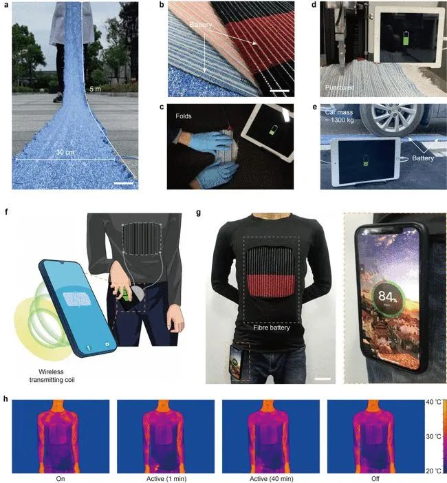 图3:a-e) 通过纺织方法获得高性能和高安全性的纤维锂离子电池织物; 图3:f-h) 纤维锂离子电池织物为智能手机进行无线充电。