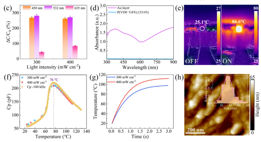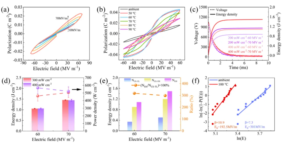 自 2018 年起,中国科学技术大学教授初宝进团队在科技部专项项目的支持下,开展了人工视觉系统的相关研究,旨在针对盲人的视网膜病变,开发新一代可替代视网膜功能的材料,从而能够恢复盲人的视觉和提高病人的生活质量。研究团队通过引入光响应材料,使得铁电高分子材料获得了可见光响应,并在材料中获得了优异的光电响应性能。进一步的动物实验表明,当将这些兼具良好柔性和优异光电响应性能的材料植入致盲小鼠之后,可以恢复盲鼠的光感应,这说明该类材料在生物医疗方面有着良好的应用前景。 图 | 初宝进(来源:初宝进) 在上述研究中,其发现材料具有显著的光电容现象(即光照引起的材料的介电系数的变化)。在后续研究中他们发现,光电容现象也同样存在于没有添加光响应材料的样品中。在随后的研究中其又发现,在测量材料的电学性能之前,需要在铁电高分子表面进行溅射的金电极表现出很强的光热效应。这是一个很有意思的现象,因为在以往的研究中,关于金的光热效应的报道多见于金纳米颗粒之中,而研究团队测试中所使用的金电极为约 30 纳米厚的薄膜。 近年来,热释电能量回收器件的研究获得了一定关注,该类器件在可穿戴设备、无线传感器、智能电子皮肤等领域有着潜在应用。在上述研究的基础上,研究团队考虑是否可以将具有金电极的铁电高分子作为热释电能量回收器件进行研究。 他们推测,该器件与传统的热释电器件相比具有以下优势: 其一,该器件的结构十分简单,仅由高分子材料和电极组成,而金电极兼具导电和光热转换功能。 其二,传统热释电器件为了实现热释电能量转换,需要周期性地接触热源和冷端,这一过程相对比较缓慢,导致能量释放比较慢。为了增加释放的能量,通常需要在热释电器件上施加比较高的电场,但是较慢的热循环过程会降低热释电材料在击穿电场和击穿器件上的可靠性,从而会导致较低的能量密度。而研究团队的光-热释电器件恰好可以解决上述问题,因此迅速的光热转换速度以及金电极和高分子间的有效热传导,可以加速热循环的过程,同时可以提高能量密度和功率密度。 其三,传统热释电器件对于红外光有响应,研究团队研发的光-热释电器件可以将响应光谱范围拓展到可见光,因此非常有利于远程供电应用。 除了上述优点之外,在研发高能量密度的电容器时,使用介电材料也是当前该领域内的“流行做法”。因此,研究团队考虑是否可以利用材料较强的光电容效应来调控材料的能量密度,并利用热释电效应来提升介电材料的能量释放。基于上述研究背景和考虑,他们启动了一项课题。 在这一研究中,他们采用金电极作为光热介质,利用聚偏氟乙烯(PVDF,Poly(vinylidene fluoride))基铁电高分子较强的热释电效应,同时结合特殊设计的充放电电路和热力学循环,在具有 Au/P(VDF-TrFE)/Au 简单结构的样品中,实现了高效的光-热释电能量采集。 这一研究的主要创新点包括: 首先,同时实现了高能量密度与高功率密度。得益于金电极的强光热效应和电路设计带来的超快放电速率,该采集器的能量密度最高达 4.75J/cm3,功率密度达 1711.9W/cm3,均超越目前报道热释电器件的最高值(需要指出的是,4.43J/cm3 和 526W/cm3 这两个最高值来源于两个工作,不是在同一器件中获得的),同时还获得了目前报道的最高能量转换效率。 其次,能够观察到显著的光电容效应。在具有金电极的聚合物薄膜中发现强光电容效应,光照下电容变化率高达 281%。 再次,在单一材料中能够实现热释电能量采集与介电储能的结合。通常的热释电器件由于较慢的热循环过程,放电功率密度低,不能匹配电容器应用中所需的高功率。研究团队提出的热释电器件具有较高的能量释放速率,器件功率密度可与电容器媲美,同时还具有高能量密度。因此,本次研究提出的光热释电收集器解决了介电能量存储和热释电能量采集不兼容的矛盾。研究团队的结果表明,两者的结合可使得铁电高分子在 1/4 的电场下,放电能量密度达到聚丙烯高分子膜(商业化薄膜电容器中大量使用的介电材料)的 1.5 倍。这说明该器件不仅可作为热释电器件,还可作为电容器运行,仅通过光照即可将能量密度提升 250% 以上。同时,对于电容器应用而言,热通常被认为是一个负面因素。研究团队通过该研究指出,如果使用铁电材料作为电容器的介电材料,通过适当的设计,热可作为一个提升能量密度的有利因素。 最后,研究团队发现了金电极的强光热效应,并进一步发现类似的光热效应在其他金属电极中也存在。电极作为导电材料,在一些器件中为必不可少的一部分,这一发现可以为设计新的功能器件和理解一些物理现象提供新的思路。 在基础研究方面,研究团队区分了热释电能量采集过程中不同物理过程的贡献,对于热释电能量回收获得了更为深入的理解。 该成果潜在的应用领域包括:作为能量回收器件和光电传感器件,用于微型电子与可穿戴设备、物联网与工业传感器网络、植入式医疗器件、微型机器人等;此外,还有望应用于高能量密度的电容器,在电网、电动汽车等领域发挥作用。 (来源:https://advanced.onlinelibrary.wiley.com/doi/10.1002/adma.202502803) 就具体的研究过程来讲: 首先是研究团队在人工视网膜的研究中发现带有金电极的 P(VDF-TrFE)铁电高分子具有强烈的光电容效应,这引起了研究团队的强烈好奇