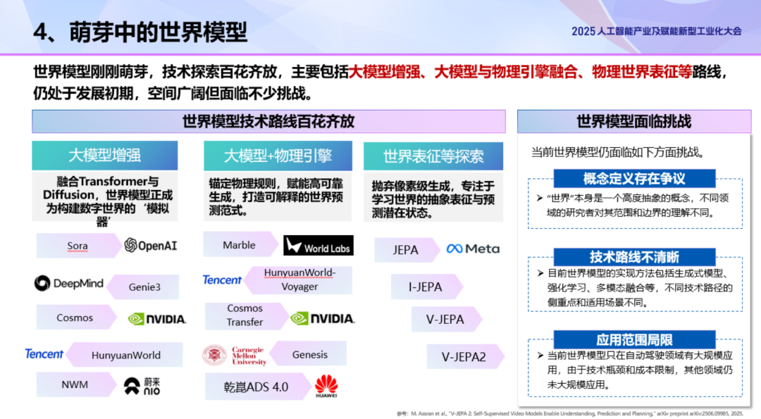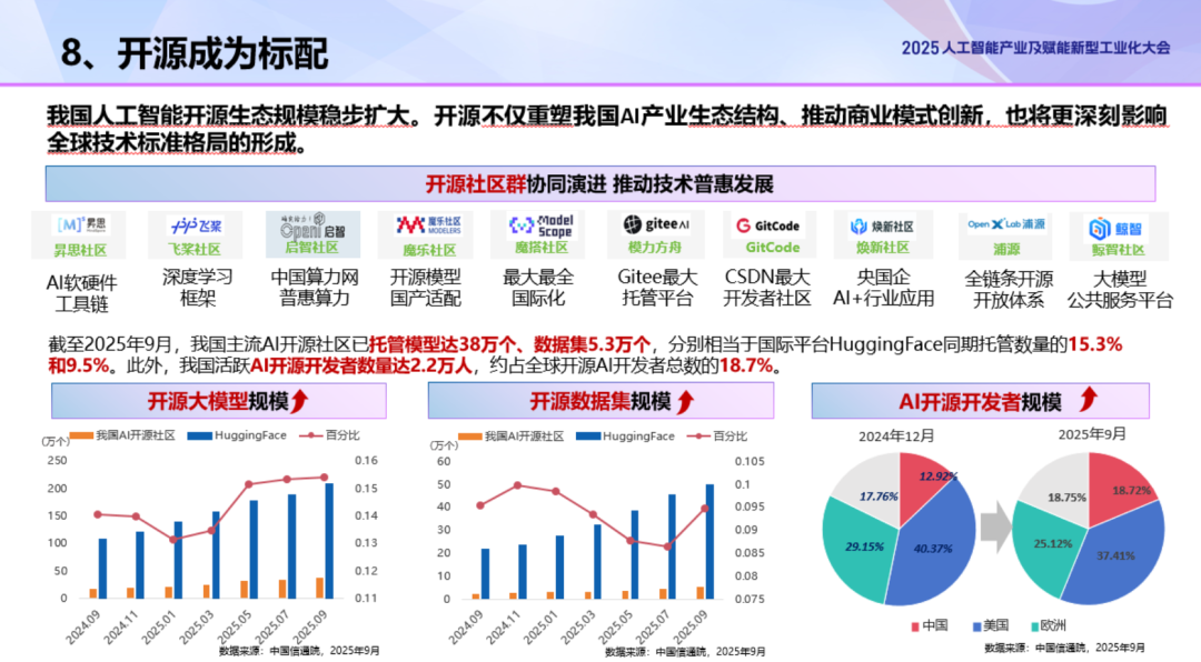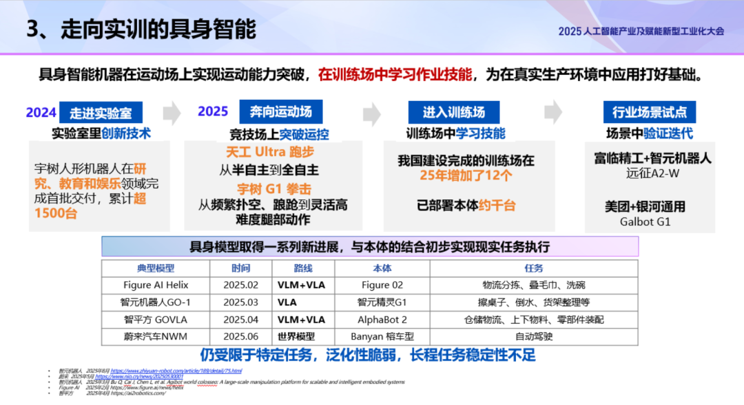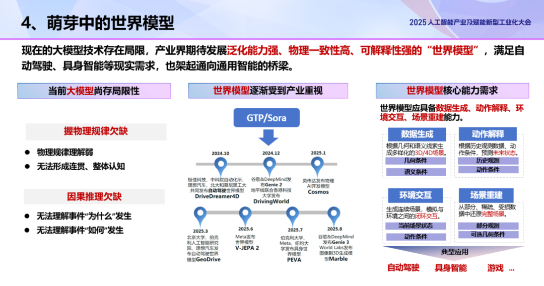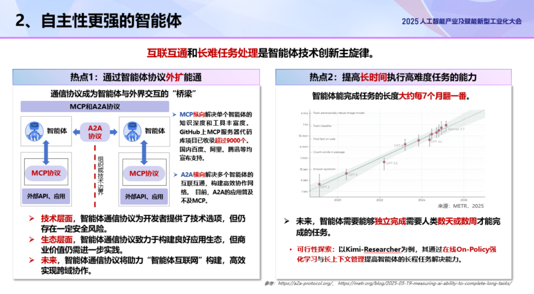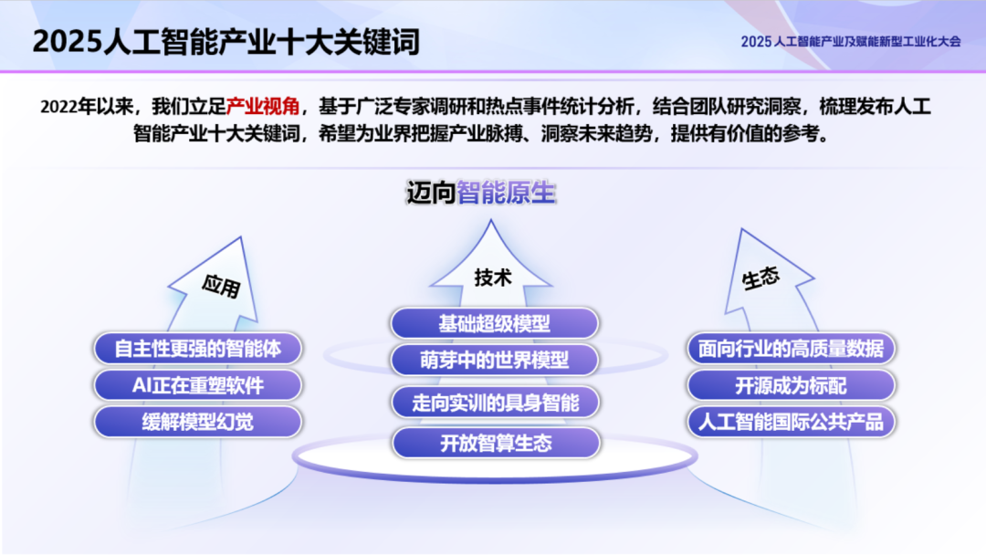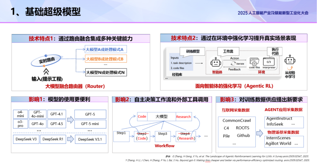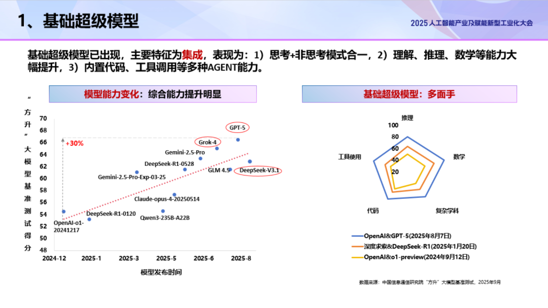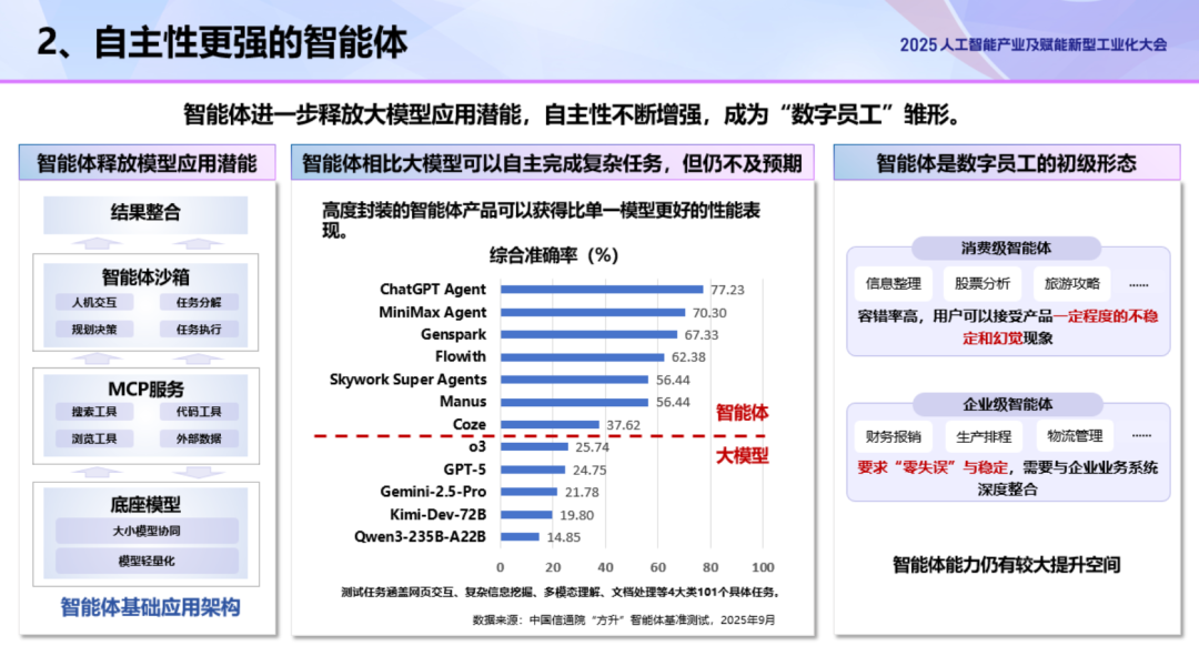 2025年9月23日,2025人工智能产业及赋能新型工业化大会在北京国家会议中心成功召开。会上,中国信息通信研究院人工智能研究所所长魏凯正式发布“2025人工智能产业十大关键词”,并解读十大关键词反映出的新热点、新趋势。 中国信息通信研究院自2022年起连续四年发布人工智能十大关键词,获得了产业界的广泛关注,成为追踪行业发展的重要窗口。2025年,立足产业视角,基于广泛专家调研和热点事件统计分析,结合团队研究洞察,梳理发布2025人工智能产业十大关键词。总体来看,2025年人工智能技术、应用、生态三维共振,智能原生的新世界越来越清晰的展现在我们眼前。 2025年,基础模型与推理模型双线并进,技术迭代速度与能力跃升幅度均超预期。根据中国信息通信研究院 “方升” 基础模型测试数据,2024年底至2025年8月,大模型综合能力提升超过30%。以GPT-5、Grok4、DeepSeek V3.1、Claude Opus 4.1、 Qwen3-235B-A22B为代表的头部大模型表现出显著的集成特征:一是思考+非思考模式合一,根据用户提示词自主选择模型或推理模式;二是理解、推理、数学能力大幅提升;三是内置代码、工具调用等多种AGENT能力。集成多种关键能力的基础超级模型已出现,不仅综合能力强,且在真实业务场景中的表现得到进一步强化。 技术创新是驱动模型能力跃升的核心引擎,基础超级模型有两个主要技术特点:一是通过路由融合集成多种关键能力。二是面向智能体的强化学习(Agentic RL)提升真实业务场景表现。基础超级模型对用户产生三方面重要影响:一是模型的使用更便利,基础超级模型出现后,模型种类和数量收敛,GPT-5可以根据用户的指令动态选择合适的模型和处理模式,降低用户的使用门槛。二是自主决策工作流和外部工具调用,工作流和工具使用能力集成到基础超级模型内部后,极大程度上增强了工作流工具调用的精准度,使得应用效果更佳。三是对训练数据供应提出新要求,从AGENT应用中采集数据和从物理场景中采集数据成为新的迫切需求。 2025年,高度封装的智能体产品通过融合基座模型、MCP服务、智能体沙箱等,进一步释放大模型应用潜能。一方面,智能体相比大模型可以自主完成复杂任务,但仍不及预期。中国信息通信研究院“方升”智能体基准测试对国内外通用智能体进行了4大类101个具体任务测试,结果显示当前智能体能够自主完成复杂任务,可以获得比单一模型更好的性能表现,但能力仍有很大提升空间。另一方面,智能体产品形态逐步清晰,在消费端和企业端深度赋能,智能体成为数字员工的初级形态。 互联互通和长难任务处理仍是当前智能体技术创新的主旋律。一方面,通信协议成为智能体与外界交互的“桥梁”,加速实现互联互通。Anthropic公司发布的模型上下文协议(MCP)、谷歌式发布的Agent2Agent(A2A)全新开放协议,二者在应用过程中可实现互补协同。另一方面,智能体发展还需要提升长时间执行复杂任务的能力。相关研究显示,过去两三年,智能体能完成任务的长度大约每7个月翻一番。未来,智能体将能独立完成大量需要人类数天或数周才能完成的任务,加速开启智能原生应用时代。 具身智能正在加速走出实验室,走向竞技场和训练场,为真正进入场景实战迈出了坚实一步。本体方面,加快推进在现实场景的部署。2025年,本体从实验室走到真实赛场、训练场,并逐步推进行业场景的试点验证,在真实场景的实践打磨中推动技术不断进步。模型方面,与本体结合初步实现现实任务执行。蔚来世界模型NWM在Banyan 榕车型上全量推送,强化追尾预防及保护和通用障碍物识别能力。智元机器人GO-1端到端VLA模型部署到智元精灵G1上,完成擦桌子、倒水等任务。分层式端到端VLA如Figure AI Helix支持Figure 02学习物流分拣、叠毛巾和洗碗等任务的作业技能。 具身智能要从“实训”走向“干活”,仍面临三大挑战:一是高质量数据缺,行业普遍认为要实现物理智能涌现至少需要百万小时的机器人数据,而当前真正可用数据远远不足;二是模型泛化难,任何在训练数据分布外的场景任务,都会导致性能急剧下降,难以覆盖现实场景的复杂情况;三是软硬协同难,模型与本体的结合需要在多个时间尺度上实现协同控制,任何一环信号传输的不稳定,都很可能导致任务执行失败。 世界模型作为AI系统理解、推理并预测物理世界的“内部模拟器”,被视为通向通用人工智能(AGI)的核心路径之一,正在萌芽中。产业界期待发展泛化能力强、物理一致性高、可解释性强的“世界模型”,满足自动驾驶、具身智能等现实需求,也架起通向通用智能的桥梁。世界模型的核心能力主要包含四类:一是数据生成能力,世界模型能够根据几何和语义线索生成多样化的3D/4D场景;二是动作解释能力,世界模型能够根据历史观测数据、动作条件预测未来状态;三是环境交互能力,世界模型能够生成连续场景,模拟与环境之间的闭环交互;四是场景重建能力,世界模型能够从部分、稀疏、受损数据中还原完整场景。 世界模型的技术路线还处于百花齐放的探索中,当前主要有三条技术路线,主要包括大模型增强、大模型与物理引擎融合、物理世界表征等。下一步发展仍面临不少挑战。一是定义存在争议,不同领域的研究者对其范围和边界的理解不同。二是技术路线不清晰,目前世界模型的实现方法包括生成式模型、强化学习、多模态