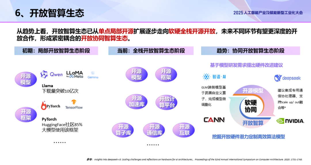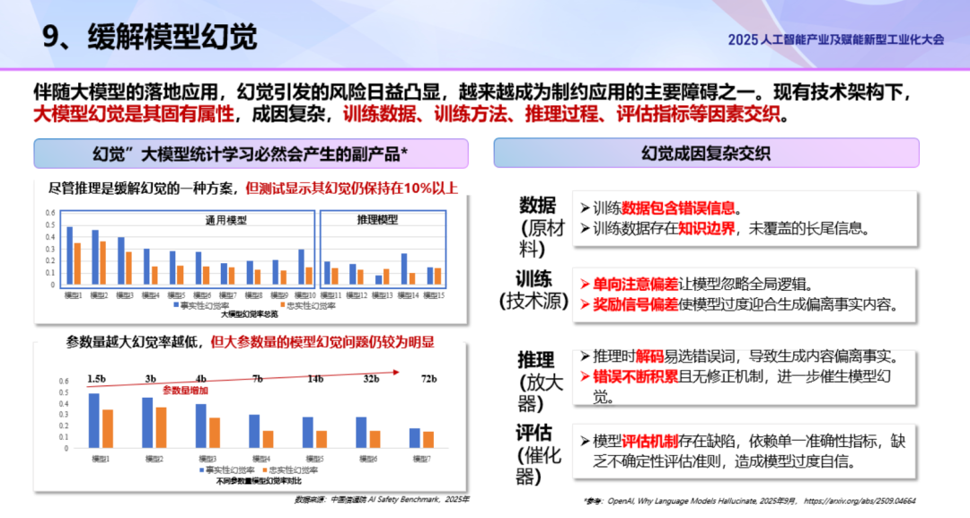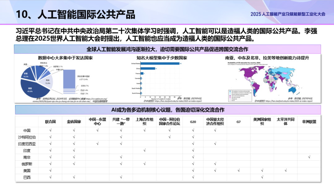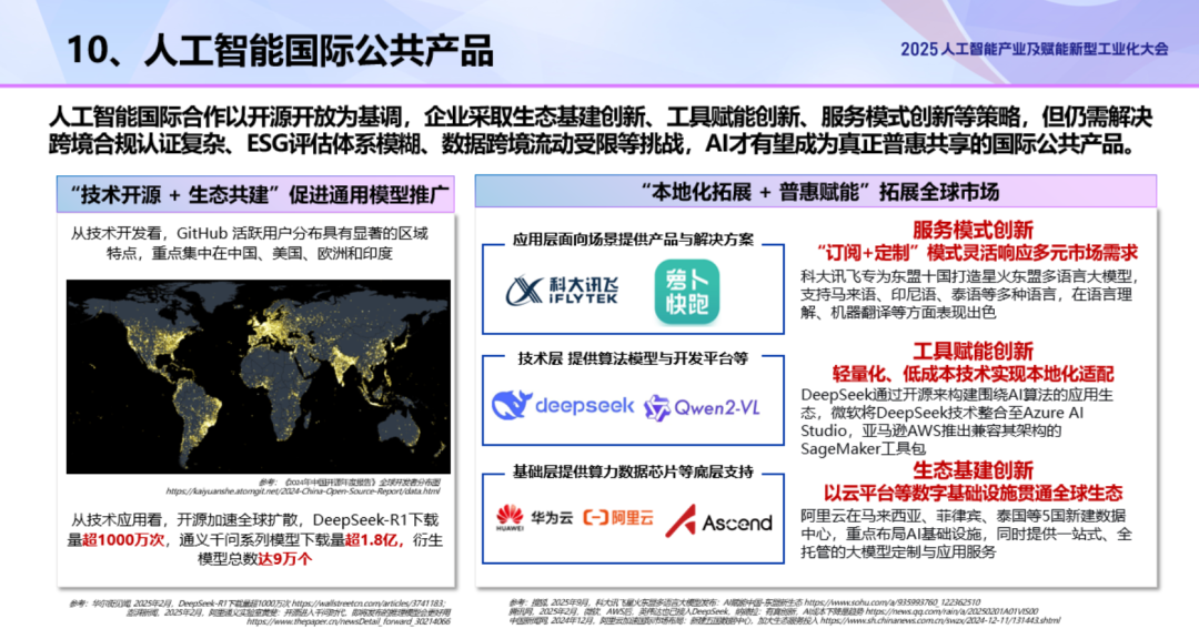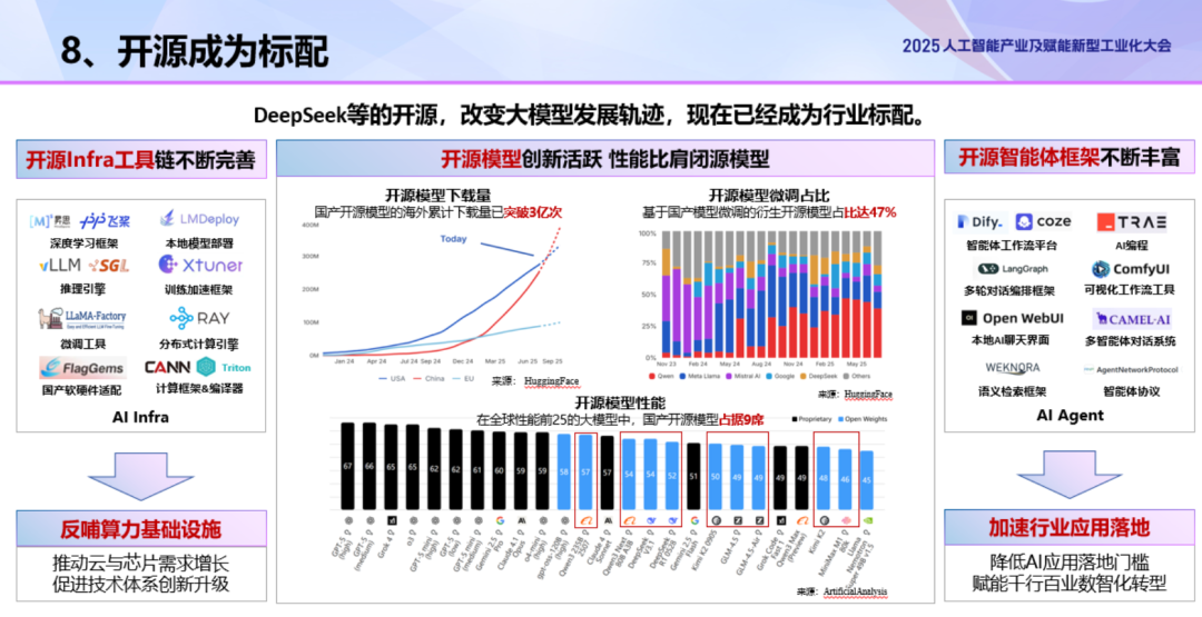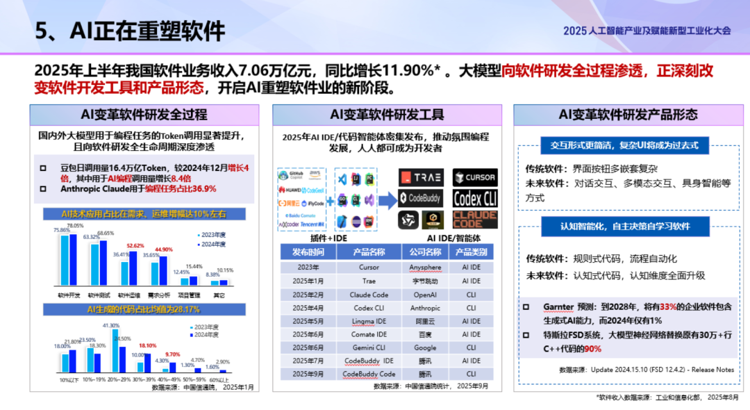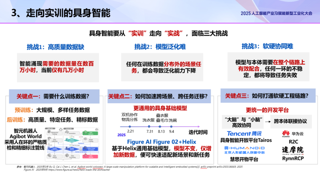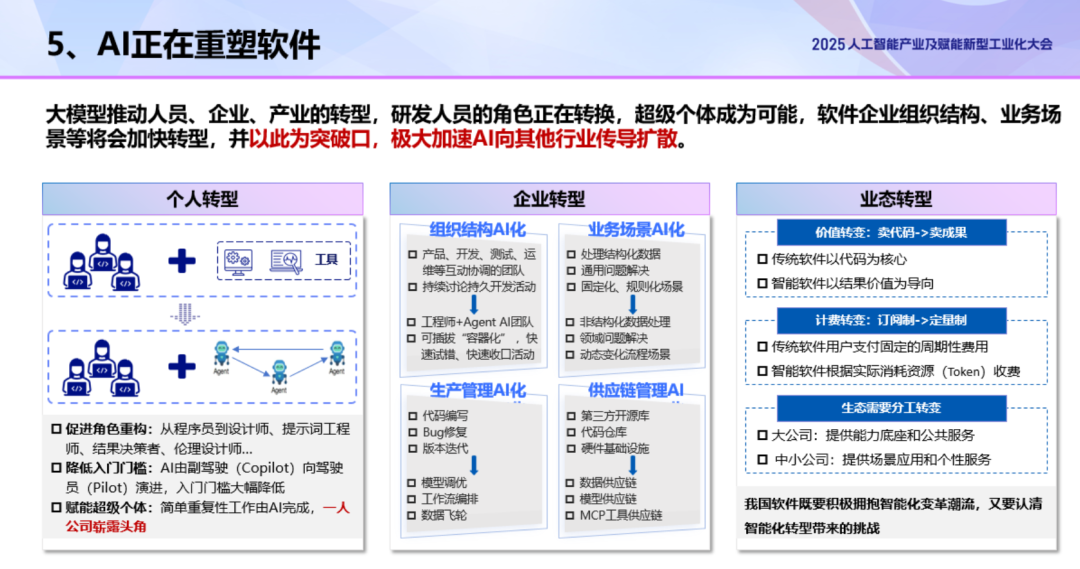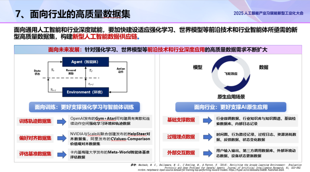2025年9月23日,2025人工智能产业及赋能新型工业化大会在北京国家会议中心成功召开。会上,中国信息通信研究院人工智能研究所所长魏凯正式发布“2025人工智能产业十大关键词”,并解读十大关键词反映出的新热点、新趋势。 中国信息通信研究院自2022年起连续四年发布人工智能十大关键词,获得了产业界的广泛关注,成为追踪行业发展的重要窗口。2025年,立足产业视角,基于广泛专家调研和热点事件统计分析,结合团队研究洞察,梳理发布2025人工智能产业十大关键词。总体来看,2025年人工智能技术、应用、生态三维共振,智能原生的新世界越来越清晰的展现在我们眼前。 2025年,基础模型与推理模型双线并进,技术迭代速度与能力跃升幅度均超预期。根据中国信息通信研究院 “方升” 基础模型测试数据,2024年底至2025年8月,大模型综合能力提升超过30%。以GPT-5、Grok4、DeepSeek V3.1、Claude Opus 4.1、 Qwen3-235B-A22B为代表的头部大模型表现出显著的集成特征:一是思考+非思考模式合一,根据用户提示词自主选择模型或推理模式;二是理解、推理、数学能力大幅提升;三是内置代码、工具调用等多种AGENT能力。集成多种关键能力的基础超级模型已出现,不仅综合能力强,且在真实业务场景中的表现得到进一步强化。 技术创新是驱动模型能力跃升的核心引擎,基础超级模型有两个主要技术特点:一是通过路由融合集成多种关键能力。二是面向智能体的强化学习(Agentic RL)提升真实业务场景表现。基础超级模型对用户产生三方面重要影响:一是模型的使用更便利,基础超级模型出现后,模型种类和数量收敛,GPT-5可以根据用户的指令动态选择合适的模型和处理模式,降低用户的使用门槛。二是自主决策工作流和外部工具调用,工作流和工具使用能力集成到基础超级模型内部后,极大程度上增强了工作流工具调用的精准度,使得应用效果更佳。三是对训练数据供应提出新要求,从AGENT应用中采集数据和从物理场景中采集数据成为新的迫切需求。 2025年,高度封装的智能体产品通过融合基座模型、MCP服务、智能体沙箱等,进一步释放大模型应用潜能。一方面,智能体相比大模型可以自主完成复杂任务,但仍不及预期。中国信息通信研究院“方升”智能体基准测试对国内外通用智能体进行了4大类101个具体任务测试,结果显示当前智能体能够自主完成复杂任务,可以获得比单一模型更好的性能表现,但能力仍有很大提升空间。另一方面,智能体产品形态逐步清晰,在消费端和企业端深度赋能,智能体成为数字员工的初级形态。 互联互通和长难任务处理仍是当前智能体技术创新的主旋律。一方面,通信协议成为智能体与外界交互的“桥梁”,加速实现互联互通。Anthropic公司发布的模型上下文协议(MCP)、谷歌式发布的Agent2Agent(A2A)全新开放协议,二者在应用过程中可实现互补协同。另一方面,智能体发展还需要提升长时间执行复杂任务的能力。相关研究显示,过去两三年,智能体能完成任务的长度大约每7个月翻一番。未来,智能体将能独立完成大量需要人类数天或数周才能完成的任务,加速开启智能原生应用时代。 具身智能正在加速走出实验室,走向竞技场和训练场,为真正进入场景实战迈出了坚实一步。本体方面,加快推进在现实场景的部署。2025年,本体从实验室走到真实赛场、训练场,并逐步推进行业场景的试点验证,在真实场景的实践打磨中推动技术不断进步。模型方面,与本体结合初步实现现实任务执行。蔚来世界模型NWM在Banyan 榕车型上全量推送,强化追尾预防及保护和通用障碍物识别能力。智元机器人GO-1端到端VLA模型部署到智元精灵G1上,完成擦桌子、倒水等任务。分层式端到端VLA如Figure AI Helix支持Figure 02学习物流分拣、叠毛巾和洗碗等任务的作业技能。 具身智能要从“实训”走向“干活”,仍面临三大挑战:一是高质量数据缺,行业普遍认为要实现物理智能涌现至少需要百万小时的机器人数据,而当前真正可用数据远远不足;二是模型泛化难,任何在训练数据分布外的场景任务,都会导致性能急剧下降,难以覆盖现实场景的复杂情况;三是软硬协同难,模型与本体的结合需要在多个时间尺度上实现协同控制,任何一环信号传输的不稳定,都很可能导致任务执行失败。 世界模型作为AI系统理解、推理并预测物理世界的“内部模拟器”,被视为通向通用人工智能(AGI)的核心路径之一,正在萌芽中。产业界期待发展泛化能力强、物理一致性高、可解释性强的“世界模型”,满足自动驾驶、具身智能等现实需求,也架起通向通用智能的桥梁。世界模型的核心能力主要包含四类:一是数据生成能力,世界模型能够根据几何和语义线索生成多样化的3D/4D场景;二是动作解释能力,世界模型能够根据历史观测数据、动作条件预测未来状态;三是环境交互能力,世界模型能够生成连续场景,模拟与环境之间的闭环交互;四是场景重建能力,世界模型能够从部分、稀疏、受损数据中还原完整场景。 世界模型的技术路线还处于百花齐放的探索中,当前主要有三条技术路线,主要包括大模型增强、大模型与物理引擎融合、物理世界表征等。下一步发展仍面临不少挑战。一是定义存在争议,不同领域的研究者对其范围和边界的理解不同。二是技术路线不清晰,目前世界模型的实现方法包括生成式模型、强化学习、多模态