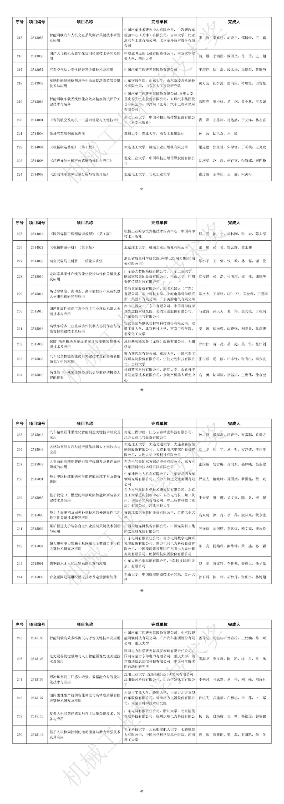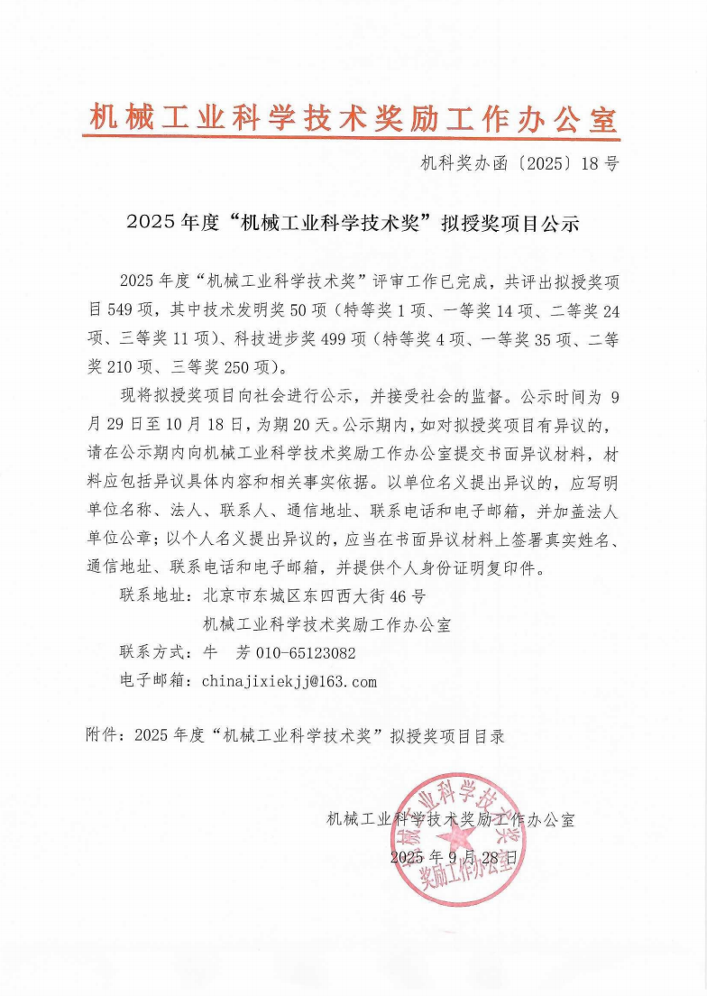 2025年度“机械工业科学技术奖”评审工作已完成,共评出拟授奖项目549项,其中技术发明奖50项(特等奖1项、一等奖14项、二等奖24项、三等奖11项)、科技进步奖499项(特等奖4项、一等奖35项、二等奖210项、三等奖250项)。 现将拟授奖项目向社会进行公示,并接受社会的监督。公示时间为9月29日至10月18日,为期20天。公示期内,如对拟授奖项目有异议的,请在公示期内向机械工业科学技术奖励工作办公室提交书面异议材料,材料应包括异议具体内容和相关事实依据。以单位名义提出异议的,应写明单位名称、法人、联系人、通信地址、联系电话和电子邮箱,并加盖法人单位公章;以个人名义提出异议的,应当在书面异议材料上签署真实姓名、通信地址、联系电话和电子邮箱,并提供个人身份证明复印件。 联系地址:北京市东城区东四西大街46号机械工业科学技术奖励工作办公室 联系方式:牛 芳010-65123082 电子邮箱:chinajixiekjj@163.com 详见文件原文 附:2025年度“机械工业科学技术奖”拟授奖项目目录 政策原文:http://www.cmiao.com.cn/cms/news/1061.htm |