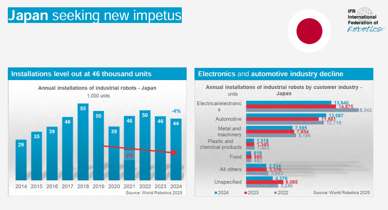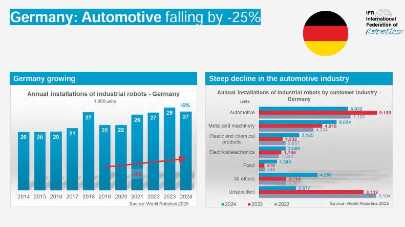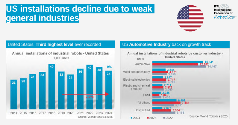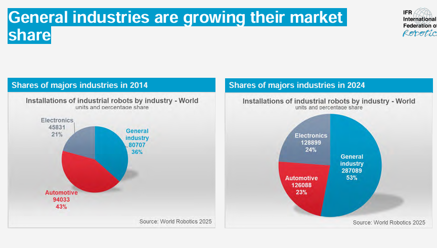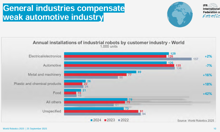 汽车业成最大变量,中国本土份额首超外资。 9月25日,国际机器人联合会(IFR)发布了《2025世界机器人报告》(以下简称《报告》)。数据显示,2024年全球工业机器人安装量达54.2万台,较十年前增长超一倍,年安装量连续第四年突破50万台。从区域分布看,亚洲占全球新部署量的74%,欧洲占16%,美洲占9%,区域格局差异显著。 中国作为全球最大的工业机器人市场,2024年表现亮眼,安装量达29.5万台,创下历史新高,占全球部署量的54%; 其他主要市场则呈现不同程度下滑。日本维持全球第二大工业机器人市场地位,2024年安装量4.45万台,同比下降4%; 美国位列世界第三,2024年工业机器人安装量为3.42万台,同比下降9%; 韩国2024年安装量为3.06万台,同比下降3%,在全球排第四位; 德国作为欧洲最大、全球第五大工业机器人市场,2024年安装量下降5%至2.70万台。 国际机器人联合会主席 Takayuki Ito表示,2024年工业机器人年度安装量创历史第二高,仅比两年前的峰值低2%。这源于多行业向数字化、自动化转型催生的大量需求。2024年,全球在用工业机器人总数达466.4万台,同比增长9%。 展望未来,《报告》指出,尽管区域市场走势差异显著,全球市场总体仍呈向好态势,预计2025年全球机器人安装量将增长6%至57.5万台,2028年将突破70万台。 一、全球工业机器人市场十年翻倍,中国以54%占比领跑全球 过去十年,全球工业机器人市场需求实现翻倍增长。《报告》显示,全球工业机器人安装量从2014年的22.1万台攀升至2024年的54.2万台。与此同时,工业机器人的运营存量也从2014年的147.2万台,增长到2024年的466.4万台,应用深度与广度在持续拓展。 应用领域上,通用行业表现强劲,工业机器人安装量占比从2014年的36%飙升至2024年的53%,弥补了汽车行业的疲软,成为应用主导领域; 2024年,电气/电子行业安装量为12.9万台,同比增长2%;汽车行业2024年安装量为12.6万台,同比下降7%;金属与机械、塑料与化工产品行业均增长18%,食品行业大幅增长42%; 同时,协作机器人安装量也实现两位数增长,从2017年的1.11万台增长到2024年的6.45万台,占比从2.8%提升至11.9%,逐渐融入工业生产。 区域分布上,亚洲/澳大利亚地区2024年工业机器人安装量达40.2万台,在全球工业机器人安装量中占比高达75%; 作为亚洲/澳大利亚地区的核心引擎,中国在全球工业机器人市场中占据绝对引领地位,实现了新安装量与运营存量的“双维度领跑”。 在新安装量上,2024年我国以29.5万台的成绩位居全球首位,全球占比达54%,同比增长7%;而日本、美国、韩国、德国等紧随其后的国家安装量均有不同程度下滑。同时,全球前五市场的安装量合计占比高达80%,头部集中效应显著。 值得一提的是,我国本土制造商在国内的销量首次超过外国供应商,市场份额从十年前的约28%跃升至57%。 二、日美韩德集体承压,印度凭汽车业逆袭第六 全球工业机器人市场在区域格局上呈现显著分化,日本、美国、韩国、德国等传统核心市场安装量集体下滑,而印度则依托汽车行业的强劲需求实现排名跃升,成为市场重要增长变量。 作为全球第二大工业机器人市场,日本工业机器人产业正面临增长瓶颈。《报告》显示,2014-2018年其安装量从2.9万台升至5.5万台,但后续增长乏力,近年稳定在4.6万台左右。2024年安装量进一步降至4.45万台,同比下降4%,仅运营存量保持3%增长,达45.05万台。 增长瓶颈主要源于行业需求端的疲软,其中电子和汽车两大核心应用领域的下滑表现尤为显著。数据显示,电气/电子行业2024年安装量仅1.39万台,较2023年的1.49万台、2022年的1.83万台持续大幅缩减;汽车行业同样承压,2024年安装量1.31万台,低于2023年的1.39万台与2022年的1.81万台。两大支柱行业的颓势,使日本急需挖掘新的增长动力。 视线转向美洲,该地区2024年工业机器人安装量为5.01万台,同比下降10%,虽连续四年超5万台,但增速承压。 美国是美洲最大区域市场,2024年其安装量占美洲总量的68%,位列全球第三,其工业机器人多从日本和欧洲进口,本土供应商较少,国内有众多机器人系统集成商提供自动化解决方案。 行业应用上,2024年美国通用行业疲软拖累整体,汽车行业回暖成亮点。2024年,其工业机器人安装量降至3.42万台,同比下降9%(2023年、2022年分别为3.8万台、4万台); 与此同时,汽车行业工业机器人安装量达1.35万台,相较于2023年的1.23万台有明显增长,虽略低于2022年的1.45万台,但已重回增长轨道,为其工业机器人产业带来了一定的增长动力。 韩国是全球第四大工业机器人市场,仅次于美国、日本和中国。2024年其市场表现同样不容乐观,工业机器人安装量为3.06万台,同比下降3%。自2019年起,韩国年安装量长期维持3.1万台左右,增长动能不足,市场陷入停滞状态。 欧洲市场2024年工业机器人安装量为8.5万台,同比下降8%,仍为历史第二高,80%安装在欧盟(6.78万台),受益于近岸外包趋势2019-2024年年均增长3%。 德国作为欧洲最大、全球第五大市场,工业机器人市场呈现出整体增长但汽车行业大幅下滑的分化态势。2014-2018年德国工业机器人安装量逐步提升,后续虽有波动,但2023年仍有2.8万台的安装量,2024年安装量为2.70万台(占欧洲年度总安装量32%),同比下降5%,整体增长势头放缓。 从行业应用上看,汽车行业遭遇“滑铁卢”,2024年安装量仅为6932台,相比2023年的7720台、2022年的9190台,大幅下降25%;而金属和机械行业2024年安装量为4916台,较2023年的4234台有所