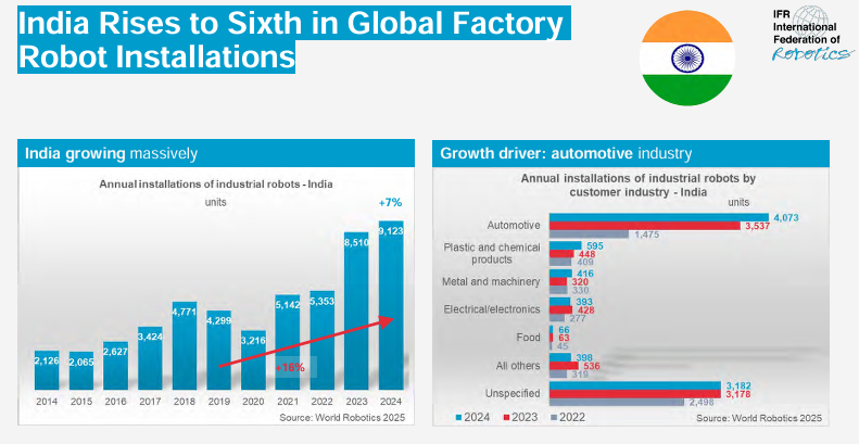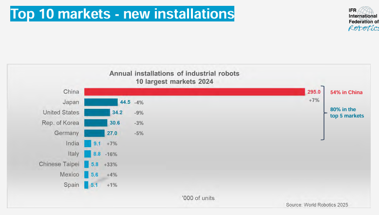 | 《2025年世界机器人报告》发布:中国市占率碾压全球,印度逆袭第六!日美韩德全线下滑