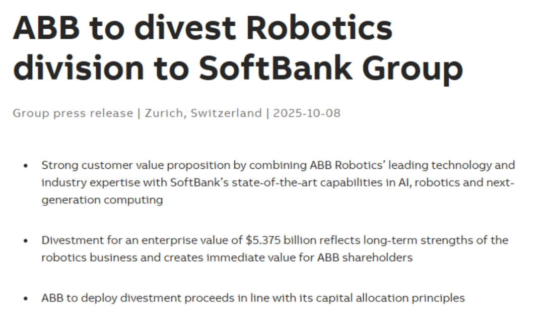 日本软银集团已与瑞士工业巨头ABB达成最终协议,以53.75亿美元(约384.5亿元人民币)收购ABB的机器人业务。这一交易于10月8日官宣,成为近年来全球工业自动化和机器人领域最为重磅的并购案。 这并非孤立的资本动作,而是软银围绕“2035年实现超级人工智能(ASI)”目标,构建“算力底座-硬件载体-场景落地-生态协同”全链条布局的关键一环。 该收购案已获得软银董事会同意,但交易尚需获得欧盟、中国、美国等地的常规监管审批并满足其他成交条件,预计在明年的中后期才会正式完成。收购完成后,ABB的机器人业务将正式成为软银集团旗下的子公司。 ABB作为全球工业机器人“四大家族”之一,拥有超过50年的技术积累和全球客户基础。其机器人业务2024年营收达23亿美元,拥有约7000名员工。 ▎十年布局,从Pepper到ABB,构建机器人集团化壁垒 软银在机器人领域的野心可追溯至十几年前。2014年,软银以约1亿美元的价格收购法国公司Aldebaran,后推出的人形机器人Pepper。 2017年,软银从谷歌母公司 Alphabet手中收购了波士顿动力(Boston Dynamics)。 但由于成本高昂和市场应用受限,Aldebaran和波士顿动力难以形成稳定盈利。 这些挫折并未熄灭软银对机器人的热情。 近年来,软银通过其规模超千亿美元的愿景基金(Vision Fund),在机器人领域进行了多笔战略性投资。包括挪威仓储机器人公司AutoStore System、美国仓储机器人公司Berkshire Grey、德国智能机器人公司Agile Robots SE和美国机器人公司Skild AI等,涵盖了物流机器人、人形机器人和机器人基础模型等多个领域。 根据最新规划,软银正将旗下与机器人相关的投资与事业整合至一个控股公司Robo Holdings,通过集中资源(约20家机器人相关企业),形成更具一致性的研发与商业策略。 此举措代表软银不再将机器人视为单纯的产品,而是把它纳入AI驱动的长期产业蓝图。孙正义在官方新闻稿中表示:“软银集团下一个新领域就是‘实体AI’(Physical AI)。” 此次收购ABB机器人业务,正是软银实现“实体AI”更广泛愿景的关键部分。 ▎生态整合,构建物理AI核心力量收购ABB机器人业务后,软银计划将这些先进技术与其现有的机器人生态系统深度融合,特别强化在汽车制造、电子装配和物流仓储等关键领域的应用能力。 软银将组建专门的技术整合团队,重点推进几个方向:将ABB机器人控制软件与软银旗下Pepper机器人的AI平台对接;整合AutoStore的仓储自动化系统与ABB的工业机器人产品线;利用软银在物联网和5G领域的投资,为ABB机器人增加边缘计算和远程运维能力。 这些举措预计将显著提高生产效率,降低制造业客户的自动化部署成本,加速工业4.0在全球范围内的落地进程。 软银旗下Arm的芯片技术与各式AI新创公司的技术成果,将与ABB机器人事业进一步整合,不仅能提高研发效率,也有望建立跨领域的竞争优势。预计未来在智能制造、物流以及服务型机器人等领域,AI 与机器人技术的融合将进一步加速。 此次收购也标志着软银机器人战略的根本转变——从追求人形机器人转向夯实工业机器人基础,从展示科技走向实际产业应用。 |