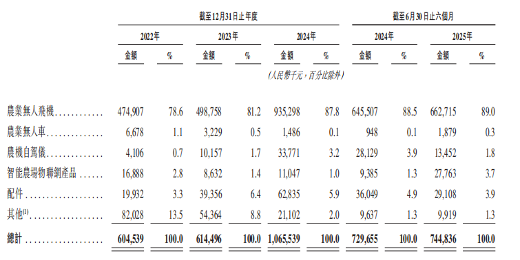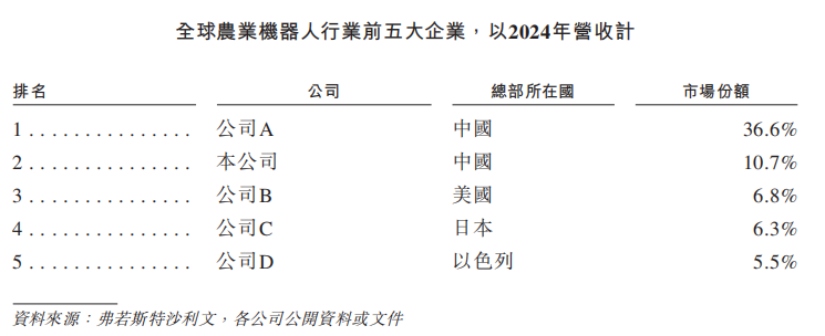 来源|LiveReport大数据 摘要:极飞科技于2025年9月25日向港交所递交招股书,拟在香港主板上市,这是公司第1次递交上市申请,独家保荐人为华泰国际。 公司是全球第二大农业无人飞机供应商。2024年收入为10.66亿(同比增长73.4%),净利润为0.7亿元(2024年实现扭亏为盈),2025年上半年收入7.45亿元,净利1.3亿元。 公司曾于2021年申请在上交所科创板上市,于2022年5月撤回A股上市申请。 公司是一家全球领先的农业机器人公司,根据弗若斯特沙利文(Frost & Sullivan)报告,2024年度公司以10.7%和17.1%的市占率于世界农业机器人和农业无人飞机行业分别排名第二。 公司主要产品是农业无人飞机、农业无人车、农机自驾仪、智能农场物联网产品、配件及其他,农业无人飞机产品在2025年上半年收入占比近九成。 公司在国内外建立销售和经销网络,通过全球近60个国家和地区的经销商销售产品,海外主要包括美洲及东南亚。 财务分析 截至2024年12月31日止三个年度2022、2023、2024及2024、2025年前6个月: 收入分别约为人民币6.05亿元、6.14亿元、10.66亿元、7.3亿元及7.45亿元,年复合增长率为32.76%; 毛利分别约为人民币1.08亿元、1.16亿元、3.4亿元、2.2亿元及2.55亿元,年复合增长率为76.91%; 净利润分别约为人民币-2.54亿元、-1.33亿元、0.7亿元、0.88亿元及1.3亿元,2024年扭亏为盈; 毛利率分别约为17.94%、18.90%、31.86%、30.22%及34.30%; 净利率分别约为-42.04%、-21.61%、6.61%、11.99%及17.52%。 来源:LiveReport大数据 公司2024年收入同比增长73.4%,净利转正,实现扭亏为盈,主要源于公司农业无人飞机销售额大幅增加。 截至2025年6月30日,公司经营活动现金流为-0.5亿,存货1.8亿,应收账款及票据0.3亿,预付款、其他应收款及其他资产0.6亿,账上现金为3.4亿。 行业前景  全球农业机器人市场规模 根据弗若斯特沙利文(Frost & Sullivan)报告,全球农业机器人行业由2019年的人民币25亿元,增长至2024年的人民币89亿元,年均复合增长率29.3%。预计到2029年,全球农业机器人行业市场规模将以53.3%的年均复合增长率增长至人民币749亿元。  来源:招股书 行业地位 根据弗若斯特沙利文(Frost & Sullivan)报告,以2024年营收计,公司在全球农业机器人行业位于第二,市场份额为10.7%,前五大农业机器人企业市场份额合计约65.9%。 来源:招股书 主要股东  彭先生持股29.01%、员工持股平台厦门极力持股13.95%、龚先生持股3.38%;软银通过SVF持股12.86%,百度通过佰山投资持股6.12%,李开复创立的创新工场通过SDF-JF持股4.5%、工商银行通过开投工融持股3.26%;广州越秀产业投资基金持股1.43%等。 来源:招股书 管理层情况 上市前融资  文章来源:弗若斯特沙利文 |