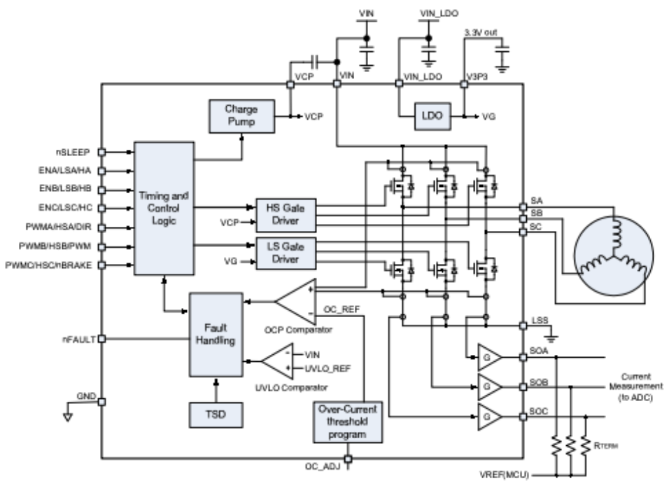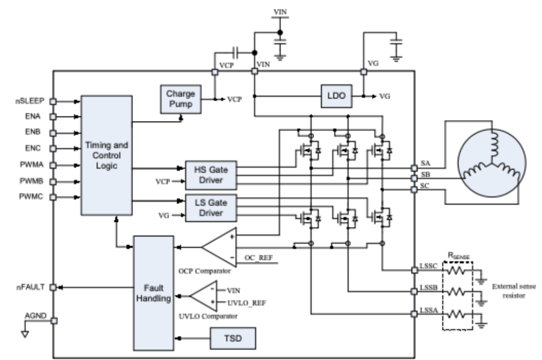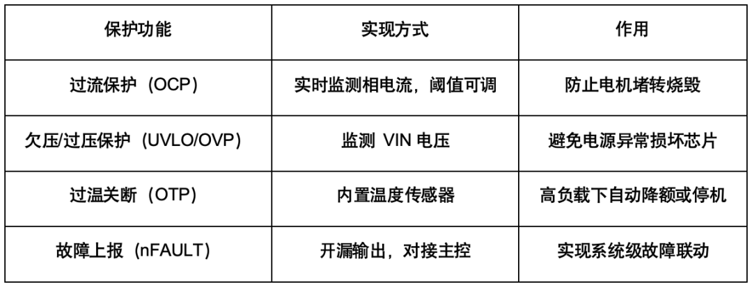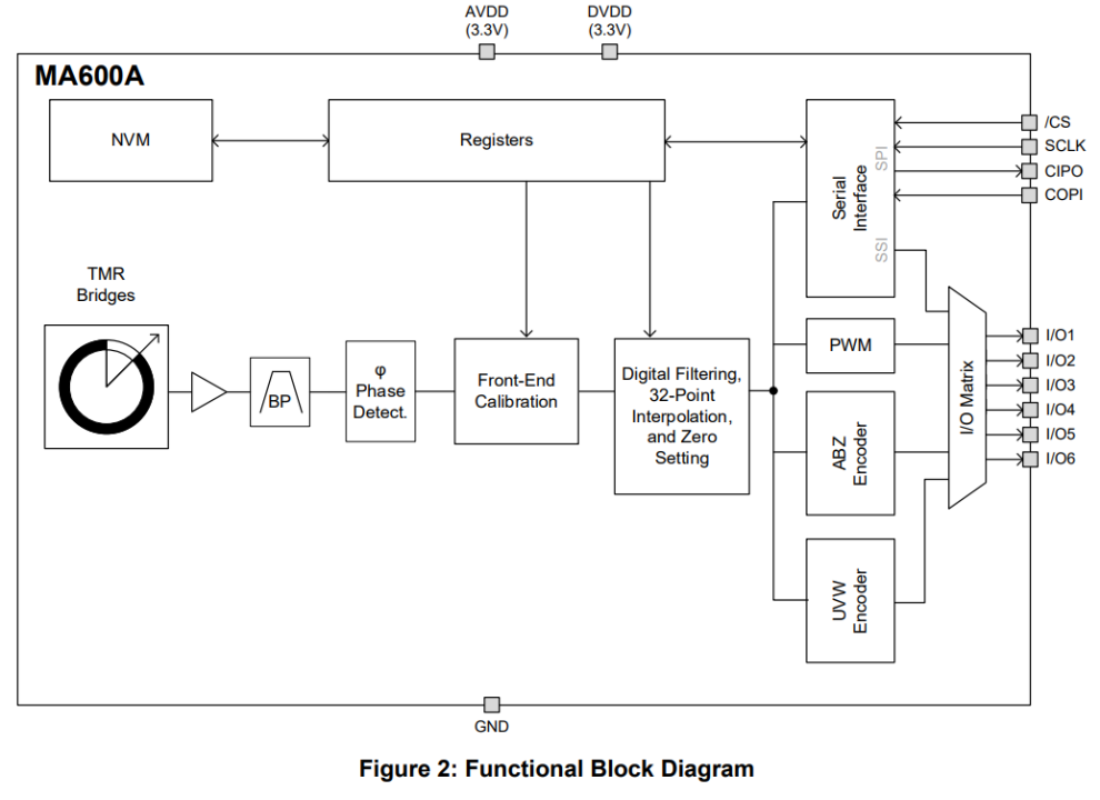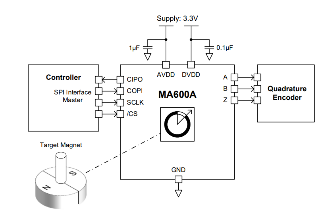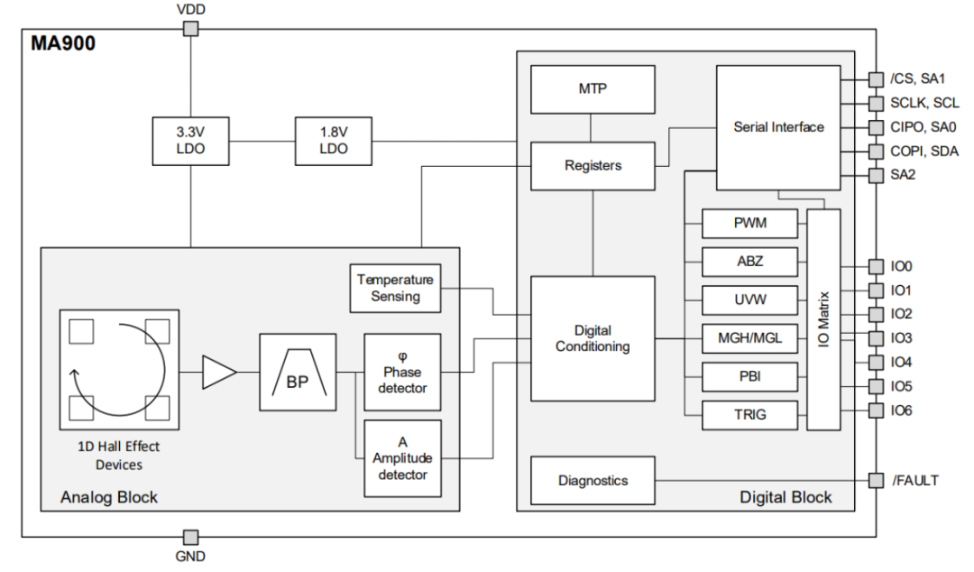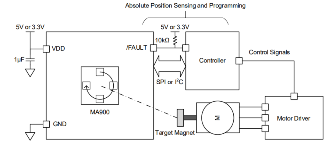 图3:人形机器人感知能力示意图 挑战三:高昂的制造成本 人形机器人的核心部件成本高昂,例如灵巧手、关节模组、传感器等关键部件的成本占比较大。 ▎MPS人形机器人解决方案面对以上挑战,MPS推出了人形机器人解决方案,除了会考虑定义产品的“杀手锏”功能,还会统一产品开发路线和整体芯片生态系统,精心设计产品使其具备更高的安全性、可扩展性和可靠性,从而帮助人形机器人制造商实现其具身智能的目标。 电机驱动芯片:运动能力与稳定性的核心基础首先,人形机器人运动能力与稳定性问题的关键,在于电机模组的控制。为此,MPS推出了针对三相无刷直流电机的MP(Q)6547A、MP6543电机驱动器芯片。 其中,MP(Q)6547A具备较高的电压范围,工作电压从4V至32V。在驱动能力方面,MP(Q)6547A内部集成了3个半桥驱动器,6个低内阻MOSFET,其中高边MOSFET内阻60 mΩ,低边MOSFET内阻50mΩ,连续输出电流可达3A,峰值电流可达6A。 同时,为了使得开发更加便捷,MP(Q)6547A内部充电泵支持100%占空比工作,具备自动同步整流功能。在故障检测方面,MP(Q)6547A具有输出故障提示,欠压锁定保护 (UVLO) 和过压保护 (OVP),过温关断保护 (OTP),过流保护 (OCP)功能。该芯片封装采用QFN-18 (3mmx4mm) 封装,具有可润湿侧翼,可以在提高散热能力的同时减小PCB占板面积。 图4:MP6547应用框图 而对于低电压范围低功耗的机器人应用场景,MPS还推出了三相无刷直流电机驱动芯片MP6543。MP6543的工作电压范围是3V至12V,内部同样集成了3路半桥驱动器,其中每个MOSFET内阻110mΩ。 为了便于控制,MP6543支持PWM与ENBL输入,支持霍尔信号输入,内置3.3V/100mA LDO调节器,支持内部充电泵100%占空比工作,具备自动同步整流功能。 同时,为了便于进行目标电流检测,MP6543还集成了双向电流检测放大器。封装采用QFN-24封装,极大的节省了PCB空间。 图5:MP6543 应用框图 传感器:机器人精准控制的关键然而,要让机器人更加灵活,只有电机驱动是不够的,还需要各种传感器来为机器人提供对外界的感知。 在诸多纷繁复杂的传感器品类中,角度传感器格外的重要。它可以提供手指转动的角度反馈,让每根手指能够执行精确的位置控制,并协调多指间的运动。例如机器人用灵巧手抓取一个物体,就需要各个手指,分别按照预定的角度来包裹物体,听上去简单,实现起来却很难,如果精度稍差,就可能抓不稳或用力不均,导致打滑。 传统的角度传感器,很多是基于霍尔效应来实现的,工作范围内的精度通常在1度左右(经校准后可达0.2度),这对于手指而言,还不够灵巧,对于未来的机器人,肯定需要更高精度的角度传感器。 为此,MPS推出了基于磁阻效应的TMR传感器:MA600A。其工作范围内的精度小于0.6度,经校准后的最终误差 (INL) 可小于 0.1度,无噪声分辨率可达12位至15位,带宽也高达12kHZ。 MA600A的工作电压为3V至3.6V,通信接口支持SPI、ABZ、PWM、UVW以及SSI,适用于多种通信协议场合。其支持菊花链配置,配置更加灵活,通过AEC-Q100认证,安全可靠。 同时为了减小体积,MA600A采用QFN-16封装,直径只有3mm,可以轻松装配到灵巧手中的各个位置。考虑到不同机器人的机械结构差异,MA600A可以支持同轴或离轴安装,可以适配不同的机械结构。 图6:MA600A 图7:MA600A应用框图 但是直接测量的磁传感器较容易受到外界干扰,对于机器人灵巧手而言,其内部有多个电机,会产生多种电流,这会导致产生邻近的杂散磁场。 针对这一问题,差分传感器可以很好的解决。为此,MPS推出了非接触式、高精度磁性绝对角度位置差分传感器MA900。其通过传感器 IC 上多个位置的磁场差异来提取角度数据,这种差分方法消除了寄生磁场的影响,通过多点采样和差分测量的方式,来消除外界干扰磁场和某些共模误差,实现更稳定的角度测量,让机器人能在更复杂的环境中工作。 MA900提供两种供电电压,3V至3.6V和4.5V至5V。通信接口支持SPI、I2C、ABZ、PWM、UVW、SSI、SENT,可适配多种电压与通信协议场景。在故障检测方面,MP900还可配置磁场强度检测,便于诊断检查。 MA900符合AEC-Q100认证,安全可靠。其封装采用QFN-16与QFN-32,尺寸较小,节省了PCB面积。 图8:MA900 图9:MA900 应用框图 高性能、高集成度电机驱动解决方案除了上述针对单一功能的应用场景外,MPS还提供了一套面向未来的高性能、高集成度电机驱动解决方案,可以在高功率密度、低噪音、快速响应的基础上,在有限空间内实现高度集成与智能控制,以适应人形机器人向类人化、自主化、轻量化发展的趋势。 1.高度集成:MCU + 驱动 + 功率器件“三合一”合封方案 为应对人形机器人对小型化、模块化关节设计的严苛要求,MPS推出了基于系统级封装(SiP)与合封技术(Co-Packaging)的微型伺服驱动模组。 集成MCU的智能驱动方案: MPS将专用控制MCU(如基于ARM Cortex-M系列架构)与电机驱动IC(如MP(Q)6547A / MP6543)以及功率MOSFET进行同封装集成,形成“驱动+控制+功率”一体化模块。