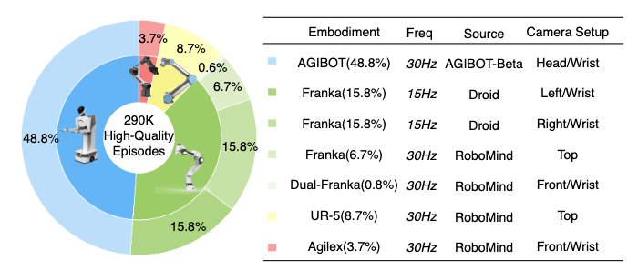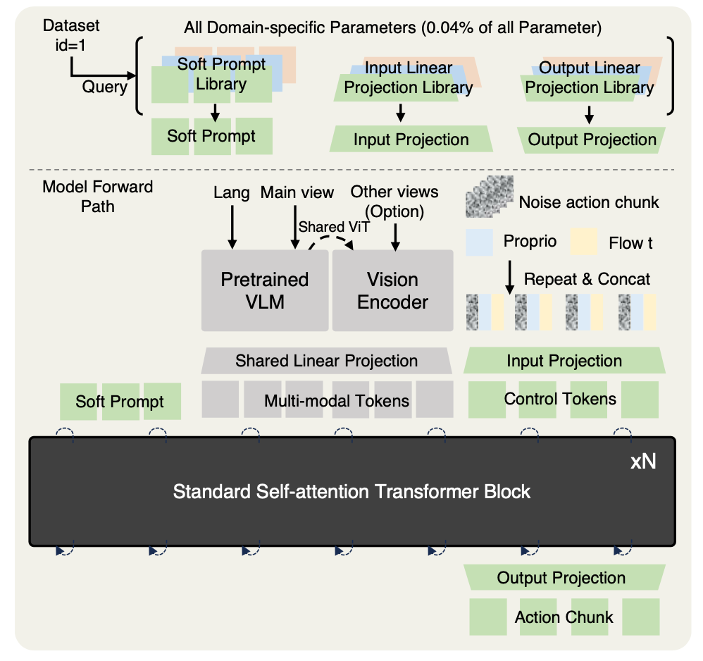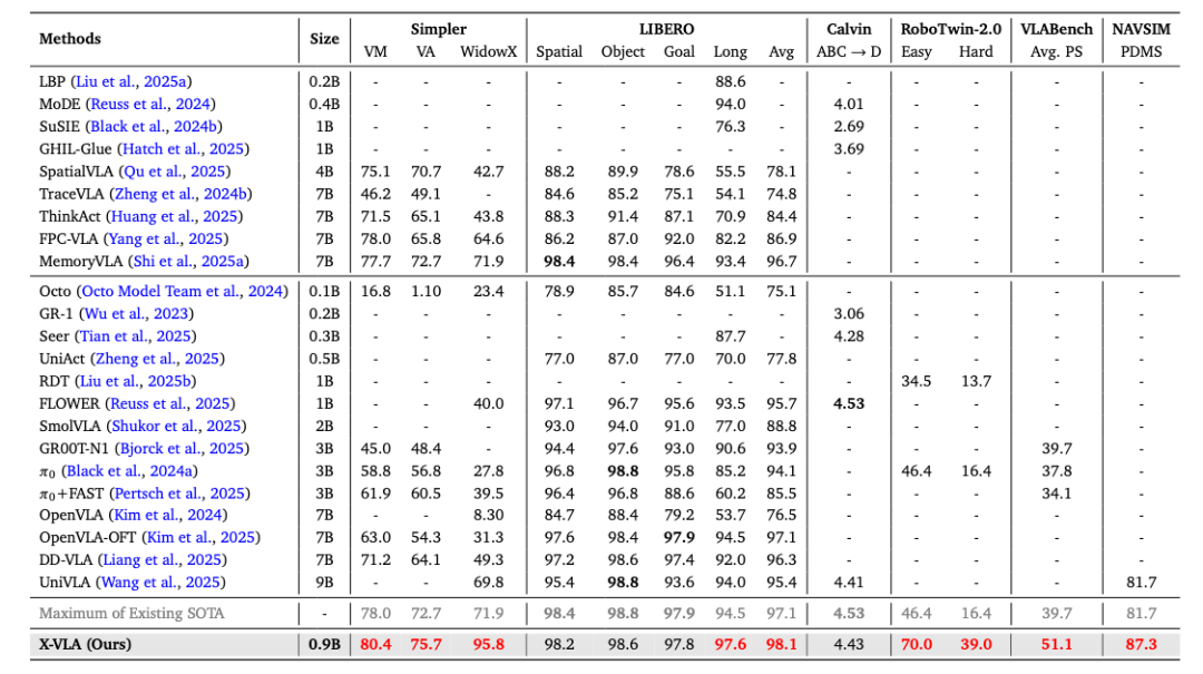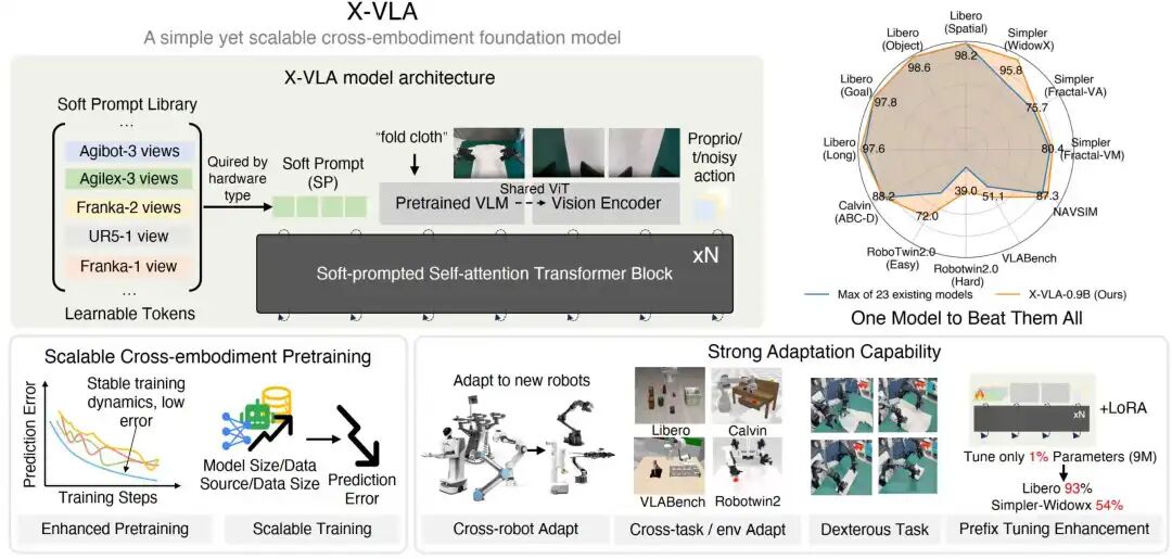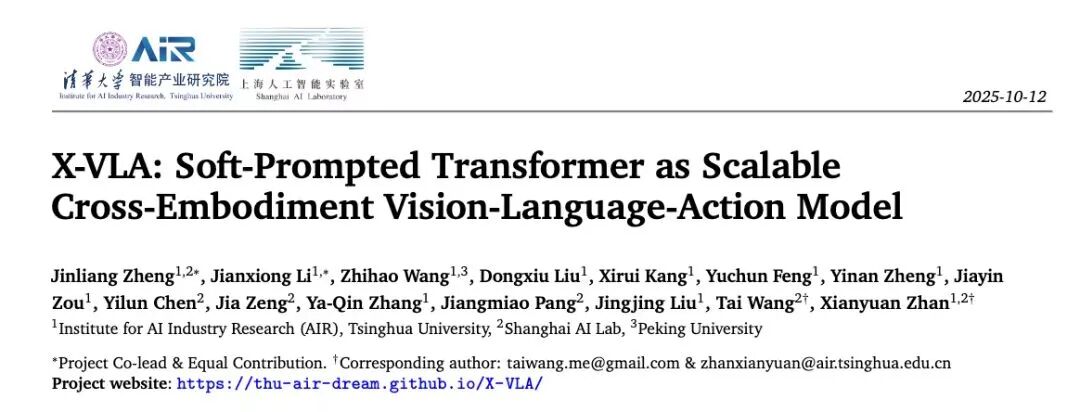 机器人也是卷疯了! 不仅能叠衣服,而且一干就是俩小时,且全程无任何辅助。 清华大学智能产业研究院(AIR)与上海人工智能实验室联合发布通用跨本体具身基座模型X-VLA,通过创新的Soft-Prompt机制、高效的框架设计与定制化训练范式,显著提升预训练效率与模型性能。 更关键的是,X-VLA是首个实现120min无辅助自主叠衣任务的全开源模型(公开数据、代码与参数),以仅0.9B的参数量在五大权威仿真基准上全面刷新性能纪录。 核心方法为克服不同机器人平台在自由度、相机观测视角等本体参数上的差异,研究引入了可学习的Soft-Prompt。 该机制动态地将具身本体的硬件配置信息编码为一种连续表征,使模型在预训练中能够解耦任务策略与具体执行器,从而显著增强模型对异构机器人平台的适应能力,并提升混合数据训练的稳定性与效率。 针对机器人任务中多源视觉输入的异质性,研究团队提出了分治编码方案。 任务相关的主视角图像由高性能视觉-语言模型编码,以提取高层语义特征;而主要提供低层次空间反馈的辅助视角,则通过轻量化的网络进行局部特征提取。 该策略在保证信息完整性的前提下,优化了计算资源的分配,提升了模型的信息处理通量。 模型主干采用标准Transformer架构,以确保良好的扩展性与通用性。动作生成模块摒弃了传统的确定性输出策略,转而采用先进的flow-matching,以概率生成的方式建模机器人动作序列。 该方法显著增强了动作轨迹的平滑性与对不确定环境的鲁棒性,为长时序任务的成功执行奠定了坚实基础。 在预训练阶段,研究采用大规模高质量异构数据,主要特点如下所示: 平衡化数据采样:定制数据采样策略,确保异构数据集的均衡训练,避免模型偏斜。 多模态数据清洗与时空对齐流水线:团队对原始机器人操作数据实施了严格预处理,包括:将不同空间下的动作数据统一映射至标准任务空间;对高频率采集的数据进行时序层面的对齐与重采样。 此流程极大提升了状态-动作序列在时间上的一致性逻辑与整体质量。 以语义-动作对齐为导向的数据遴选标准:团队确立了严格的数据质量门槛,核心是筛选视觉帧清晰、语言指令描述精准且与后续动作序列高度关联的数据样本。 此举从源头上确保了模型学习到的是有明确因果关系的“行为知识”,而非浅层的虚假关联。 在后训练阶段,研究主要在两个方面进行了调整。 分层分组的自适应学习率调整 鉴于模型中不同组件(如预训练冻结的VLM、新引入的Soft-Prompt、主干Transformer等)的参数规模与收敛特性各异,团队为其施加了分组别、差异化的学习率调度策略。 该设计既保护了预训练获得的基础知识,又允许关键适配层快速调整,从而在保证训练稳定性的同时,大幅优化了收敛效率。 面向异构模块的渐进式 warm-up 策略 对于模型中新引入的可学习参数(如Soft-Prompt),团队在训练初始阶段采用线性递增的学习率热身机制,使其参数空间得以平稳初始化,再逐步融入全局优化过程。 该策略有效避免了训练初期因梯度剧变导致的不稳定性,尤其适用于异构模块的协同训练。 实验结果高效预训练:可扩展的架构优势可扩展的架构优势X-VLA的预训练缩放定律(Scaling Laws)曲线呈现出优异的线性增长趋势。这表明,随着模型参数以及训练数据规模的同步扩大,其在测试集的开环测试性能呈现稳定、可预测的提升。 这一现象验证了所提出的Soft-Prompt机制与简洁Transformer架构的强大可扩展性,为构建更大规模的具身智能基座模型奠定了坚实基础。 数据与算法的协同优化得益于高质量的预训练基座,X-VLA在后训练(微调)阶段展现出极高的数据效率与稳定性。针对不同的下游任务(如自主叠衣),只需使用中小规模的场景专属数据进行微调,模型便能快速适应并达到SOTA性能。 这源于预训练阶段学习到的通用视觉-语言-动作表征,以及后训练中采用的定制化学习率策略与慢启动机制,它们共同确保了知识从通用域到特定任务的高效、稳定迁移。 X-VLA除了在包括LIBERO、SIMPLER等在内的权威仿真环境中取得SOTA表现外,在真实的机器人平台上,该模型也在大量简单抓取和桌面操作任务中展现了强大性能,并成功完成了无限时长的自主叠衣任务,展示了其应对复杂长程任务的卓越能力。 |