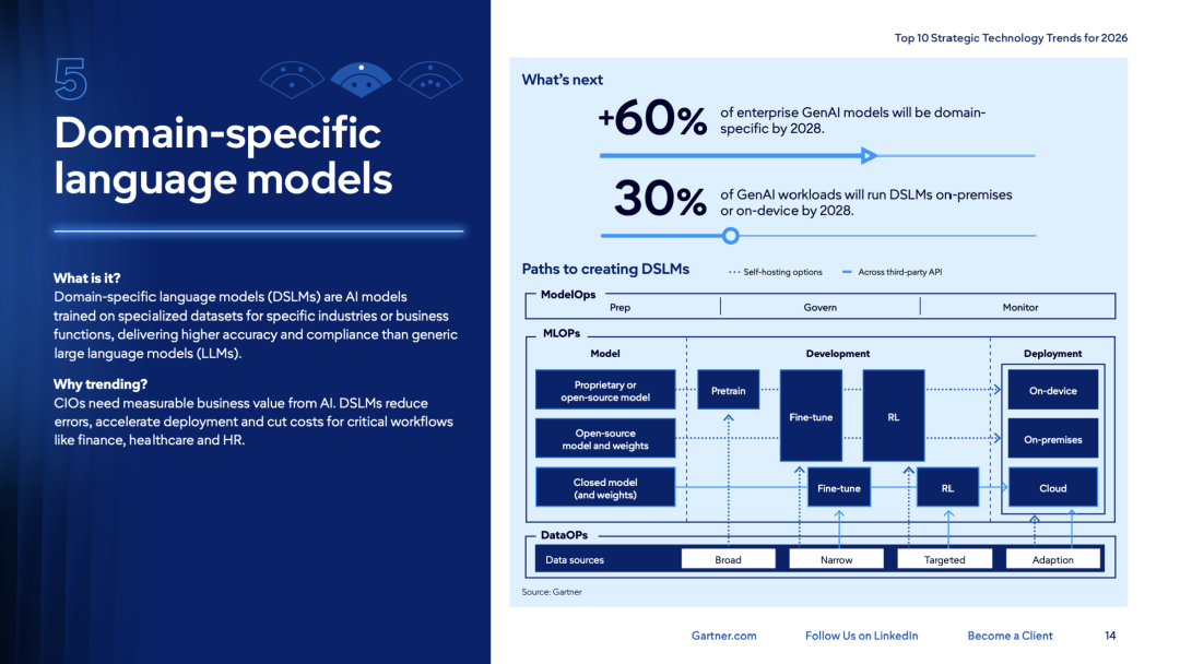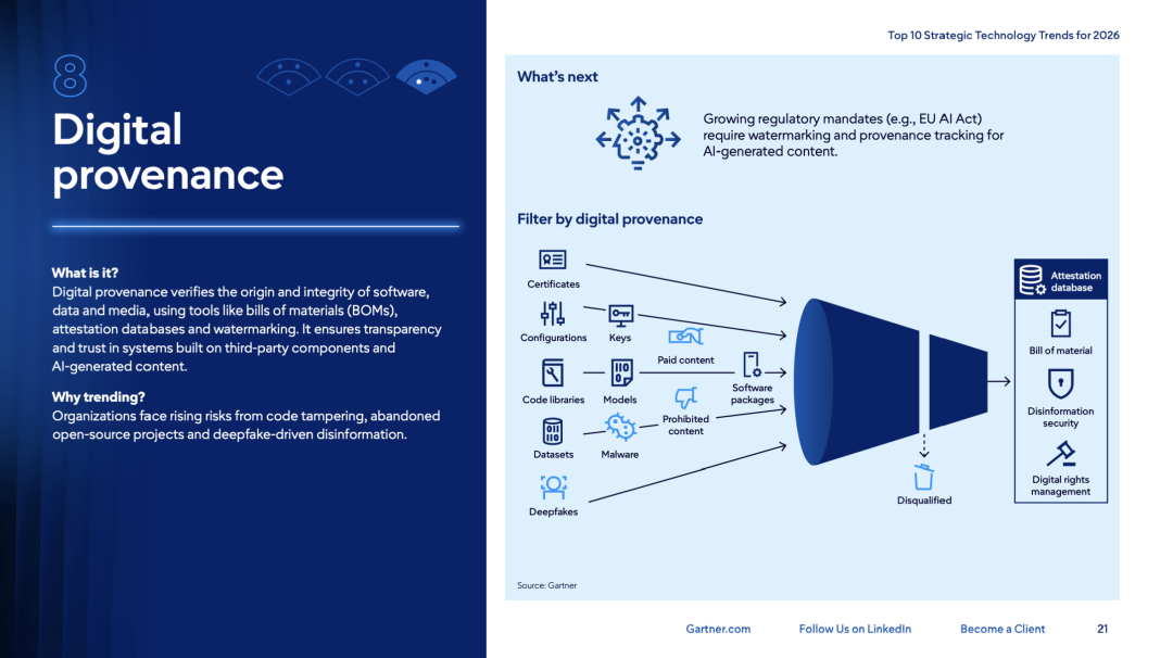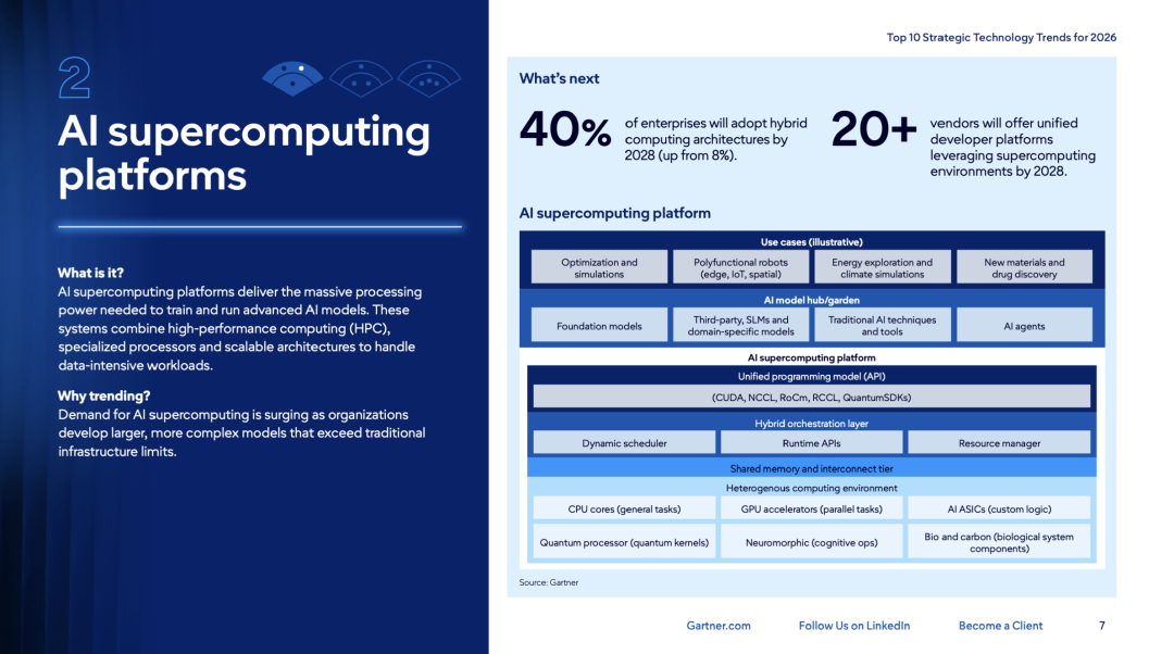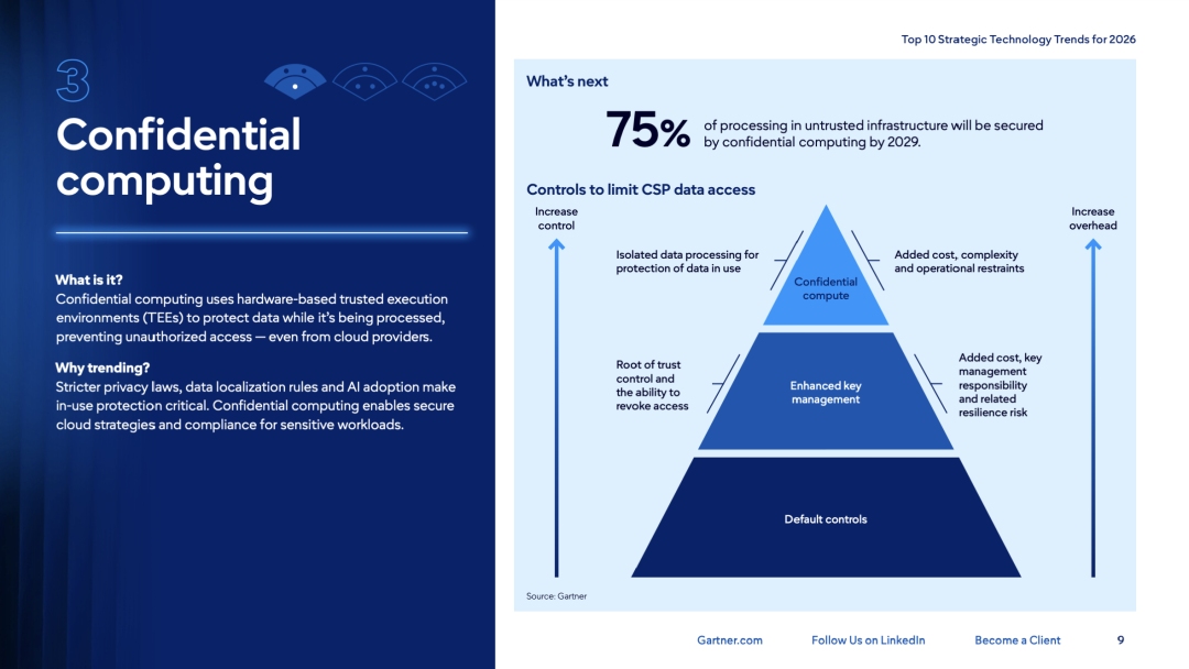 AI超级计算平台整合了CPU、GPU、AI ASIC、神经系统计算和替代性计算范式,使企业能够统筹复杂工作负载,同时释放更大的性能、效率与创新潜力。这些系统融合了强大的处理器、海量存储、专用硬件及编排软件,可处理机器学习、仿真模拟和分析等领域的数据密集型工作负载。 Gartner预测,到2028年,将混合计算范式架构应用于关键业务流程的领先企业将达到40%以上,较当前8%的水平大幅增长。 高挺表示:“该技术已在推动各行各业的创新。例如医疗和生物技术企业已将新药建模时间从之前的数年缩短至仅需数周;金融服务机构通过模拟全球市场降低了投资组合风险;在公共事业领域,服务商通过建立极端天气模型提升电网性能。” 多智能体系统(MAS)是由多个AI智能体组成的集合,它们通过交互实现复杂的个体或共同目标。这些智能体既可在单一环境中交付,也可在分布式环境中独立开发部署。 高挺表示:“通过使用多智能体系统,企业可实现复杂业务流程的自动化、提升团队技能并开创人类与AI智能体的新协作方式。采用模块化设计的专业智能体通过在各工作流中重复使用成熟解决方案提升效率、加快交付速度和降低风险。这种方案还便于扩展运营规模和快速适应需求变化。” 首席信息官(CIO)和首席执行官(CEO)正要求AI创造更多商业价值,但通用大语言模型(LLM)往往难以胜任专业任务。特定领域语言模型(DSLM)凭借更高的准确性、更低的成本和更好的合规性填补了这一空白。DSLM是在针对特定行业、功能或流程的专用数据上训练或微调的语言模型。不同于通用模型,DSLM能更加精准、可靠且合规地满足特定业务需求。 Gartner预测,到2028年,企业使用的生成式AI(GenAI)模型中将有超过半数属于特定领域模型。 高挺表示:“上下文正成为决定代理部署成功与否的关键因素之一。基于DSLM的AI代理可解读特定行业的上下文,即使在陌生场景中也能做出合理决策,因而具有出色的准确性、可解释性和决策合理性。” AI安全平台为第三方及定制AI应用提供了统一防护机制,它能够进行集中监测、强制执行使用策略并有效防范AI特有风险,如提示注入、数据泄露、恶意代理行为等。此类平台可帮助CIO有力执行使用政策、监控AI活动并在全AI系统中建立统一防护边界。 Gartner预测,到2028年,使用AI安全平台保护AI投资的企业比例将达到50%以上。 AI原生开发平台使用GenAI实现空前快速、便捷的软件开发。进入业务部门的软件工程师作为“前沿部署工程师”可使用这些平台协同领域专家开发应用。企业只需维持现有开发人员规模,通过组建微型团队配合AI即可开发更多应用。目前,领先的企业正在组建微型平台团队,在安全和治理框架范围内让非技术领域专家能够自主开发软件。 Gartner预测,到2030年,80%的企业将通过AI原生开发平台将大型软件工程团队转变为更小、更敏捷的团队并通过AI赋能这些团队。 机密计算重塑了企业处理敏感数据的方式。由于工作负载被隔离在基于硬件的可信执行环境(TEE)中,因此即使面对基础设施所有者、云提供商或任何拥有硬件物理访问权限的实体,机密计算也能保持内容与工作负载的私密性。这对受监管行业、面临地缘政治与合规风险的跨国公司以及竞争对手间的合作尤为重要。 Gartner预测,到2029年,75%以上在非可信基础设施中处理的业务将通过机密计算保障使用安全。 物理AI通过赋能具有感知、决策和行动能力的机器与设备(例如机器人、无人机和智能设备),将智能带入到现实世界。它能为自动化、适应性和安全性至关重要的行业带来可观的收益。 随着该技术的日益普及,企业需要融合IT、运营与工程知识的新型技术人才。这一转变虽带来了技能提升与协作机会,但也可能引发人们对就业的担忧,因此需要采取谨慎的变革管理。 随着企业面临的网络、数据及联网系统威胁成倍增长,前置式主动网络安全正成为趋势。Gartner预测,到2030年,随着CIO从被动防御转向主动防护,前置式主动防御解决方案将占到企业安全支出总额的一半。 高挺表示:“前置式主动网络安全的核心在于运用AI驱动的安全运营、程序化阻断与欺骗技术在攻击者行动前实施干预,这项技术通过预测实现防护。” 随着企业日益依赖第三方软件、开源代码及AI生成内容,数字溯源验证已成为一项重要的需求。数字溯源指对软件、数据、媒体及流程的来源、所有权和完整性进行验证的能力。企业可使用软件物料清单(SBoM)、认证数据库、数字水印等新工具验证和追踪供应链中的数字资产。 Gartner预测,到2029年,在数字溯源方面投入不足的企业将面临高达数十亿美元的制裁风险。 地缘回迁指企业因考虑到地缘政治风险而将数据与应用从全球公有云迁出至主权云、区域云服务商或自有数据中心等本地平台。云主权这一概念曾仅限于银行与政府机构,如今随着全球局势动荡加剧而影响到各类企业。 高挺表示:“将工作负载转移至主权立场更强的服务提供商可帮助CIO加强对数据驻留、合规及治理的控制力。这有助于提高对本地法规的遵从性并获得关注数据隐私或国家利益的客户的信任。” Gartner预测,到2030年,欧洲和中东地区将有超过75%的企业把虚拟工作负载回迁至降低地缘政治风险的解决方案,而2025年的这一比例不足5%。 两年趋势对比一览 综合以上的对比,我们可以清晰地看到Gartne