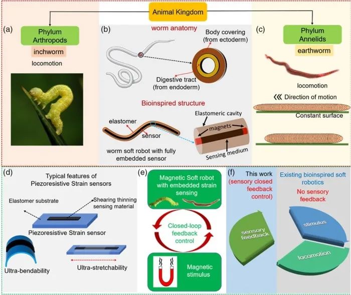 研究配图-1:具有无缝嵌入式传感器的仿生蚯蚓/尺蠖概念图 研究人员指出,得益于灵活的电子设备和简短的传感器,这些具有弹性的新型机器人能够更好地穿过狭窄空间。 此前,我们已经见到过其它一些受蠕虫和爬虫启发的软体机器人,比如使用人造肌肉在地板上爬行的 Meshworm,以及挖掘地表土壤的农业应用类机器人。 不过来自格拉斯哥大学的工程师们,却通过模仿所谓的生物体感(proprioception)功能,让软体机器人开辟了空间感知的新领域。 研究人员指出,此前这项能力从未在软体机器人上得到实证,因其需要创造性地将必要的电子设备和传感器组合到一起。