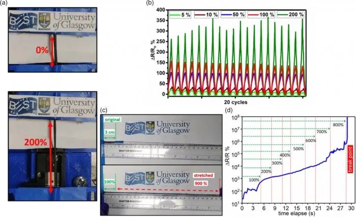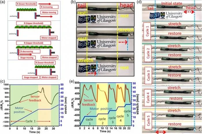 研究配图-2:动态应变响应电阻的0~200%受控拉伸 据悉,机器人外部皮肤由名为 Ecoflex 的弹性塑料、以及研究团队开发的新型石墨糊制成,并在身体两端嵌入了约 4.5 厘米(1.7 英寸)长的微型磁铁。 石墨糊带有电阻,且会随着机器人身体的拉伸而变化。而内置于体内的应变传感器,又能够测量这些变化、并检测其何时达到预设值。