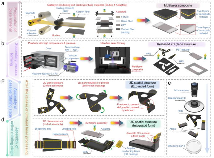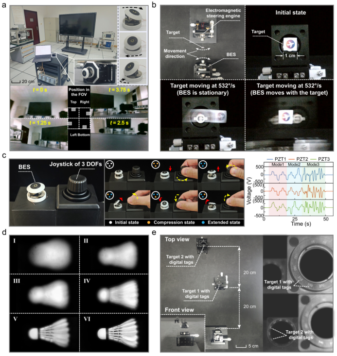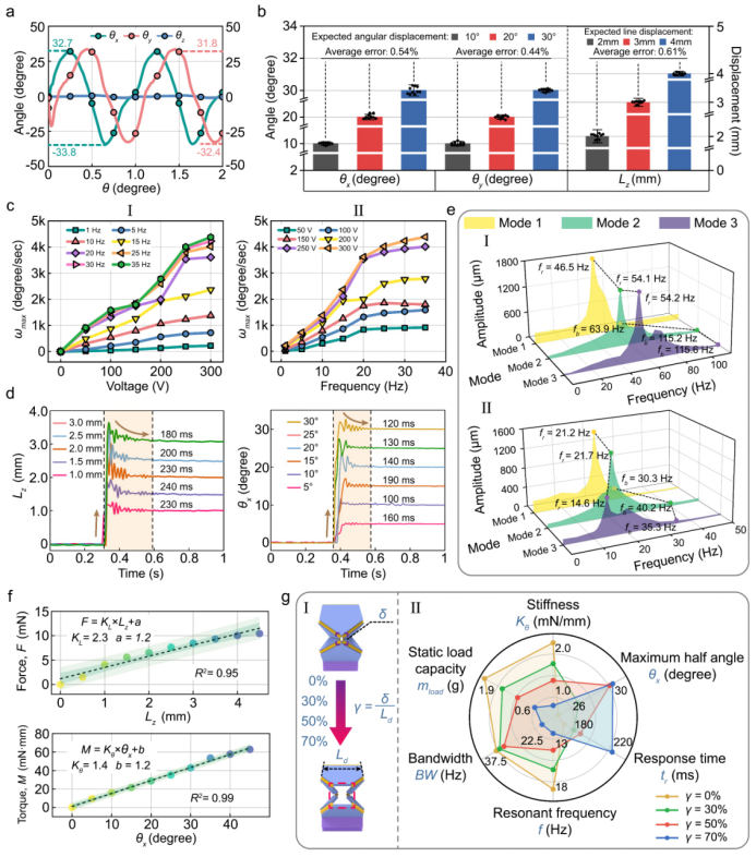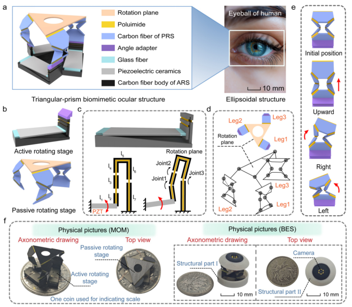 研究背景: 得益于广角自适应调节、高速动态响应以及自主决策与感知能力,近年来机器视觉系统在通用人形机器人、虚拟现实和智能辅助驾驶等新兴领域展现出显著优势,并受到广泛研究关注。仿生视觉系统通过模拟生物眼睛的宽视场调节与快速运动跟踪机制,已成为人形及仿生机器人领域极具前景的视觉解决方案。受生物眼球结构与功能的启发,研究人员在提升机器视觉系统的成像分辨率与环境适应性方面取得了重要进展。然而,这类融合了光学、机械、电子与计算等多领域技术的高集成度智能微系统,仍面临诸多挑战。目前,受制于传统运动部件的制造方法与驱动方式,视场调节机构的高集成化设计仍主要依赖全刚性结构与微型驱动电机。此类结构通常体积较大(数十立方厘米量级)、重量较重(数百克),严重限制了机器人头部的有效负载能力,并阻碍了其在对于尺寸、重量较为敏感平台(如紧凑型仿生机器人)上的应用。因此,开发能够在光学成像系统、视场调节机构与目标识别算法之间实现协同优化与多维性能深度集成的仿生视觉系统,具有重要的科学研究意义与工程应用价值。该系统应兼具轻量化紧凑型结构、高分辨率成像能力、大视场多自由度动态调节特性以及强大的环境适应性。 论文信息: 近日,国防科技大学智能科学学院吴学忠教授与肖定邦教授团队受人类眼部生理结构启发,研制出一种基于三自由度折纸机构的新型仿生眼球系统(BES),成功突破了传统机电式仿生眼球在物理尺寸与功能集成度之间难以权衡的技术瓶颈。BES在视场调节能力方面达到人眼水平,单眼视场范围超过151.6° × 151.6°,整体尺寸仅为Φ23 mm × 15 mm,重量仅为1.8 g。此外,BES在实现高度轻量化的同时保持了优异的功能集成度:在运动与成像性能方面,BES展现出高速扫视能力(4382°/s)与高动态追踪能力(532°/s),并支持人机协同交互控制与主动变焦功能;在基于视觉注意机制的主动目标锁定实验中,BES展现出类人眼水平的平滑追踪能力,能够有效完成对目标的识别、锁定与跟踪任务。通过融合空间适应性、运动兼容性与认知决策能力,该研究成功实现了仿生视觉系统在微型化与功能完整性之间的协同优化,为解决高集成度视觉系统的设计挑战提供了新方案,相关研究已发表于 Advanced Science。 图文导读: 图1.仿生眼球系统(BES)。a. 基于光学-机械-计算协同设计的系统架构,包含视场调节机构、光学成像系统与图像处理算法,各子系统均需实现多性能指标的协同平衡。b. 实现克级重量与毫米级尺寸协同优化的技术路径:一种结合智能复合微结构/折纸技术的多尺度制造与压电驱动的协同方法。c. 基于折纸技术的平面复合材料加工工艺,通过选择性减材制造实现刚柔耦合微结构。d. 人眼解剖结构示意图,包括瞳孔-晶状体成像系统、巩膜保护层及实现动态视场调节的六条眼外肌。e. BES与人眼实际尺寸对比。f. 具备解剖等效特征的BES,集成了微摄像头、压电驱动的微型折纸机构(MOM)、仿巩膜支撑结构与仿眼外肌支撑结构四大核心模块。g. 基于仿生眼球的仿生双目视觉系统(BVS)在完全解耦模式下的广角成像能力展示。h. 系统在非结构化环境中的扩展应用演示,包括多目标检测、路径规划与人机交互(图片已获官方授权) 图2. MOM的结构特性与仿生设计原理。a. 模拟人眼椭球几何形态的三棱柱型折纸机构(部分图片已获官方授权)。b. 单个MOM系统集成了一个具有三条运动支链的被动旋转平台(PRS)与三个主动旋转平台(ARS)。c. 采用单压电驱动方式的主动四连杆旋转平台。d. PRS的多自由度运动链设计,每条支链包含七个旋转关节。e. PRS单条运动支链的运动学解耦展示,可实现独立的线运动与角运动。f. MOM与BES的实物图,采用单枚硬币用作尺寸参照 图3.BES的多模态机械特性表征。a. 双自由度旋转角位移的动态响应。b. 阶跃位移重复性验证(组内重复次数n=10)。c. 驱动频率—电压耦合作用下的峰值角速度特性(I:恒频变幅响应;II:恒幅扫频响应)。d. 轴向线位移与转向角位移的阶跃响应。e. 集成系统与非集成系统的频域特性对比(I:MOM;II:BES)。f. 通过准静态加载测试表征的轴向与转向刚度特性。g. 基于几何参数γ(γ = δ/Ld)的角位移优化(I:γ 在0–70%范围内的拓扑演变;II:六维性能指标对比分析) 图4.多场景下的开环控制性能验证。a. 宽视场动态扫描成像。b. 高动态运动目标成像(532°/s)。c. 人机协作下的实时交互操作。d. 单目标主动变焦验证(I–VI:由模糊至清晰的变焦过程)。e. 不同距离目标的主动变焦验证(通过焦距调整实现对远近标记物体的清晰成像) 图5.BES的闭环反馈控制性能验证。a. 闭环实验平台架构(集成多摄像头的运动捕捉系统:OptiTrack PrimeX 41)。b. 轴向线位移(±2.5 mm,步长0.5 mm)与俯仰角位移(±20°,步长4°)的阶跃响应特性。c. 位移跟踪性能(输入信号频率0.2 Hz,相位延迟小于90 ms)。d.集成一对BES的仿生面部平台。e. 基于视觉注意机制的多目标识别与锁定。f. 主动目标锁定过程中的视觉偏差(以像素距离量化相机视场中心与目标中心之间的偏移)。g. 基于视觉注意机制的单目标跟踪验证(测试对象:单个移动的气球) 图6.MOM的动态相位协同调节机制。a. 多模态驱动下的相位调控策略;b. 多模态下的输入电压波形(以正弦信号为例);c. 多模式下位移的数值仿真:单自由度轴向平移模式可实现±5.3 mm的线行程,