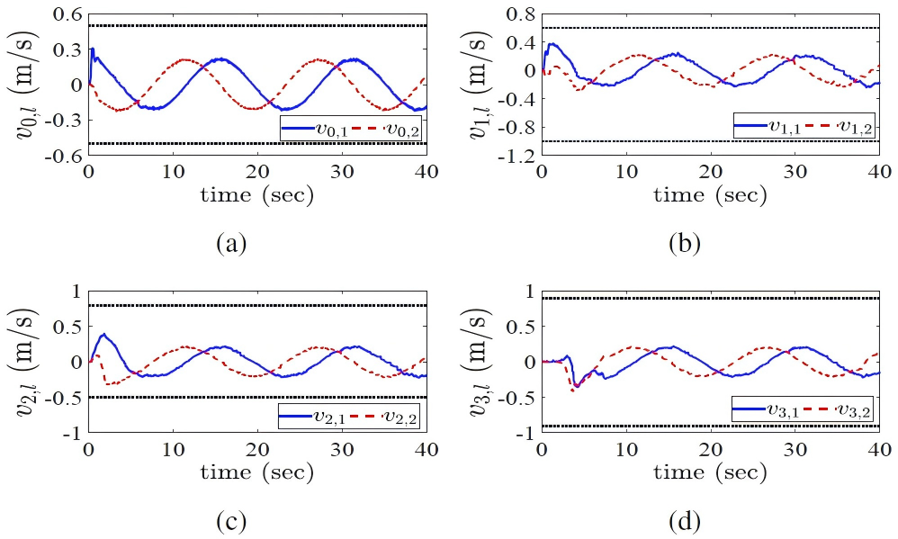 (2) 在考虑速度约束的情况下,设计了一种约束分布式参考信号发生器,该发生器不仅为各跟随者智能体生成与领导者智能体可实现渐近一致性的参考信号,而且考虑了速度约束条件,使由发生器生成的各跟随者智能体参考速度满足各自约束条件;