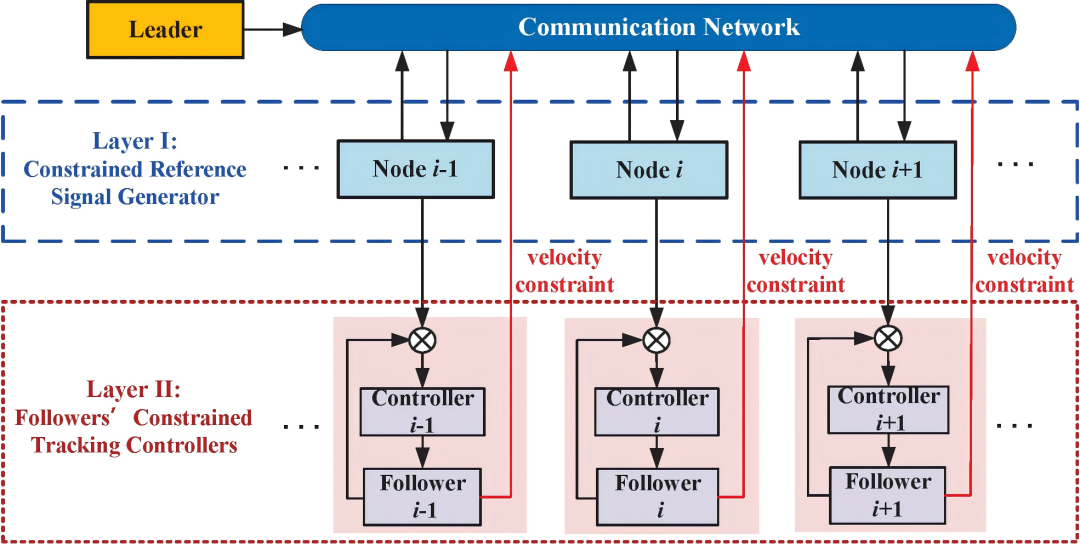 论文基于分层协同控制框架提出了一种新型两层式约束协同控制方案,研究了速度受限领导者-跟随者二阶多智能体系统的一致性问题,具体设计包括约束分布式参考信号发生器设计和各智能体速度约束跟踪控制器设计。