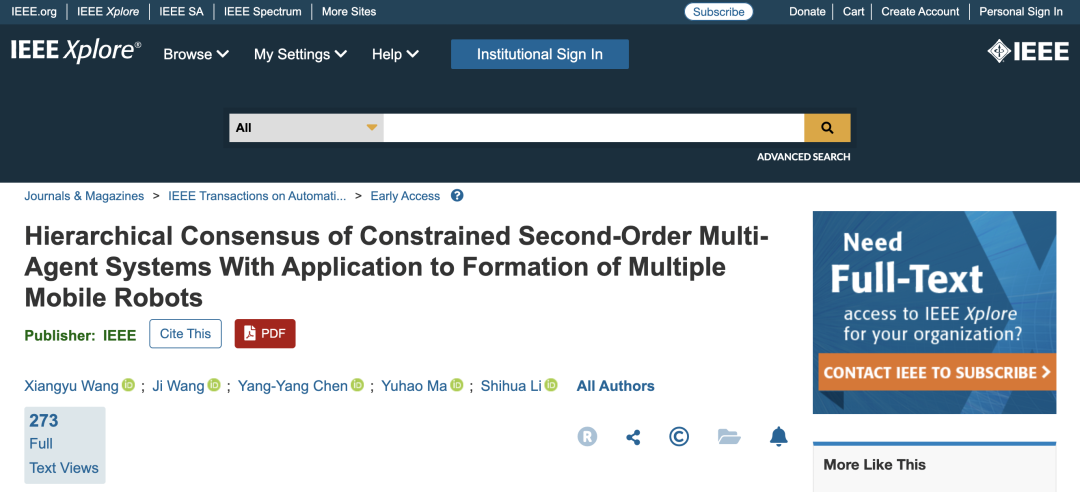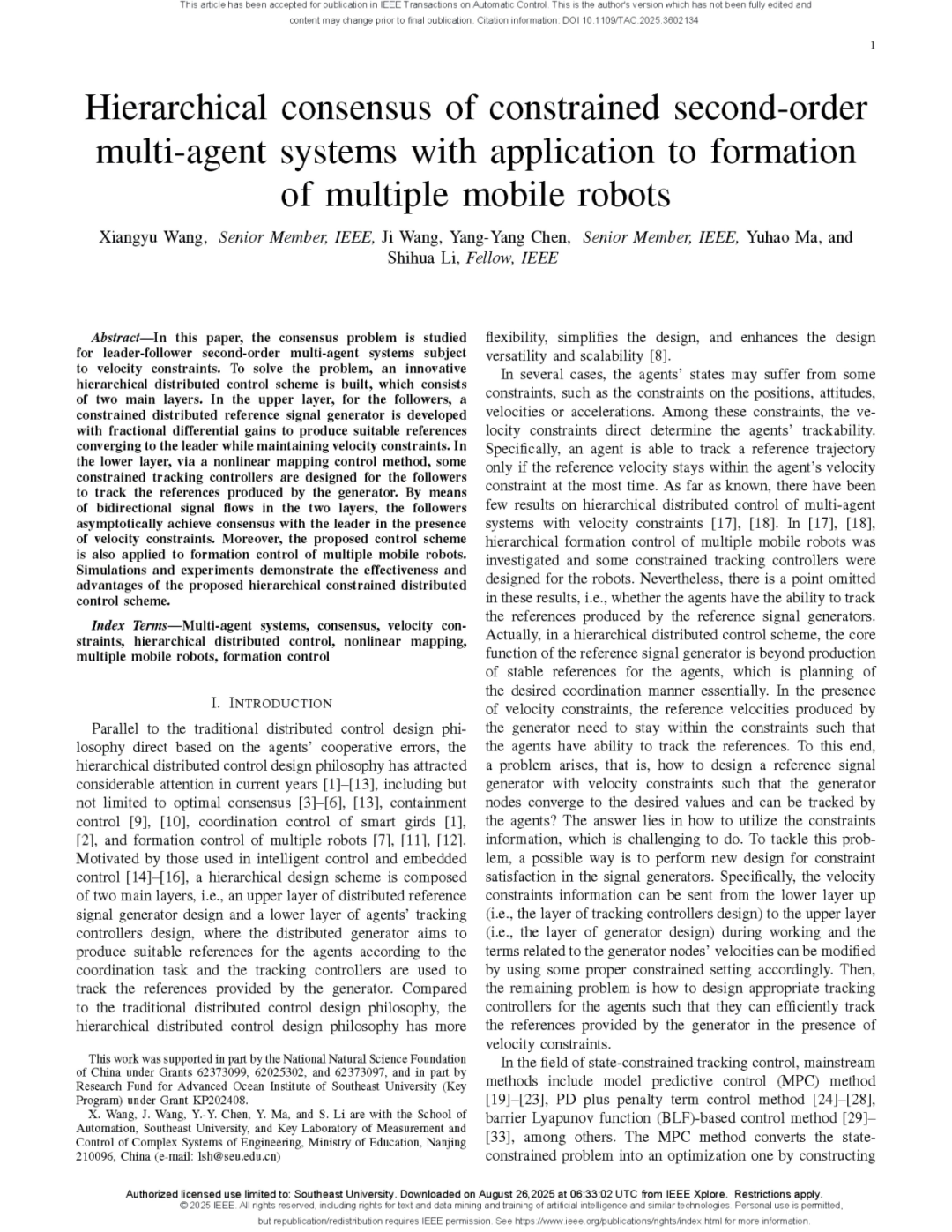 近日,东南大学自动化学院机电系统控制实验室(MSCL)李世华教授、王翔宇教授团队的研究论文“Hierarchical Consensus of Constrained Second-Order Multi-Agent Systems With Application to Formation of Multiple Mobile Robots”(受限二阶多智能体系统的分层一致性及其在多移动机器人编队中的应用)以长文(Full Paper)形式录用在控制领域两大顶刊之一的《IEEE Transactions on Automatic Control》(IEEE TAC)上。这是团队在非线性协同控制与优化方向继2020年IEEE TAC长文和2024年Automatica长文之后第3篇在控制领域两大顶刊上录用的长文。
