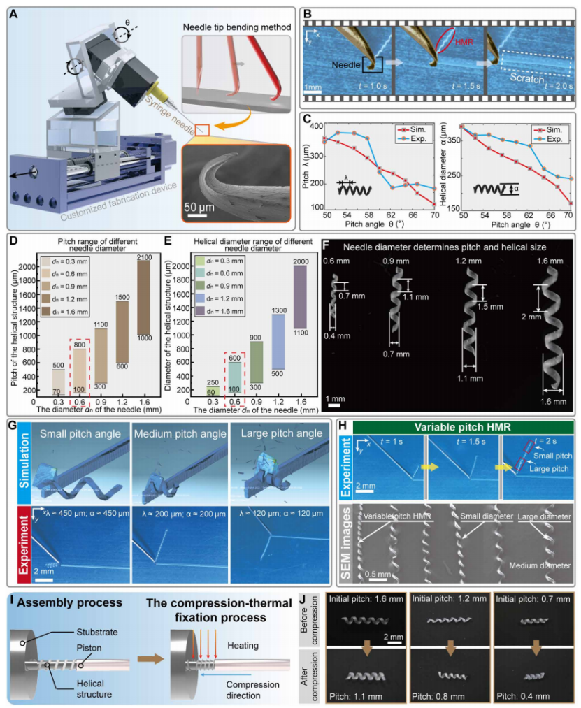 苏州大学孙立宁院士团队携手德国马普智能系统研究所Metin Sitti教授团队,开发出一种新型铁流体螺旋微型机器人(FHMR)。这项研究灵感来源于机械加工中的切屑形成过程,实现了成本低廉、可定制的机器人制造,并赋予其多模态运动能力,在靶向药物递送和血栓清除等领域展现巨大潜力。 图1.FHMR的制造与多模态运动原理示意图。(A)自动化制造设备及FHMR未配置前的概念示意图。(B)FHMR配置与重构流程的流程图。N表示磁铁北极,S代表磁铁南极,B指磁化过程中施加的外部磁场。(C)类OctoMag磁控系统实物图。(D)五种不同运动模式下的运动状态:长轴铁磁流体螺旋机器人(LFHR)旋转模式、LFHR摆动模式、短轴铁磁流体螺旋机器人(SFHR)滚动模式、SFHR摆动模式及SFHR上升模式。(E) SFHR在摆动模式下穿越并清除血栓。(F) SFHR以上升模式在三维血管中移动。(G) SFHR以倾斜角度在血管中滚动移动。(H) LFHR通过滚动与摆动模式穿越胃褶皱实现靶向给药。(I) LFHR采用摆动模式在靶点释放药物。 传统磁性螺旋机器人(MHR)制造往往复杂昂贵,依赖3D打印或生物模板,难以大规模定制。研究团队巧妙借鉴机械加工中切屑形成的原理,使用弯曲针尖在聚甲基丙烯酸甲酯(PMMA)基板上“雕刻”螺旋结构。这种方法简单高效,只需一个多自由度平台,就能控制针尖直径(0.6-1.6mm)和倾角(50°-70°),实现从微米到毫米级别的螺旋尺寸调节。后续通过铁流体(Fe3O4纳米粒子)附着和溶剂蒸发固化,还能重配置纳米粒子排列方向,形成长轴(LFHR)或短轴(SFHR)磁化机器人。 图2.螺旋针头制造与表征。(A)制造装置示意图包含三轴旋转式螺旋针头制造系统、针尖与基板之间的螺距角θ、弯曲针尖的制备工艺,以及扫描电镜(SEM)下的弯曲针尖结构示意图。(B)螺旋针头制造流程。(C)左图展示不同螺距角θ与螺旋针头螺距的关系,右图展示不同螺距角θ与螺旋针头螺纹直径的关系。子图展示了螺旋针头螺距与直径的示意图。(D)不同直径针头可实现的螺旋结构螺距范围。红色虚线表示实验中选用的0.6毫米针头直径。(E)不同直径针头可实现的螺旋结构直径范围。(F)不同针头制造不同螺距与螺旋直径的对比。在制造过程中,螺距角保持恒定。该图像使用×2倍放大率的微距相机拍摄(G)。图片展示了不同螺距和直径的HMR模拟与实验结果,涵盖小、中、大三种螺距角度。(H)HMR的制造过程包含显著变化的螺距与直径,以及不同直径和可变螺距制备的HMR的SEM图像。(I)通过压缩-热固定策略实现螺旋螺距的主动调控,流程图展示了从组装到最终结构成型的完整过程。(J)原始螺旋结构与压缩-热固定后结构的螺距变化对比。 图3.铁磁流体微机械谐振器(FHMR)配置全周期流程及不同磁化方向下的机器人性能表现。(A)FHMR配置与重构流程的流程图。(B)铁磁流体照片及纳米颗粒在铁磁流体中的扫描电镜成像结果。(C)室温下油基铁磁流体的磁滞回线。(D)铁磁流体与PMMA材料以1 m/s速度在1秒内滴落时的接触面积。(E)铁磁流体与PMMA的接触角。(F)表面形貌对比:未配置前铁磁流体存在随机凸起结构(红色虚线标记),配置后呈现有序链状结构。(G)模拟显示均匀磁场下铁磁流体中纳米颗粒形成链状结构。(H)旋转磁场下两个固定纳米颗粒的相互作用。(I)转矩诱导的纳米颗粒链旋转直至与磁场对齐。(J)2毫米FHMR长度与指尖尺寸的对比。(K)配置前螺旋结构的初始状态及0、3、6小时FHMR重构过程中的不同状态。h表示小时。(L)不同配置方法下FHMR在相同圆周旋转磁场中的运动反馈对比。(E)图中误差条为三次实验的标准差。 FHMR的最大亮点是多模态运动,通过OctoMag-like多向磁控系统,机器人可在圆锥形或圆形旋转磁场下切换5种模式: SFHR滚动模式:低阻力,适合坡道或推运物体(如清除关节腔杂质)。 SFHR摆动模式:高推进力,能穿越狭窄弯曲管道并清除模拟血栓。 SFHR上升模式:垂直爬升,克服粘稠环境(如血浆)中的3D障碍。 LFHR旋转模式:克服台阶,适应不平坦表面。 LFHR摆动模式:跨过折叠地形(如胃皱褶),并加速药物释放。 这些模式可组合使用,例如,在模拟3D血管中,FHMR先上升穿越垂直段,再摆动转弯,最后滚动坡道,最终清除血栓。实验证明,FHMR在粘度5 mPa·s的环境中稳定运动,轨迹误差仅0.5mm(仅为其长轴的1/4)。 图4. FHMR五种运动模式及轨迹。(A)SFHR与LFHR五种运动模式的概念示意图,包含SFHR滚动模式、SFHR摆动模式、SFHR上升模式、LFHR旋转模式及LFHR摆动模式的概念示意图。其中N表示磁流体动力学(MFR)运动时外部磁场的北极,S表示磁流体动力学(MFR)运动时外部磁场的南极。(B)五种运动模式的移动速度随电磁场频率变化的曲线图。图中蓝色区域代表低频段,绿色区域代表中频段,红色区域代表高频段。(C)通过闭环控制方式,采用五种不同运动模式对英文字符“ISUDA”进行实验跟踪的结果。(D)以S形轨迹为例,展示FHMR的轨迹位置误差结果及高斯分布拟合图。图(B)中的误差条为三次实验计算得出的标准差。 生物医学应用:靶向递药与血栓清除的未来 血栓清除:在S形管道中,SFHR摆动模式轻松钻透模拟血栓(石灰粉制成),结合3D导航,适用于复杂血管网络。 靶向药物递送:机器人表面负载率超60%,在猪肺或胃模型中,使用LFHR旋转模式快速抵达目标(最小药物泄漏),再切换摆动模式振动释放药物。针对腐蚀性环境(如胃酸),团队引入聚乙烯醇(PVA)缓释涂层,调节水:PVA比例(4:1~4:1.5),可将药物释放时间延长