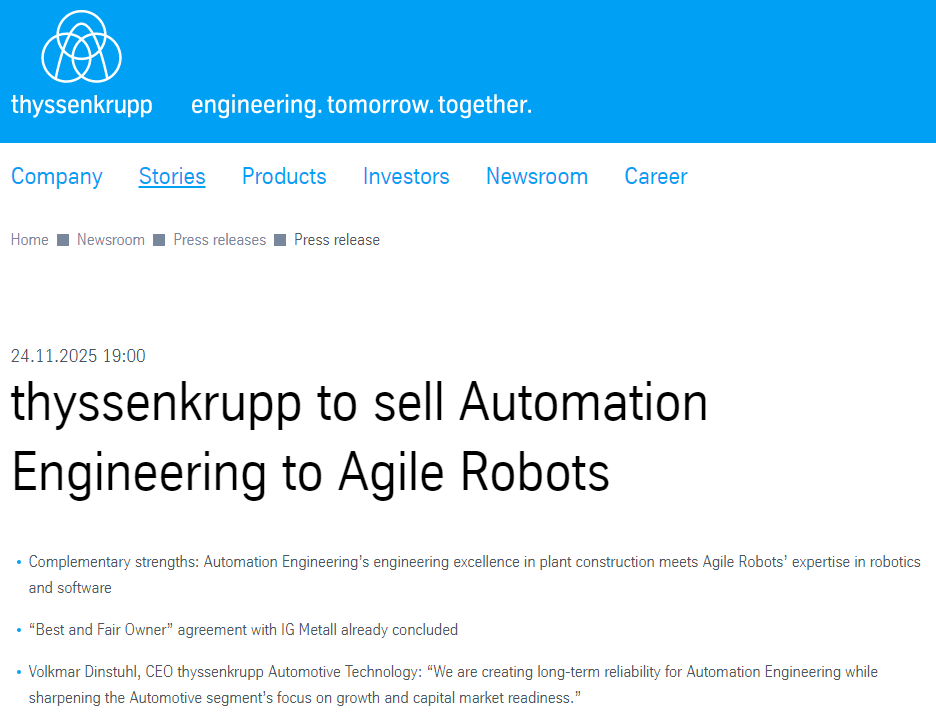 2025年11月24日,总部位于德国慕尼黑的智能机器人企业思灵机器人(Agile Robots SE)与蒂森克虏伯集团(thyssenkrupp)共同宣布,前者将收购蒂森克虏伯旗下自动化工程业务(Thyssenkrupp Automation Engineering)的欧洲及北美资产。该交易尚需通过相关国家监管机构审批,预计将在未来数月内完成交割,这一合作也被视为全球工业自动化领域转型期的重要动向。 作为一家从德国航空航天中心(DLR)分拆而生的科技企业,思灵机器人自2018年成立以来便保持高速增长态势。目前,公司员工规模已超2500人,成员来自全球约60个国家,2024年销售额达到约2亿欧元,且自成立起始终保持每年销售额翻倍的增长节奏。 就在此次收购宣布前,思灵机器人还推出了全尺寸工业级人形机器人Agile ONE——这款以物理人工智能为核心的装备,可实现与人类及其他自动化系统的安全协同,标志着其在工业规模化应用领域的技术突破。此外,思灵机器人在智能力控技术领域积累深厚,旗下Diana系列、Thor系列机器人及自主移动机器人(AMR)等产品,已覆盖汽车制造、3C电子等多个行业,客户包括宝马、小米汽车等知名企业。 此次被收购的蒂森克虏伯自动化工程业务,有着近80年的行业积淀。其前身为 1950年在德国不来梅成立的Johann A. Krause公司,最初以汽车行业机械制造为核心业务,迅速在欧洲市场站稳脚跟。1989年,该公司被Thyssen Industrie AG全资收购,并借此契机拓展北美市场,逐步成长为全球领先的自动化生产系统供应商,2024年销售额同样突破上亿欧元。长期以来,该业务聚焦汽车领域自动化解决方案,尤其在电动汽车驱动系统、电池组装生产线研发方面具备核心优势,与全球多家大型汽车制造商保持深度合作。收购完成后,该业务将以 “Krause Automation” 为品牌,在思灵机器人集团体系内独立运营。 从双方战略布局来看,此次收购呈现出鲜明的互补性。对于思灵机器人而言,此次交易不仅是技术与资源的 “双向补位”——一方面可补强自身在机械工程、工厂建设领域的专业能力,另一方面能借助蒂森克虏伯自动化工程的数十年行业经验,深化与汽车行业大型OEM厂商的合作;更意味着地理版图的重要拓展,新增的10个欧美业务站点及650名行业专家,将帮助其进一步渗透欧洲市场,并为扎根北美市场搭建关键支点。思灵机器人创始人兼 CEO 陈兆芃博士表示:“当前正是人工智能、机器人技术与工业专业知识深度融合的黄金阶段,物理人工智能有望为工业生产带来革命性的效率提升。收购蒂森克虏伯自动化工程业务,为我们提供了理想的能力互补,双方将从德国出发,共同推动下一轮工业革命的全球化落地。未来,我们还将重新定位该业务方向,探索更多细分市场的可能性。” 而对于蒂森克虏伯集团而言,此次出售是其汽车科技板块战略转型的关键一步。早在2025年7月,蒂森克虏伯汽车科技便公布业务整合计划,明确将聚焦底盘系统、汽车零部件、售后服务、锻造业务四大核心领域,通过深化客户合作与技术创新实现盈利增长。此次为自动化工程业务寻找新归宿,正是该战略的落地举措——通过产权变更为非核心业务探索新发展路径,同时集中资源强化核心板块的竞争力。蒂森克虏伯汽车科技CEO Volkmar Dinstuhl强调:“此次交易为自动化工程业务提供了长期发展的稳定性,同时也让汽车板块能更专注于核心业务的增长与资本市场准备工作。” 值得关注的是,为保障交易后业务平稳过渡,思灵机器人、蒂森克虏伯已提前与德国金属工业工会(IG Metall)达成 “优质公平所有者” 协议,为员工权益与业务整合搭建了可靠框架,确保员工代表能深度参与整合过程。此外,蒂森克虏伯位于德国不来梅、开姆尼茨/霍亨斯泰因-恩斯塔尔两地工厂的现有结构调整计划,将不受此次收购影响,继续按原时间表推进。 展望未来,双方计划在技术协同与业务拓展上双向发力。一方面,思灵机器人的端到端服务能力将得到显著提升——从工业机器人、自主移动机器人(AMR)到完整工厂的整合方案,形成覆盖 “硬件+软件+系统集成” 的全链条服务;另一方面,双方将联合开发模块化系统解决方案,探索自动化技术在电子制造、医疗设备生产等新领域的应用,打破蒂森克虏伯自动化工程此前以汽车行业为核心的业务局限。 正如蒂森克虏伯自动化工程CEO Rolf-Günther Nieberding博士所言:“我们将我们在工厂建设和项目开发方面的长期经验,以及我们在复杂流程、关键成功项目和全球客户结构方面的专业知识带入了一个代表德国未来的高速增长的企业里。凭借思灵机器人在机器人技术、软件和系统集成方面的创新以及我们的专业知识,我们可以为我们的共同客户创造有针对性的价值,并进一步支持思灵机器人集团的快速增长。” 思灵机器人希望通过此次收购扩大其在自动化解决方案领域的市场地位,并开拓新的增长领域。蒂森克虏伯自动化工程公司的技术专长、长期客户关系以及在国际汽车行业数十年的经验是此次收购的关键因素。 思灵机器人创始人兼首席执行官陈兆芃表示:“现在是将人工智能、机器人技术和工业专业知识结合起来的正确时机。物理人工智能为工业带来了巨大的生产力飞跃。通过收购蒂森克虏伯自动化工程公司,我们获得了完美的补充,共同推动下一次工业革命。而且这一切都是从德国开始的。” 文章来源:欧洲并购与投资、爱普搜Robot |
