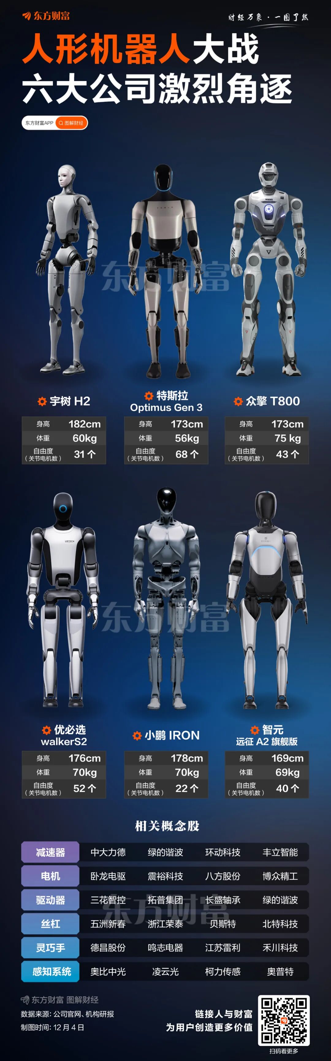 周四人形机器人概念大爆发,华伍股份、德马科技、骏亚科技、巨轮智能、睿能科技等多股涨停。机器人执行器、减速器等细分方向也涨停靠前。 消息面上,近期有关于人形机器人的利好新动态不断涌现。据中国基金报援引报道称,在发布加速人工智能发展计划五个月后,特朗普政府开始将目光转向机器人。此前,美国商务部长卢特尼克一直在与机器人行业的首席执行官们会面,并“全力以赴”加速该行业的发展。特朗普政府正在考虑明年发布一项关于机器人技术的行政令。 近期,众多机器人公司纷纷发布自己的最新产品,在互联网上频繁亮相。 12月3日特斯拉CEO马斯克在社交平台转发了特斯拉擎天柱(Optimus)团队发布的一段“擎天柱”人形机器人跑步的短视频。 12月2日,众擎机器人宣布,全尺寸极致高效能通用人形机器人众擎T800正式发布,产品发售进程也随即正式启动。 11月20日,吉尼斯世界纪录官方确认智元机器人远征A2 的106.29公里跨省行走挑战创造了全新的世界纪录。 11月12日,优必选宣布首批数百台WalkerS2工业人形机器人正式启动量产交付。 11月初小鹏人形机器人IRON正式发布。展示了其流畅的步态和拟人化设计。 更早之前的10月20日,宇树科技正式发布其最新人形机器人产品,官方为其命名为Unitree H2。 机构预测到2035年全球人形机器人市场规模将达510亿美元,年复合增长率约55%,出货量将从2030年的13.6万台激增至2035年的200多万台。 摩根士丹利最新研报显示,针对中国企业高管的人形机器人调研结果令人振奋:62%的受访企业计划在未来三年内部署人形机器人,市场潜力巨大。然而,仅有23%的受访者对当前产品表示满意,灵活性、功能性和价格仍是待突破的关键瓶颈。 东吴证券表示,具身智能仍是产业关注度最高的方向之一。政策层面,国家发改委强调对具身智能产业既要鼓励创新也要防范同质化竞争,指出当前企业数量快速上升、资本大量涌入背景下需警惕低水平重复建设。这一信号体现了政策对行业长期健康发展的重视,有利于资源向技术能力强、产业化路径清晰的企业集中,推动我国具身智能产业从单纯的概念热度迈向体系化建设。 |