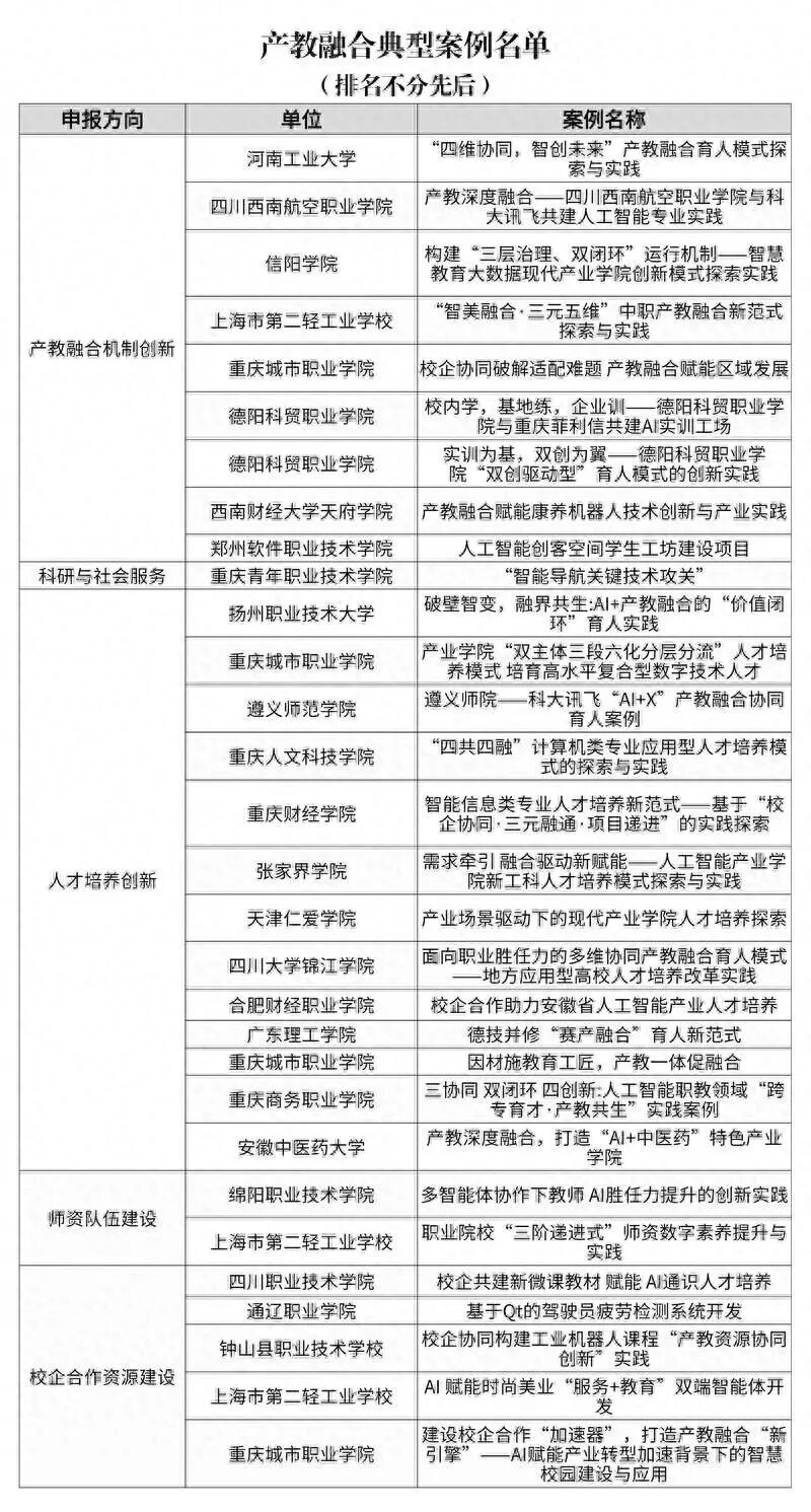 近日,全国人工智能行业产教融合共同体公布30家产教融合典型案例名单,覆盖“产教融合机制创新”“科研与社会服务”“人才培养创新”“师资队伍建设”“校企合作资源建设”五个方向,展现人工智能领域产教深度融合的多元实践与创新成果。 今年9月,科大讯飞股份有限公司、上海交通大学、重庆城市职业学院共同发起的全国人工智能行业产教融合共同体启动产教融合典型案例征集活动。经严格审查与联合评议,从156份申报案例中遴选出来自全国多家单位的30个典型案例,包括河南工业大学《“四维协同,智创未来”产教融合育人模式探索与实践》、四川大学锦江学院《面向职业胜任力的多维协同产教融合育人模式——地方应用型高校人才培养改革实践》等。 此次征集与评选活动旨在总结推广人工智能领域产教融合的先进经验,推动形成可复制、可借鉴的合作模式,为人工智能人才培养与行业创新注入新动力。全国人工智能行业产教融合共同体将继续发挥平台纽带作用,促进资源共享与机制创新,为我国人工智能产业生态持续健康发展提供坚实支撑。 案例名单公布。全国人工智能行业产教融合共同体供图 文章来源:中国青年报 |