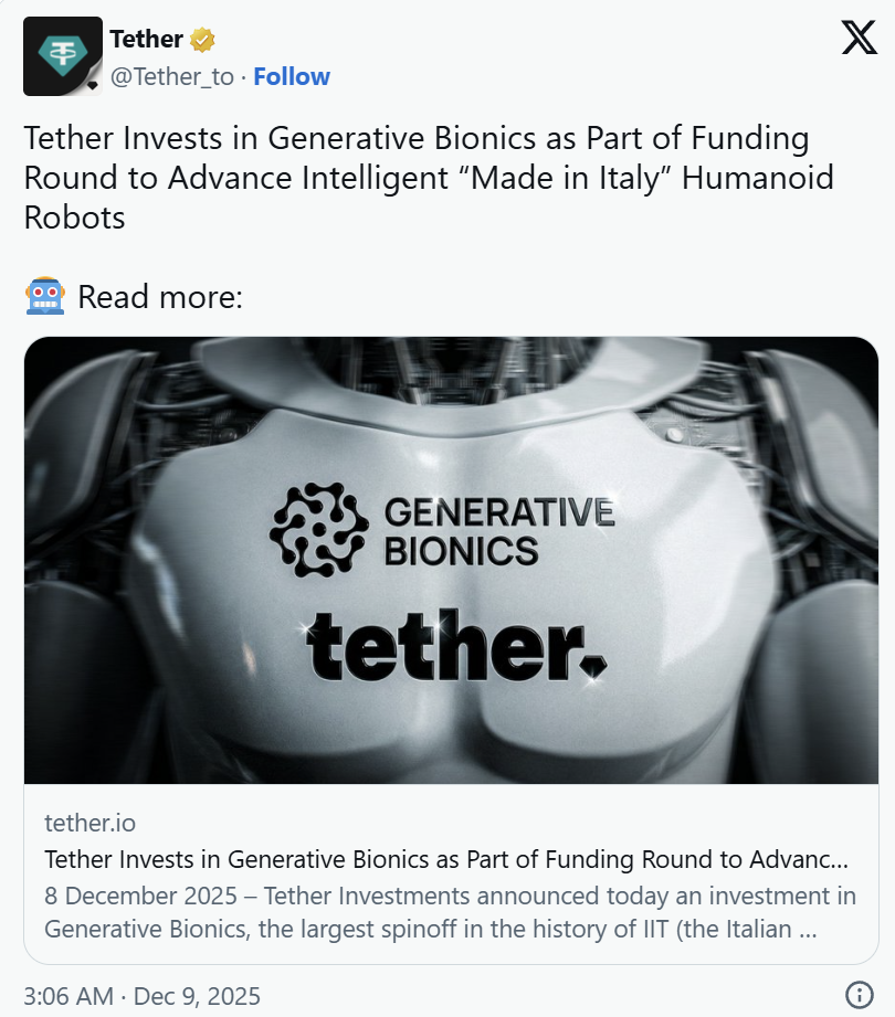 这家初创公司由首席执行官丹尼尔·普奇 (Daniele Pucci) 领导,他曾任意大利理工学院人工智能与机械智能系主任,也是iRonCub的创始人——iRonCub是一个独特的喷气式人形机器人研究项目。据该公司称,意大利理工学院的70名工程师加入了该公司,他们正致力于将这项研究成果转化为用于制造、物流、医疗保健和零售环境的商用机器人,将“意大利制造”的标签带入人形机器人市场。Generative Bionics的创始团队成员包括前IIT研究人员和高管Daniele Pucci、Alessio Del Bue、Marco Maggiali和Andrea PagninGenerative Bionics公司还表示,计划在2026年拉斯维加斯国际消费电子展(CES)上首次推出其首款完整的人形机器人。“我们的使命是构建一个未来,让智能人形机器人与人类每日协作,从而增强人类的认知和身体潜能,”Generative Bionics首席执行官兼联合创始人Daniele Pucci在一份声明中表示。“我们的物理人工智能使我们能够设计和制造仿生机器人,在多个应用领域创造切实价值。”Tether的投资将支持物理人工智能系统和边缘人工智能解决方案的开发。这笔资金还将有助于加速该公司人形机器人平台的产业验证。这笔资金将用于建设Generative Bionics的首个生产设施,并支持其融入更广泛的机器人生态系统。Generative Bionics计划于2026年初推出其首批可量产的人形机器人系统。该公司已确定了几个目标部署领域。这些行业包括制造业、物流业、医疗保健业和零售业。这些机器人被设计用于在专为人类工人设计的环境中运行。Tether首席执行官保罗·阿尔多伊诺(Paolo Ardoino)将这项投资描述为公司向支持数字和实体基础设施转型的一部分。他表示,公司旨在减少对大型科技公司控制的集中式系统的依赖。据Tether公司称,其投资重点领域包括五大板块:金融、能源、数据、教育和进化。像Generative Bionics这样的AI投资就属于进化板块。近几个月来,Tether在人工智能领域进行了多项投资。11月中旬,有报道称该公司正考虑以100亿美元的估值向德国人工智能机器人初创公司Neura投资11.5亿美元。这家稳定币发行方还通过Blackrock Neurotech投资了脑机接口技术。Tether近期与Northern Data和Rumble合作,部署了一个拥有2万个GPU的全球计算网络,用于人工智能开发。就在几周前,标普全球将USDT的稳定性评级下调至最低水平。该评级机构指出,Tether对比特币和其他投资的敞口不断增加,但披露信息有限。Tether否认了这一评估。内容来源:https://coincentral.com/tether-invests-in-81-million-funding-round-for-italian-humanoid-robot-maker/
