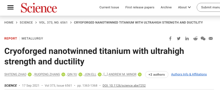 与此同时,这篇文章七彩绚烂的显微照片登上了同期《Science》的封面。具有纳米线结构的纯钛的假彩色显微照片,其中每种颜色代表具有相同结晶学方向的区域。纳米线状结构是通过在液氮中进行的多步骤低温锻压工艺产生的,然后在400℃下进行退火。因此,加工后的材料表现出超高的强度和延展性,特别是在低温下。